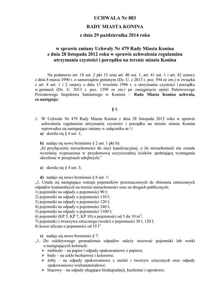 UCHWAŁA Nr 883 RADY MIASTA KONINA z dnia 29 października 2014 roku w sprawie zmiany Uchwały Nr 479 Rady Miasta Konina z dnia 28 listopada 2012 roku w sprawie uchwalenia regulaminu utrzymania czystości i porządku na terenie miasta Konina Na podstawie art. 18 ust. 2 pkt 15 oraz art. 40 ust. 1, art. 41 ust. 1 i art. 42 ustawy z dnia 8 marca 1990 r. o samorządzie gminnym (Dz. U. z 2013 r. poz. 594 ze zm.) w związku z art. 4 ust. 1 i 2 ustawy z dnia 13 września 1996 r. o utrzymaniu czystości i porządku w gminach (Dz. U. 2013 r. poz. 1399 ze zm.) po zasięgnięciu opinii Państwowego Powiatowego Inspektora Sanitarnego w Koninie – Rada Miasta Konina uchwala, co następuje: § 1. 1. W Uchwale Nr 479 Rady Miasta Konina z dnia 28 listopada 2012 roku w sprawie uchwalenia regulaminu utrzymania czystości i porządku na terenie miasta Konina wprowadza się następujące zmiany w załączniku nr 1: a) skreśla się § 4 ust. 1; b) nadaje się nowe brzmienie § 2 ust. 1 pkt b): „b) przyłączenie nieruchomości do sieci kanalizacyjnej, o ile nieruchomość nie została wcześniej wyposaŜona w przydomową oczyszczalnię ścieków spełniającą wymagania określone w przepisach odrębnych;” c) skreśla się § 4 ust. 3; d) nadaje się nowe brzmienie § 6 ust. 1: „1. Ustala się następujące rodzaje pojemników przeznaczonych do zbierania zmieszanych odpadów komunalnych na terenie nieruchomości oraz na drogach publicznych: 1) pojemniki na odpady o pojemności 90 l; 2) pojemniki na odpady o pojemności 110 l; 3) pojemniki na odpady o pojemności 120 l; 4) pojemniki na odpady o pojemności 240 l; 5) pojemniki na odpady o pojemności 1100 l; 6) pojemniki (KP 5, KP 7, KP 10) o pojemności od 5 do 10 m3; 7) pojemniki z tworzywa sztucznego (worki) o pojemności 30 l, 120 l; 8) kosze uliczne o pojemności od 35 l” e) nadaje się nowe brzmienie § 7: „1. Do selektywnego gromadzenia odpadów naleŜy stosować pojemniki lub worki o następujących kolorach: niebieski – na papier i odpady opakowaniowe z papieru; biały – na szkło bezbarwne i kolorowe; Ŝółty – na odpady opakowaniowe z metali i tworzyw sztucznych oraz odpady opakowaniowe wielomateriałowe; brązowy – na odpady ulegające biodegradacji, kuchenne i ogrodowe; 2 2. Zasady gromadzenia odpadów w workach i pojemnikach. 1) do pojemników i worków koloru niebieskiego – na papier i odpady opakowaniowe z papieru: WRZUCAMY m. in.: gazety, zeszyty, ulotki, ksiąŜki, katalogi, czasopisma, papierowe torby i worki, papier szkolny i biurowy, kartony i tekturę, opróŜnione opakowania z papieru, kartonu i tektury. NIE WRZUCAMY m. in.: kartonów i tektur pokrytych folią aluminiową (np. opakowania typu tetra pak po mleku, napojach), zabrudzonego i zatłuszczonego papieru (np. papierowe opakowania po maśle, margarynie, twarogu), kalki, celofanu, papieru termicznego i faksowego, tapet i worków po materiałach budowlanych (np. po cemencie, klejach), odpadów higienicznych (np. wacików, podpasek, pieluch). 2) do pojemników i worków koloru białego – na szkło bezbarwne i kolorowe: WRZUCAMY m. in.: butelki, słoiki szklane po napojach i Ŝywności, butelki po napojach alkoholowych, szklane opakowania po kosmetykach. NIE WRZUCAMY m. in.: szkła stołowego, Ŝaroodpornego, porcelany, fajansu i ceramiki, opakowań po lekach, szkła okularowego, luster i szyb okiennych, szyb samochodowych, Ŝarówek, lamp neonowych, fluorescencyjnych i rtęciowych, ekranów i lamp telewizyjnych, monitorów. 3) do pojemników i worków koloru Ŝółtego - na odpady opakowaniowe z metali i tworzyw sztucznych oraz odpady opakowaniowe wielomateriałowe: WRZUCAMY m. in.: puste butelki po napojach np. typu PET, po kosmetykach, środkach czystości i olejach spoŜywczych, opakowania plastikowe po Ŝywności (np. po jogurtach, serkach, margarynach), folie i torebki z tworzyw sztucznych, opakowania wielomateriałowe (np. kartoniki po napojach, mleku, Ŝywności), opakowania stalowe i aluminiowe (puszki po napojach, konserwach, dezodorantach, kapsle), drobny złom Ŝelazny i z metali kolorowych (np. narzędzia, zabawki). NIE WRZUCAMY m. in.: butelek po olejach samochodowych, silnikowych i smarach, puszek i pojemników po farbach i lakierach, gumy, styropianu, plastikowych zabawek, 3 opakowań po lekach, opakowań po środkach chwastobójczych i owadobójczych. 4) do pojemników i worków koloru brązowego - na odpady ulegające biodegradacji, kuchenne i ogrodowe: WRZUCAMY m. in.: odpady kuchenne, liście, trawę, kwiaty, resztki roślin ciętych i doniczkowych, drobne odpady z drewna i słomy. NIE WRZUCAMY m. in.: odpadów innych aniŜeli bioodpady i odpady zielone, kamieni, popiołu, ŜuŜlu, opakowań foliowych.” f) nadaje się nowe brzmienie § 12 ust. 1 pkt a): „1. Ustala się minimalną częstotliwość odbioru odpadów komunalnych z terenu nieruchomości oraz terenów przeznaczonych do wspólnego uŜytku publicznego: a) nieruchomości zamieszkałe w zabudowie jednorodzinnej: − zmieszane (niesegregowane) odpady komunalne – raz na tydzień; − odpady ulegające biodegradacji – dwa razy w miesiącu (w miesiącach I, II, III, XII) oraz cztery razy w miesiącu (w miesiącach IV, V, VI, VII, VIII, IX, X, XI); − papier i tektura, szkło – raz na miesiąc; − tworzywa sztuczne, metale, opakowania wielomateriałowe – raz na miesiąc (w miesiącach I, II, III, IV, X, XI XII) oraz raz na dwa tygodnie (w miesiącach V, VI, VII, VIII, IX); − zuŜyty sprzęt elektryczny i elektroniczny, meble i inne odpady wielkogabarytowe, zuŜyte opony – dwa razy w roku i wg potrzeb.” § 2. Wykonanie uchwały powierza się Prezydentowi Miasta Konina. § 3. Uchwała wchodzi w Ŝycie po upływie 14 dni od dnia ogłoszenia w Dzienniku Urzędowym Województwa Wielkopolskiego z mocą obowiązującą od 1 stycznia 2015 roku, z wyjątkiem § 1 ust. 1 pkt f, który wchodzi w Ŝycie z dniem 1 lipca 2015 r. Przewodniczący Rady Miasta Konina Wiesław Steinke