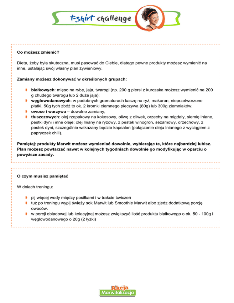 Co możesz zmienić? Dieta, żeby była skuteczna, musi pasować do Ciebie, dlatego pewne produkty możesz wymienić na inne, ustalając swój własny plan żywieniowy. Zamiany możesz dokonywać w określonych grupach: ➧ białkowych : mięso na rybę, jaja, twarogi (np. 200 g piersi z kurczaka możesz wymienić na 200 g chudego twarogu lub 2 duże jaja); ➧ węglowodanowych : w podobnych gramaturach kaszę na ryż, makaron, nieprzetworzone płatki, 50g tych zbóż to ok. 2 kromki ciemnego pieczywa (80g) lub 300g ziemniaków; ➧ owoce i warzywa – dowolne zamiany; ➧ tłuszczowych : olej rzepakowy na kokosowy, oliwę z oliwek, orzechy na migdały, siemię lniane, pestki dyni i inne oleje; olej lniany na ryżowy, z pestek winogron, sezamowy, orzechowy, z pestek dyni, szczególnie wskazany będzie kapsalen (połączenie oleju lnianego z wyciągiem z papryczek chili). Pamiętaj : produkty Marwit możesz wymieniać dowolnie, wybierając te, które najbardziej lubisz. Plan możesz powtarzać nawet w kolejnych tygodniach dowolnie go modyfikując w oparciu o powyższe zasady. O czym musisz pamiętać W dniach treningu: ➧ pij więcej wody między posiłkami i w trakcie ćwiczeń ➧ tuż po treningu wypij świeży sok Marwit lub Smoothie Marwit albo zjedz dodatkową porcję owoców. ➧ w porcji obiadowej lub kolacyjnej możesz zwiększyć ilość produktu białkowego o ok. 50 100g i węglowodanowego o 20g (2 łyżki) TYGODNIOWY PLAN POSIŁKÓW Dzień 36 Posiłek Składniki i przygotowanie Połączenia Śniadanie Owsianka z borówkami: 80g płatków owsianych zalej butelką świeżego soku Marwit (np. jabłkowego z czarną porzeczką), dodaj 3 łyżki żurawiny suszonej, posyp borówkami i posiekanymi prażonymi orzechami (30g). Czerwone owoce są źródłem wielu oksydantów, połączenie czarnej porzeczki z jabłkiem w postaci soku jest orzeźwiające i podkreśla smak innych składników potrawy. II śniadanie Bułka z twarogiem : bułka razowa (70g) z półtłustym twarogiem (100g) wymieszanym z łyżeczką oleju lnianego (10ml), startą rzodkiewką, łyżką jogurtu naturalnego. Olej lniany dostarcza kwasów omega3, które działają przeciwzapalnie w stanie dużego wysiłku. Można go łączyć np. z twarożkiem lub skrapiać pieczywo. Obiad Kociołek: przygotuj 50g dobrze namoczonej fasoli, kilka liści kapusty, 2 pokrojone w kostkę ziemniaki (300g), 50g chudej kiełbasy jałowcowej, 150g fileta z indyka (pokrojonego, doprawionego papryką wędzoną, solą, pieprzem ) układaj warstwami w garnku: fasolę, ziemniaki, mięso, po bokach kapustę, zalewaj zupą krem z pomidorów Marwit . Możesz potrawę urozmaicić marchewką, papryką, pieczarkami. Całość skrop 3 łyżkami oleju, i duś na małym ogniu przez ok. 2 godziny. Przygotuj porcję na 2 dni. To danie pozwoli przemycić dużą porcję warzyw! Przekąska Koktajl z kefiru naturalnego (200ml), mielonego siemienia lnianego (2 czubate łyżki), szklanki posiekanego melona i zielonego/białego o smoothie Marwit. Dodatek siemienia lnianego (źródła tłuszczu) poprawia wchłanianie witamin zawartych w owocach, oraz chroni mięśnie przed uszkodzeniami dzięki obecnym tu aminokwasom rozgałęzionym. Kolacja Sałatka z makaronem i jajkiem : garść mixu sałat Raz dwa trzy Marwit wymieszaj z kawałkami pomidorów, 4 łyżkami kukurydzy konserwowej, ugotowanym wystudzonym makaronem (gryczanym/ razowym/ orkiszowym, przed ugotowaniem 50g), na wierzchu ułóż ćwiartki 2 ugotowanych jaj i pokruszone 40g sera typu Feta. Skrop 1 łyżką oleju lub oliwy. Możesz od razu przygotować taką samą porcję na następny dzień. To pełnowartościowe danie pomoże uzupełnić białko, kwas foliowy, witaminę C i inne składniki na koniec dnia. Jadłospis dostarcza ok. 145g białka Dzień 37 Posiłek Składniki i przygotowanie Połączenia Śniadanie Kanapki z twarożkiem: 4 kromki chleba razowego (ok. 160g), posmaruj masłem (pół łyżeczki na kromkę), zjedz z twarożkiem (150g twarogu półtłustego, 1 łyżeczka oleju lnianego, 2 łyżki jogurtu naturalnego, warzywa). Razowe pieczywo dostarcza błonnika i witamin, zapobiega skokom poziom cukru, przez co w ciągu dnia energia uwalnia się stopniowo. Obecność twarożku i warzyw zmniejsza indeks glikemiczny całej potrawy. II śniadanie Batoniki zbożowe z II tygodnia diety , dowolne Smoothie Marwit. Zjedz 2 batoniki. Taki wielozbożowy baton świetnie może zastąpić owsiankę. Dostarcza magnezu, żelaza, fosforu, selenu, witamin z grupy B, które w połączeniu z witaminami ze świeżego soku sprawiają, że danie jest pełnowartościowe. Obiad Kociołek: przypominamy przepis z poprzedniego dnia: przygotuj 50g dobrze namoczonej fasoli, kilka liści kapusty, 2 pokrojone w kostkę ziemniaki (300g), 50g chudej kiełbasy jałowcowej, 150g fileta z indyka (pokrojonego, doprawionego papryką wędzoną, solą, pieprzem ) układaj warstwami w garnku: fasolę, ziemniaki, mięso, po bokach kapustę, zalewaj zupą krem z pomidorów Marwit . Możesz potrawę urozmaicić marchewką, papryką, pieczarkami. Całość skrop 3 łyżkami oleju i duś na małym ogniu przez ok. 2 godziny. Przygotuj porcję na 2 dni. To danie pozwoli przemycić dużą porcję warzyw! Przekąska Koktajl : zblenduj mango z sokiem pomarańczowym Marwit i z 200g jogurtu naturalnego, dodaj 2 łyżki mielonego siemienia lnianego. Taki koktajl pomaga świetnie zregenerować mięśnie po treningu! Kolacja Sałatka z makaronem i jajkiem : powtórzenie sałatki z poprzedniego dnia pomaga zaoszczędzić czas; przypominamy przepis: garść mixu sałat Raz dwa trzy Marwit wymieszaj z kawałkami pomidorów, 4 łyżkami kukurydzy konserwowej, ugotowanym wystudzonym makaronem (gryczanym/ razowym/ orkiszowym, przed ugotowaniem 50g), na wierzchu ułóż ćwiartki 2 ugotowanych jaj i pokruszone 40g sera typu Feta. Skrop 1 łyżką oleju lub oliwy. To pełnowartościowe danie pomoże uzupełnić białko, kwas foliowy, witaminę C i inne sk