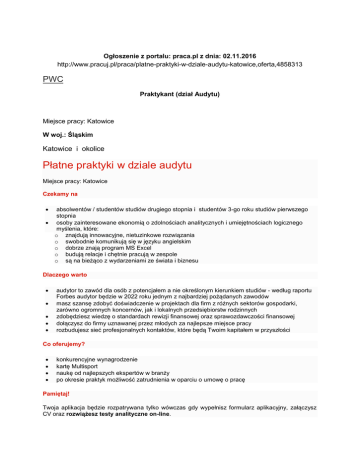 Ogłoszenie z portalu: praca.pl z dnia: 02.11.2016 http://www.pracuj.pl/praca/platne-praktyki-w-dziale-audytu-katowice,oferta,4858313 PWC Praktykant (dział Audytu) Miejsce pracy: Katowice W woj.: Śląskim Katowice i okolice Płatne praktyki w dziale audytu Miejsce pracy: Katowice Czekamy na absolwentów / studentów studiów drugiego stopnia i studentów 3-go roku studiów pierwszego stopnia osoby zainteresowane ekonomią o zdolnościach analitycznych i umiejętnościach logicznego myślenia, które: o znajdują innowacyjne, nietuzinkowe rozwiązania o swobodnie komunikują się w języku angielskim o dobrze znają program MS Excel o budują relacje i chętnie pracują w zespole o są na bieżąco z wydarzeniami ze świata i biznesu Dlaczego warto audytor to zawód dla osób z potencjałem a nie określonym kierunkiem studiów - według raportu Forbes audytor będzie w 2022 roku jednym z najbardziej pożądanych zawodów masz szansę zdobyć doświadczenie w projektach dla firm z różnych sektorów gospodarki, zarówno ogromnych koncernów, jak i lokalnych przedsiębiorstw rodzinnych zdobędziesz wiedzę o standardach rewizji finansowej oraz sprawozdawczości finansowej dołączysz do firmy uznawanej przez młodych za najlepsze miejsce pracy rozbudujesz sieć profesjonalnych kontaktów, które będą Twoim kapitałem w przyszłości Co oferujemy? konkurencyjne wynagrodzenie kartę Multisport naukę od najlepszych ekspertów w branży po okresie praktyk możliwość zatrudnienia w oparciu o umowę o pracę Pamiętaj! Twoja aplikacja będzie rozpatrywana tylko wówczas gdy wypełnisz formularz aplikacyjny, załączysz CV oraz rozwiążesz testy analityczne on-line. Zainteresowane osoby prosimy o składnie dokumentów poprzez „Aplikuj” Prosimy o dołączenie zgody na przetwarzanie danych osobowych PWC przeprowadzenia procesu rekrutacji. Uprzejmie informujemy, że skontaktujemy się tylko z wybranymi osobami. Aplikuj na stronie: https://www.pracuj.pl/aplikuj/Home/FirstStep?oid=4858313
