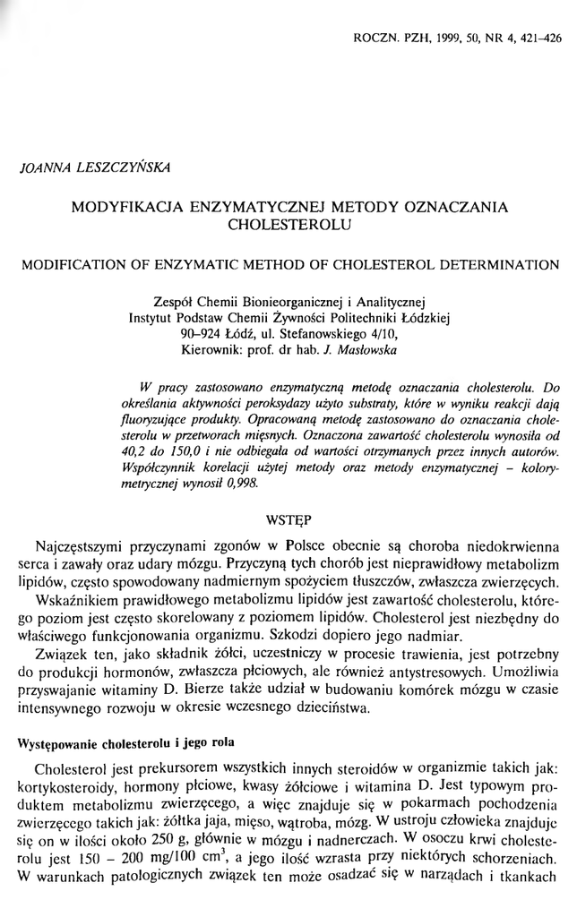 ROCZN. PZH, 1999, 50, N R 4, 421^126 JOANNA LESZC ZYŃ SK A M O D Y F IK A C JA E N Z Y M A T Y C Z N E J M E T O D Y O Z N A C Z A N IA CH O LESTERO LU M O DIFICATION O F EN ZY M A TIC M ETH OD O F CH O LESTERO L D E TER M IN A TIO N Zespół Chemii Bionieorganicznej i Analitycznej Instytut Podstaw Chemii Żywności Politechniki Łódzkiej 90-924 Łódź, ul. Stefanowskiego 4/10, Kierownik: prof. dr hab. J. Masłowska W pracy zastosowano enzymatyczną metodę oznaczania cholesterolu. Do określania aktywności peroksydazy użyto substraty, które w wyniku reakcji dają fluoryzujące produkty. Opracowaną metodę zastosowano do oznaczania chole sterolu w przetworach mięsnych. Oznaczona zawartość cholesterolu wynosiła od 40,2 do 150,0 i nie odbiegała od wartości otrzymanych przez innych autorów. Współczynnik korelacji użytej metody oraz metody enzymatycznej - kolory metrycznej wynosił 0,998. WSTĘP N ajczęstszym i przyczynam i zgonów w P olsce o b ec n ie są c h o ro b a n ie d o k rw ie n n a serca i zaw ały o raz u dary m ózgu. Przyczyną tych ch o ró b je st niepraw idłow y m e tab o lizm lipidów , często spow odow any nad m iern y m spożyciem tłuszczów , zw łaszcza zw ierzęcych. W sk aźn ikiem praw idłow ego m etabolizm u lipidów je st zaw arto ść ch o lestero lu , k tó r e go pozio m je st często skorelow any z p o ziom em lipidów . C h o leste ro l je st n iezb ęd n y do w łaściw ego fu n kcjonow ania organizm u. Szkodzi d o p ie ro je g o n ad m iar. Z w iązek ten, ja k o składnik żółci, uczestniczy w p ro ce sie traw ien ia, je s t p o trze b n y do p ro d u k cji horm o n ó w , zw łaszcza płciow ych, ale rów nież antystresow ych. U m ożliw ia przysw ajanie w itam iny D. B ierze tak że u dział w budo w an iu k o m ó rek m ózgu w czasie intensyw nego rozw oju w o k re sie w czesnego dzieciństw a. Występowanie cholesterolu i jego rola C h o le ste ro l je st p re k u rso re m wszystkich innych stero id ó w w o rg an izm ie takich jak: k o rty k o stero idy, h o rm o n y płciow e, kwasy żółciow e i w itam in a D. Je st typow ym p r o d u k te m m e tab o lizm u zw ierzęcego, a więc zn ajd u je się w p o k arm a ch p o c h o d z en ia zw ierzęcego takich jak: żó łtk a ja ja, m ięso, w ątro b a , m ózg. W u stro ju człow ieka z n a jd u je się on w ilości o k o ło 250 g, głów nie w m ózgu i n ad n erczach . W osoczu krwi c h o le ste rolu je st 150 - 200 m g /l00 cm 3, a je g o ilość w zrasta przy niek tó ry ch sc h o rz en ia ch . W w aru n k ac h patologicznych zw iązek ten m oże osadzać się w n arz ąd ac h i tk an k ach 422 J. Leszczyńska Nr 4 np. w p o staci kam ien i w przew odach żółciow ych o raz w ścian ach naczyń krw ionośnych przy m iażdżycy. Z a w a rto ść c h o le ste ro lu w e krwi nie pow inna p rzek raczać 200 m g/dl. O k o ło połow a c h o le ste ro lu w o rg an izm ie człow ieka p ochodzi z syntezy, a p o z o sta ła ilość je s t d o s ta r czana z pożyw ieniem . O k o ło 50% zsyntetyzow anego ch o lestero lu p o ch o d zi z w ątroby, 15% z je lit, a zn aczn a część ze skóry. W ciągu je d n e g o d n ia z org an izm u w ydala się o k o ło 1 g ch o lestero lu . P raw ie p o ło w a, p o p rze k szta łc en iu w kwasy żółciow e, je st w ydalana z kałem , p o z o sta ła część w p o sta ci o b o jętn y ch steroidów . Z n a c z n a część ch o lestero lu w y d alan a z żółcią je st p o n o w n ie w ch ła n ia n a w je lita ch , a n astę p n ie w ychw ytyw ana p rzez w ą tro b ę i p o n o w n ie w y d alan a z żółcią. Z jaw isko to je st z n a n e ja k o k rąż en ie je lito w o - w ątro b o w e. W celu o b n iż en ia zbyt w ysokiego p oziom u ch o lestero lu p o w in n a być sto so w a n a d ie ta n isk o c h o le stero lo w a, k tó ra zaw iera m ożliw ie ja k najw ięcej p ro d u k tó w bogaty ch w b ło n nik - pieczyw a razow ego, grubych kasz, roślin strączkow ych, w arzyw i ow oców . N ależy rów nież u n ik a ć stresów , a przynajm niej sta ra ć się go rozładow yw ać, re g u la rn ie upraw iać sp o rt. Metody wykrywania i oznaczania cholesterolu C h e m ic zn e m eto d y w ykryw ania i o zn aczan ia ch o lestero lu o p ie ra ją się za sad n iczo na dw óch reak cjach. P od w pływ em stężo n eg o kw asu siarkow ego d o ch o d zi d o o d ciąg n ięcia cząsteczek w ody. T w orzy się czerw ony kw as disulfonow y b ic h o lestiad ien u (odczyn Salkow skiego). W o b ecn ości kw asu siarkow ego i bezw odnika kw asu o ctow ego tw orzy się zielono zab arw io n y kw as m onosulfonow y b ic h o lestiad ien u (odczyn L ieberm anna-B urcharda). Ślady w ody u niem ożliw iają reak cję [11]. Z n a n e są ta k że m etody enzym atyczne z zastosow aniem esteraz y ch o lestero lo w ej, oksydazy i peroksydazy [4, 9]. C h o leste ro l o zn a cz an o tak że za p o m o c ą czujników enzym atycznych, skonstruow anych w o p arciu o e le k tro d ę tlen o w ą [5]. W o statn ich latach sto so w an e są rów nież m eto d y ch ro m a to g rafii gazow ej [1, 6, 8, 10], w tym także k ap ilarn ej [7] o ra z H P L C [2, 7]. C hociaż m etody ch ro m a to g raficz n e, ja k o d o k ład n iejsze i p ro stsze, są n ajb ard ziej p o le ca n e d o oznaczan ia ch o lestero lu , to ró w n ież m eto d y enzy m aty czne są czułe, precyzyjne i nie w ym agają drogiej ap a ratu ry . Enzymatyczna metoda oznaczania cholesterolu 423 Inten sy w ność cz erw onego zabarw ienia o trzym anej p o ch o d n e j je st p ro p o rc jo n a ln a d o stężenia ch o lestero lu . D o po m iaró w fluorym etrycznych używ ano sp e k tro flu o ry m e tr firmy H itachi. Z a sto so w an a m odyfikacja m etody niniejszej pracy poleg a n a użyciu fluoryzujących substratów dla peroksydazy. CZĘŚĆ DOŚW IADCZALNA Odczynniki i roztwory Część odczynników pochodziła z zestawu do oznaczania cholesterolu firmy Aqua-med (Łódź), który zawiera: odczyn