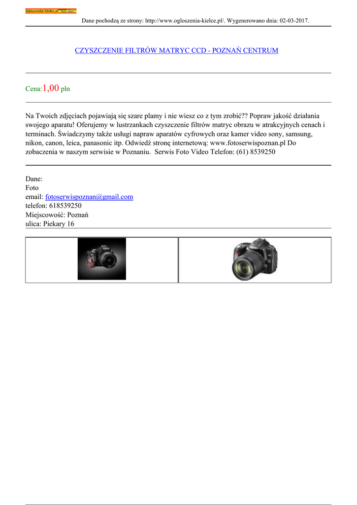 Dane pochodzą ze strony: http://www.ogloszenia-kielce.pl/. Wygenerowano dnia: 02-03-2017. CZYSZCZENIE FILTRÓW MATRYC CCD - POZNAŃ CENTRUM Cena:1,00 pln Na Twoich zdjęciach pojawiają się szare plamy i nie wiesz co z tym zrobić?? Popraw jakość działania swojego aparatu! Oferujemy w lustrzankach czyszczenie filtrów matryc obrazu w atrakcyjnych cenach i terminach. Świadczymy także usługi napraw aparatów cyfrowych oraz kamer video sony, samsung, nikon, canon, leica, panasonic itp. Odwiedź stronę internetową: www.fotoserwispoznan.pl Do zobaczenia w naszym serwisie w Poznaniu. Serwis Foto Video Telefon: (61) 8539250 Dane: Foto email: [email protected] telefon: 618539250 Miejscowość: Poznań ulica: Piekary 16
