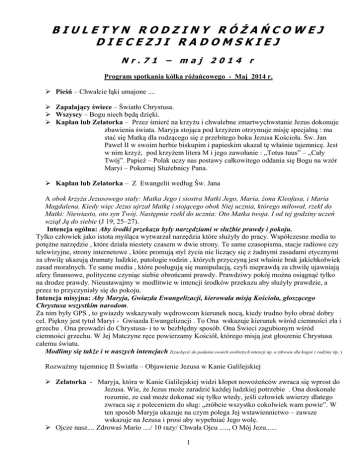 BIULETYN RODZINY RÓŻAŃCOWEJ DIECEZJI RADOMSKIEJ Nr.71 – maj 2014 r Program spotkania kółka różańcowego - Maj 2014 r. Pieśń – Chwalcie łąki umajone .... Zapalający świece – Światło Chrystusa. Wszyscy – Bogu niech będą dzięki. Kapłan lub Zelatorka – Przez śmierć na krzyżu i chwalebne zmartwychwstanie Jezus dokonuje zbawienia świata. Maryja stojąca pod krzyżem otrzymuje misję specjalną : ma stać się Matką dla rodzącego się z przebitego boku Jezusa Kościoła. Św. Jan Paweł II w swoim herbie biskupim i papieskim ukazał tę właśnie tajemnicę. Jest w nim krzyż, pod krzyżem litera M i jego zawołanie : „Totus tuus” – „Cały Twój”. Papież – Polak uczy nas postawy całkowitego oddania się Bogu na wzór Maryi – Pokornej Służebnicy Pana. Kapłan lub Zelatorka – Z Ewangelii według Św. Jana A obok krzyża Jezusowego stały: Matka Jego i siostra Matki Jego, Maria, żona Kleofasa, i Maria Magdalena. Kiedy więc Jezus ujrzał Matkę i stojącego obok Niej ucznia, którego miłował, rzekł do Matki: Niewiasto, oto syn Twój. Następnie rzekł do ucznia: Oto Matka twoja. I od tej godziny uczeń wziął Ją do siebie (J 19, 25–27). Intencja ogólna: Aby środki przekazu były narzędziami w służbie prawdy i pokoju. Tylko człowiek jako istota myśląca wytwarzał narzędzia które służyły do pracy. Współczesne media to potężne narzędzie , które działa niestety czasem w dwie strony. Te same czasopisma, stacje radiowe czy telewizyjne, strony internetowe , które promują styl życia nie liczący się z żadnymi zasadami etycznymi za chwilę ukazują dramaty ludzkie, patologie rodzin , których przyczyną jest właśnie brak jakichkolwiek zasad moralnych. Te same media , które posługują się manipulacją, czyli nieprawdą za chwilę ujawniają afery finansowe, polityczne czyniąc siebie obrońcami prawdy. Prawdziwy pokój można osiągnąć tylko na drodze prawdy. Nieustawajmy w modlitwie w intencji środków przekazu aby służyły prawdzie, a przez to przyczyniały się do pokoju. Intencja misyjna: Aby Maryja, Gwiazda Ewangelizacji, kierowała misją Kościoła, głoszącego Chrystusa wszystkim narodom. Za nim były GPS , to gwiazdy wskazywały wędrowcom kierunek nocą, kiedy trudno było obrać dobry cel. Piękny jest tytuł Maryi - Gwiazda Ewangelizacji . To Ona wskazuje kierunek wśród ciemności zła i grzechu . Ona prowadzi do Chrystusa- i to w bezbłędny sposób. Ona Świeci zagubionym wśród ciemności grzechu. W Jej Matczyne ręce powierzamy Kościół, którego misją jest głoszenie Chrystusa całemu światu. Modlimy się także i w naszych intencjach :(zachęcić do podania swoich osobistych intencji np. o zdrowie dla kogoś z rodziny itp. ) Rozważmy tajemnicę II Światła – Objawienie Jezusa w Kanie Galilejskiej Zelatorka - Maryja, która w Kanie Galilejskiej widzi kłopot nowożeńców zwraca się wprost do Jezusa. Wie, że Jezus może zaradzić każdej ludzkiej potrzebie . Ona doskonale rozumie, ze cud może dokonać się tylko wtedy, jeśli człowiek uwierzy dlatego zwraca się z poleceniem do sług: „zróbcie wszystko cokolwiek wam powie”. W ten sposób Maryja ukazuje na czym polega Jej wstawiennictwo – zawsze wskazuje na Jezusa i prosi aby wypełniać Jego wolę. Ojcze nasz.... Zdrowaś Mario ..../ 10 razy/ Chwała Ojcu ....., O Mój Jezu...... 1 Królowo Różańca Św. – módl się za namiZa zmarłych członków..................... Wieczny odpoczynek........... Konferencja –prowadzi kapłan lub Zelatorka Ofiarowanie w świątyni Maryja i Józef nie mieli najmniejszych wątpliwości co do konieczności wypełnienia Prawa. Ich posłuszeństwo nakazom Starego Przymierza zawierało w sobie coś więcej niż legalizm. Dając prowadzić się Duchowi Świętemu sprawili, że na ich rękach Pan przybył do swojej świątyni i było to niezwykłe przybycie, bo w słabości dziecka. Pan zaś przybył nie w celu dokonania sądu nad tymi, którzy nie przestrzegali prawa, ale po to, aby poddać się posłuszeństwu wobec Ojca. Dlatego na początku publicznej działalności, w czasie Kazanie na Górze, Jezus powie, że nie przyszedł, aby znieść Prawo albo Proroków, lecz żeby je wypełnić (Mt 5,17). Posłuszeństwo Prawu i Duchowi Świętemu, które wypełniało życie Maryi i Józefa okazało się błogosławieństwem dla innych. To dzięki niemu Symeon i Anna mogli zobaczyć oczekiwanego Mesjasza. Symeon, którego imię oznacza „Bóg wysłuchał”, doczekał w swoim wiernym trwaniu chwili, gdy mógł wziąć w objęcia Dziecię i poczuć, że jego życie naznaczone oczekiwaniem dobiega szczęśliwego końca. Ale pragnienie ujrzenia Zbawiciela, jakie było w tym sprawiedliwym i pobożnym człowieku towarzyszy wszystkim ludziom dobrej woli. Grecy, którzy przybyli do Jerozolimy z pielgrzymką paschalną powiedzieli do apostoła Filipa: „Chcemy ujrzeć Jezusa” (J 12,21) Każdy kto pragnie odnaleźć Prawdę, Dobro, Piękno, Drogę, Życie ostatecznie poszukuje Jezusa Chrystusa. Gdy kończył się Jubileusz Roku 2000 św. Jan Paweł II napisał, że nie trzeba wyszukiwać programu na nowe tysiąclecie chrześcijaństwa. Program już istnieje, ciągle i niezmiennie ten sam, a jest nim poznawanie, kochanie i naśladowanie Jezusa (NMI 29). Proces ten rozpoczyna się od kontemplacji oblicza Syna Bożego. Natomiast pełna kontemplacja naszego Zbawiciela zawiera w sobie wpatrywanie się i w oblicze cierpiące i oblicze Zmartwychwstałego. W tej postawie upodabniamy się do Maryi, zawsze obecnej przy Synu. Starzec Symeon powiedział do Maryi: „ … a Twoją duszę miecz przeniknie, aby na jaw wyszły zamysły serc wielu” (Łk 2,35). Miecz w Biblii jest symbolem słowa Bożego. Opierając się na licznych komentarzach możemy powiedzieć, że terminu „miecz” z proroctwa Symeona nie można ograniczać tylko do współcierpienia Maryi pod krzyżem. Wprawdzie proroctwo to osiągnęło s