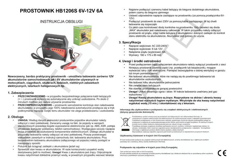 PROSTOWNIK HB1206S 6V-12V 6A • • INSTRUKCJA OBSŁUGI • • Najpierw podłączyć czerwony kabel ładujący do bieguna dodatniego akumulatora, potem czarny do bieguna ujemnego Ustawić odpowiednie napięcie zasilające na prostowniku (za pomocą przełącznika 6V12V) Podłączyć prostownik do sieci 230V za pomocą kabla zasilającego. W tej chwili ładowanie się rozpoczęło Co jakiś czas kontrolować diody kontrolne na prostowniku. Gdy zaświeci się dioda „MAX” akumulator jest naładowany całkowicie. W takim przypadku należy odłączyć prostownik od prądu, zdjąć kable ładujące z akumulatora i dokręcić zaślepki do kontroli stanu elektrolitu na akumulatorze. Akumulator jest gotowy do użycia. 3. Specyfikacja • • • • Napięcie wejściowe: AC 220-240V Napięcie wyjściowe: 6 lub 12V Natężenie prądu (wyjściowe): 6A Wymiary: 160 x 175 x 85 mm 4. Uwagi i środki ostrożności • • Nowoczesny, bardzo praktyczny prostownik - umożliwia ładowanie zarówno 12V akumulatorów samochodowych jak i 6V akumulatorów używanych w motocyklach, ciągnikach, skuterach, łodziach, niektórych zabawkach elektrycznych, latarkach halogenowych itp. 1. Zabezpieczenia • • PRZECIWZWARCIOWE– w przypadku bezpośredniego połączenia kabli ładujących (+ i -) prostownik wyłączy się automatycznie aby uniknąć uszkodzenia. Po około 2 minutach możliwe jest dalsze używanie prostownika PRZECIWPRZECIĄŻENIOWE – prostownik samodzielnie kontroluje stan naładowania akumulatora i w przypadku jego 100% naładowania automatycznie przełącza się w tryb podtrzymania napięcia. Dzięki temu akumulator nie ulega przeładowaniu i uszkodzeniu 2. Obsługa • • • UWAGA: Według danych większości producentów pojazdów akumulator należy odłączyć z sieci pokładowej. Zwracamy uwagę na fakt, że pojazdy w wersjach standardowych posiadają bogate wyposażenie elektroniczne (jak np. ABS, ASR, pompa wtryskowa, komputer pokładowy, telefon samochodowy). Występujące szczyty napięcia mogą prowadzić do uszkodzenia komponentów elektronicznych. Dlatego akumulator w przypadku ładowania należy odłączyć od sieci pokładowej. Proszę przestrzegać wskazówek zawartych w instrukcji samochodu dot. ładowania akumulatora. Przy bezpośrednim ładowaniu akumulatora (odłączonego od pojazdu) należy postąpić w następujący sposób: Poluźnić lub ściągnąć zaślepki z akumulatora (jeżeli są) Sprawdzić stan kwasu w akumulatorze. W razie konieczności uzupełnić wodą destylowaną (jeśli to możliwe). Uwaga! Kwas z akumulatora jest żrący. Odpryśnięcie kwasu natychmiast dokładnie przemyć wodą, w poważnym przypadku wezwać lekarza • • • • • • Przed podłączeniem bądź odłączeniem akumulatora należy wyłączyć prostownik z sieci Niniejszy prostownik zawiera części (np. przełącznik lub bezpiecznik), mogące wytwarzać iskry i łuki elektryczne. Pamiętać bezwzględnie o dobrej wentylacji w garażu lub innym pomieszczeniu! Nie ładować akumulatorów, które nie nadają się do powtórnego ładowania lub akumulatorów uszkodzonych Nie ładować kilku akumulatorów jednocześnie Nie zwierać klem ładujących Nie stawiać prostownika na gorącej powierzchni Uwaga! Unikać otwartego ognia i iskier. W trakcie ładowania uwalniany jest gaz wybuchowy Uwaga! Kwasy akumulatora są żrące. Rozpryskane na skórze i ubraniu kwasy natychmiast wyczyścić ługiem mydlanym. Wtryśnięte do oka kwasy natychmiast wypłukać wodą (15 min.) i skontaktować się z lekarzem.