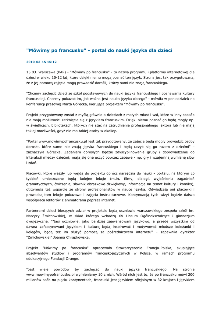 "Mówimy po francusku" - portal do nauki języka dla dzieci 2010-03-15 15:12 15.03. Warszawa (PAP) - "Mówimy po francusku" - to nazwa programu i platformy internetowej dla dzieci w wieku 10-12 lat, które dzięki niemu mogą poznać ten język. Strona jest tak przygotowana, że z jej pomocą zajęcia mogą prowadzić dorośli, którzy sami nie znają francuskiego. "Chcemy zachęcić dzieci ze szkół podstawowych do nauki języka francuskiego i poznawania kultury francuskiej. Chcemy pokazać im, jak ważna jest nauka języka obcego" - mówiła w poniedziałek na konferencji prasowej Marta Górecka, kierująca projektem "Mówimy po francusku". Projekt przygotowany został z myślą głównie o dzieciach z małych miast i wsi, które w inny sposób nie mają możliwości zetknięcia się z językiem francuskim. Dzięki niemu poznać go będą mogły np. w świetlicach, bibliotekach, których nie stać na zatrudnienie profesjonalnego lektora lub nie mają takiej możliwości, gdyż nie ma takiej osoby w okolicy. "Portal www.mowimypofrancusku.pl jest tak przygotowany, że zajęcia będą mogły prowadzić osoby dorosłe, które same nie znają języka francuskiego i będą uczyć się go razem z dziećmi" zaznaczyła Górecka. Zadaniem dorosłych będzie zdyscyplinowanie grupy i doprowadzenie do interakcji miedzy dziećmi; mają się one uczyć poprzez zabawę - np. gry i wzajemną wymianę słów i zdań. Placówki, które weszły lub wejdą do projektu oprócz narzędzia do nauki - portalu, na którym co tydzień umieszczane będą kolejne lekcje (m.in. filmy, dialogi, wyjaśnienia zagadnień gramatycznych, ćwiczenia, słownik obrazkowo-dźwiękowy, informacje na temat kultury i komiks), otrzymują też wsparcie ze strony profesjonalistów w nauce języka. Odwiedzają oni placówki i prowadzą tam lekcje pokazowe i zajęcia instruktarzowe. Kontynuacją tych wizyt będzie dalsza współpraca lektorów z animatorami poprzez internet. Partnerami dzieci biorących udział w projekcie będą uczniowie warszawskiego zespołu szkół im. Narcyzy Żmichowskiej, w skład którego wchodzą XV Liceum Ogólnokształcące i gimnazjum dwujęzyczne. "Nasi uczniowie, jako bardziej zaawansowani językowo, a przede wszystkim od dawna zafascynowani językiem i kulturą będą inspirować i motywować młodsze koleżanki i kolegów, będą też im służyć pomocą za pośrednictwem internetu" - zapewniła dyrektor "Żmichowskiej" Joanna Chrapkowska. Projekt "Mówimy absolwentów po studiów francusku" i programów opracowało Stowarzyszenie francuskojęzycznych w Francja-Polska, Polsce, w skupiające ramach programu edukacyjnego Fundacji Orange. "Jest wiele powodów by zachęcać do nauki języka francuskiego. Na stronie www.mowimypofrancusku.pl wymieniamy 10 z nich. Wśród nich jest to, że po francusku mówi 200 milionów osób na pięciu kontynentach, francuski jest językiem oficjalnym w 32 krajach i językiem mówionym w kilkunastu innych. Po francusku można również mówić w Polsce - najwięksi inwestorzy w naszym kraju to firmy francuskie. Francuski jest też drugim najczęściej używanym językiem w internecie" - podkreślił Adam Sankowski ze Stowarzyszenia Francja-Polska. Z ostatniego raportu Centralnego Ośrodka Doskonalenia Nauczycieli dotyczącego nauki języków obcych wynika, że w roku szkolnym 2008/2009 najpopularniejszym językiem obcym w szkołach (brano pod uwagę język nauczany zarówno jako obowiązkowy, jak i jako dodatkowy) był angielski uczyło się go 90 proc. uczniów, na drugim miejscu znalazł się niemiecki (42,5 proc.), na trzecim rosyjski (4,3 proc.). Francuski zajął czwartą pozycję z wynikiem 3,5 proc. uczniów. (PAP) dsr/ ls/ jra/