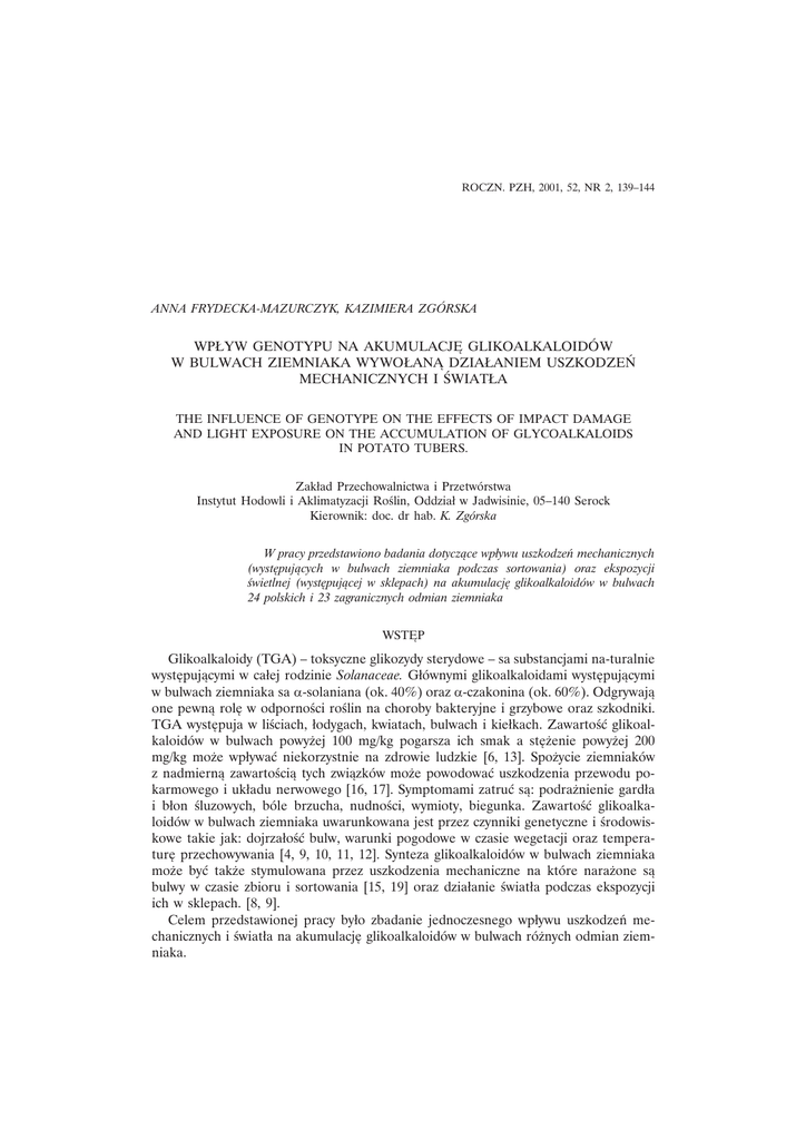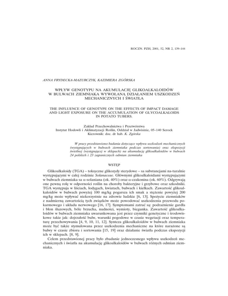 ROCZN. PZH, 2001, 52, NR 2, 139–144 ANNA FRYDECKA-MAZURCZYK, KAZIMIERA ZGÓRSKA WPŁYW GENOTYPU NA AKUMULACJĘ GLIKOALKALOIDÓW W BULWACH ZIEMNIAKA WYWOŁANĄ DZIAŁANIEM USZKODZEŃ MECHANICZNYCH I ŚWIATŁA THE INFLUENCE OF GENOTYPE ON THE EFFECTS OF IMPACT DAMAGE AND LIGHT EXPOSURE ON THE ACCUMULATION OF GLYCOALKALOIDS IN POTATO TUBERS. Zakład Przechowalnictwa i Przetwórstwa Instytut Hodowli i Aklimatyzacji Roślin, Oddział w Jadwisinie, 05–140 Serock Kierownik: doc. dr hab. K. Zgórska W pracy przedstawiono badania dotyczące wpływu uszkodzeń mechanicznych (występujących w bulwach ziemniaka podczas sortowania) oraz ekspozycji świetlnej (występującej w sklepach) na akumulację glikoalkaloidów w bulwach 24 polskich i 23 zagranicznych odmian ziemniaka WSTĘP Glikoalkaloidy (TGA) – toksyczne glikozydy sterydowe – sa substancjami na-turalnie występującymi w całej rodzinie Solanaceae. Głównymi glikoalkaloidami występującymi w bulwach ziemniaka sa α-solaniana (ok. 40%) oraz α-czakonina (ok. 60%). Odgrywają one pewną rolę w odporności roślin na choroby bakteryjne i grzybowe oraz szkodniki. TGA występuja w liściach, łodygach, kwiatach, bulwach i kiełkach. Zawartość glikoalkaloidów w bulwach powyżej 100 mg/kg pogarsza ich smak a stężenie powyżej 200 mg/kg może wpływać niekorzystnie na zdrowie ludzkie [6, 13]. Spożycie ziemniaków z nadmierną zawartością tych związków może powodować uszkodzenia przewodu pokarmowego i układu nerwowego [16, 17]. Symptomami zatruć są: podrażnienie gardła i błon śluzowych, bóle brzucha, nudności, wymioty, biegunka. Zawartość glikoalkaloidów w bulwach ziemniaka uwarunkowana jest przez czynniki genetyczne i środowiskowe takie jak: dojrzałość bulw, warunki pogodowe w czasie wegetacji oraz temperaturę przechowywania [4, 9, 10, 11, 12]. Synteza glikoalkaloidów w bulwach ziemniaka może być także stymulowana przez uszkodzenia mechaniczne na które narażone są bulwy w czasie zbioru i sortowania [15, 19] oraz działanie światła podczas ekspozycji ich w sklepach. [8, 9]. Celem przedstawionej pracy było zbadanie jednoczesnego wpływu uszkodzeń mechanicznych i światła na akumulację glikoalkaloidów w bulwach różnych odmian ziemniaka. 140 A. Frydecka-Mazurczyk, K. Zgórska Nr 2 MATERIAŁ I METODY Badania przeprowadzono na 24 odmianach polskiej i 23 zachodnioeuropejskiej hodowli ziemniaka. Bulwy zebrane w stanie dojrzałym przechowywano w ciemności w przechowalni doświadczalnej w temperaturze 8oC przez okres 3 miesięcy. Oznaczenia glikoalkaloidów dokonano bezpośrednio po wyjęciu prób z przechowalni oraz po uszkodzeniu bulw przy pomocy bębna obrotowego powodującego uszkodzenia podobne do występujących na linii sortowniczej i poddaniu ich tygodniowej ekspozycji pod 15W lampą fluoroscencyjną symulującą oświetlenie występujące w supermarketach (gęstość strumienia fotonów 13 µmol m-2s-1). Zawartość glikoalkaloidów oznaczano metodą spektrofotometryczną z kwasem ortofosforowym [1] WYNIKI Przeprowadzone badania wykazały, że zawartość glikoalkaloidów w bulwach ziemniaka oraz ich akumulacja pod wpływem uszkodzeń mechanicznych i światła zależała od odmiany (tab. I i II). Badane odmiany podzielono na trzy grupy różniące się poziomem glikoalkaloidów. Do grupy o niskim stężeniu TGA (do 50 mg/kg świeżej masy) zaliczono następujące polskie odmiany: Irga, Grot, Muza, Mila, Baszta, Tokaj oraz zagraniczne: Satina, Ditta, Gloria, Victoria i Redstar. W bulwach tych odmian zaobserwowano najniższy przyrost glikoalkaloidów pod wpływem zastosowanych w doświadczeniu czynników stresowych (od 28 do 48 mg/kg). Większość badanych odmian zawierała średni poziom glikoalkaloidów (51–100 mg/kg) a akumulacja TGA w bulwach wywołana działaniem uszkodzeń mechanicznych i światła spowodowała wyższą syntezę tych związków w bulwach (od 34 do 113 mg/kg świeżej masy). Najwyższą zawartością glikoalkaloidów cechowały się odmiany zagraniczne tj. Santana, Columbus, Albatros i Peppo (powyżej 100 mg/kg). Reagowały one bardzo intensywną akumulacją TGA na zastosowane w doświadczeniu warunki stresowe. Pod wpływem uszkodzeń mechanicznych i tygodniowej ekspozycji świetlnej, zawartość tych związków w bulwach zwiększyła się od 120 do 180 mg/kg znacznie przekraczając dopuszczalną dla ziemniaków wartość 200 mg/kg (np. odmiana Peppo – 365 mg/kg świeżej masy). Znacznie mniejsze nagromadzenie TGA pod wpływem zastosowanych czynników zaobserwowano w bulwach polskich odmian. Najwyższą zawartość tych związków (powyżej 100 mg/kg) stwierdzono u odmian Cykada, Balbina, Albina i Orłan. Przyrost TGA spowodowany działaniem uszkodzeń występujących podczas sortowania i światła wynosił od 68 do 80 mg/kg, tak że poziom tych związków w bulwach nie przekraczał 200 mg/kg świeżej masy. Stwierdzono istotną korelację pomiędzy wyjściową zawartością glikoalkaloidów w bulwach nieuszkodzonych przechowywanych w ciemności, a przyrostem stężenia TGA pod wpływem uszkodzeń mechanicznych i działania światła. Współczynnik korelacji wynosił 0,883 w przypadku odmian zagranicznych i 0,657 w przypadku odmian polskich. Nr 2 Tabela I. 141 Akumulacja glikoalkalidów w bulwach ziemniaka Wpływ uszkodzeń mechanicznych i światła na akumulację glikoalkaloidów w bulwach ziemniaka – odmiany polskie The influence of mechanical damage and light exposure on glycoalkaloid accumulation in potato tubers – Polish varieties Bulwy Odmiany niska zawartość Irga Nieuszkodzone + ciemność Uszkodzone + światło Przyrost TGA spowodowany uszkodzeniami i działaniem światła 38 66 28 Grot 33 81 48 Muza 41 86 45 Mila 42 88 46 Baszta 48 84 36 średnia zawartość Tokaj 56 90 34 Arkadia 53 96 43 Aksamitka 59 94 35 Ania 60 114 54 Anielka 62 116 54 Salto 63 120 57 Beata 65 144 79 Tara 66 159 73 Mors 67 151 84 Aster 72 160 88 Kolia 74 158 84 Rywal 78 142 64 Tri