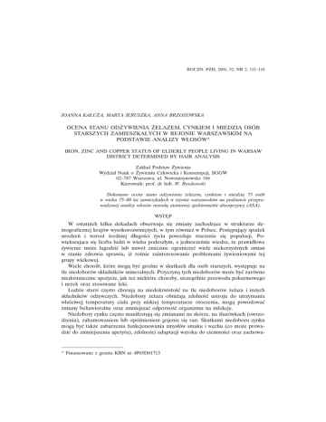 ROCZN. PZH, 2001, 52, NR 2, 111–118 JOANNA KAŁUŻA, MARTA JERUSZKA, ANNA BRZOZOWSKA OCENA STANU ODŻYWIENIA ŻELAZEM, CYNKIEM I MIEDZIĄ OSÓB STARSZYCH ZAMIESZKAŁYCH W REJONIE WARSZAWSKIM NA PODSTAWIE ANALIZY WŁOSÓW* IRON, ZINC AND COPPER STATUS OF ELDERLY PEOPLE LIVING IN WARSAW DISTRICT DETERMINED BY HAIR ANALYSIS Zakład Podstaw Żywienia Wydział Nauk o Żywieniu Człowieka i Konsumpcji, SGGW 02–787 Warszawa, ul. Nowoursynowska 166 Kierownik: prof. dr hab. W. Roszkowski Dokonano oceny stanu odżywienia żelazem, cynkiem i miedzią 73 osób w wieku 75–80 lat zamieszkałych w rejonie warszawskim na podstawie przeprowadzonej analizy włosów metodą atomowej spektrometrii absorpcyjnej (ASA). WSTĘP W ostatnich kilku dekadach obserwuje się zmiany zachodzące w strukturze demograficznej krajów wysokorozwiniętych, w tym również w Polsce. Postępujący spadek urodzeń i wzrost średniej długości życia powoduje starzenie się populacji. Powiększająca się liczba ludzi w wieku podeszłym, a jednocześnie wiedza, że prawidłowe żywienie może łagodzić lub nawet znacznie ograniczyć wiele niekorzystnych zmian w stanie zdrowia sprawia, iż rośnie zainteresowanie problemami żywieniowymi tej grupy wiekowej. Wiele chorób, które mogą być groźne w skutkach dla osób starszych, występuje na tle niedoborów składników mineralnych. Przyczyną tych niedoborów może być zarówno niedostateczne spożycie, jak też niektóre choroby, szczególnie przewodu pokarmowego i nerek oraz stosowane leki. Ludzie starsi często chorują na niedokrwistość na tle niedoborów żelaza i innych składników odżywczych. Niedobory żelaza obniżają zdolność ustroju do utrzymania właściwej temperatury ciała przy niskiej temperaturze otoczenia, mogą powodować zmiany behawioralne oraz zmniejszać odporność organizmu na infekcje. Niedobory cynku często manifestują się zmianami na skórze, na śluzówkach (owrzodzenia), zahamowaniem lub opóźnieniem gojenia się ran. Skutkami niedoboru cynku mogą być także zaburzenia funkcjonowania zmysłów smaku i węchu (co może prowadzić do zmniejszenia apetytu), zdolności adaptacji wzroku do ciemności oraz zachowa- * Finansowane z grantu KBN nr 4P05D01713 112 J. Kałuża, M. Jeruszka, A. Brzozowska Nr 2 nia równowagi, również obniżania się wydolności intelektualnej, a u mężczyzn może prowadzić do przerostu gruczołu krokowego. W stanach niedoboru miedzi zakłócone zostaje tworzenie elastyny w ścianach naczyń krwionośnych oraz kolagenu w układzie kostnym, często występuje niedokrwistość niedobarwliwa. Aby uniknąć wielu komplikacji zdrowotnych u ludzi starszych, poprawić jakość ich życia, sprawność fizyczną i psychiczną, lekarze i żywieniowcy powinni zwracać uwagę zarówno na sposób żywienia się tej grupy wiekowej, jak i na jej stan odżywienia, zwłaszcza witaminami i składnikami mineralnymi. W badaniach populacyjnych do oceny stanu odżywienia co raz częściej stosowane są metody charakteryzujące się łatwością pobrania próbki, nieinwazyjnością, prostotą wykonania analizy. Powyższe zalety posiada metoda analizy pierwiastkowej włosów. Potencjalne możliwości wykorzystania tej metody, jej zalety oraz ograniczenia były przedstawiane w wielu publikacjach [2, 3, 9, 12]. Celem pracy była ocena stanu odżywienia osób starszych zamieszkałych w rejonie warszawskim wybranymi składnikami mineralnymi: żelazem, cynkiem i miedzią, którą przeprowadzono na podstawie zawartości wyżej wymienionych pierwiastków we włosach badanych osób. MATERIAŁ I METODYKA Niniejsza praca została zrealizowana jako część projektu badawczego dotyczącego uwarunkowań sposobu żywienia i stanu odżywienia osób starszych zamieszkałych w rejonie warszawskim urodzonych w latach 1918–1923. Próbki włosów do badań pobrano w maju i czerwcu 1999 roku od 73 osób (23 kobiet i 50 mężczyzn) zamieszkałych w Warszawie i jej okolicach. Mniejszy udział kobiet spowodowany był nieprzydatnością ich włosów do analizy (były one farbowane bądź po trwałej ondulacji). Podstawowe informacje o respondentach zostały zebrane za pomocą wywiadu kwestionariuszowego. Włosy ucinano nożyczkami ze stali nierdzewnej z karku, tuż przy skórze, pozostawiając do badań około trzycentymetrowe ich odcinki. Naważki włosów około 0,5 g, pociętych na około 0,5 cm fragmenty poddawano myciu zgodnie z zaleceniami IAEA – Międzynarodowej Agencji Energii Atomowej [17] t.j. kolejno: acetonem (Merck 1.00014.1000), trzykrotnie wodą dejonizowaną i znów acetonem. Następnie próbki włosów suszono w temperaturze 105oC do stałej masy. Włosy mineralizowano na mokro w mikrofalowym systemie przygotowania próbek Model MARS 5, w naczyniach typu HP-500 z użyciem 7 cm3 65% kwasu azotowego (Merck 1.00456.1000). Proces mineralizacji prowadzono przez 10 minut w temperaturze około 210oC i ciśnieniu około 150 PSI. Użyta moc była regulowana w zależności od liczby mineralizowanych próbek i wynosiła od 300 do 1200 W. Zawartość badanych składników mineralnych w mineralizatach oznaczano metodą atomowej spektrometrii absorpcyjnej (ASA) przy użyciu spektrofotometru Solaar 989 firmy UNICAM. W analizie zastosowano następujące długości fal: 248,3 nm dla żelaza; 213,9 nm dla cynku i 324,8 nm dla miedzi. W przypadku oznaczania żelaza i cynku użyto również lampy deuterowej do korekcji tła. Przed przystąpieniem do właściwych oznaczeń przeprowadzono analizę materiału referencyjnego GBW09101. Do statystycznego opracowania uzyskanych wyników zastosowano testy Chi2 Pearsona oraz RIR Tuckey’a przyjmując za istotne różnice przy p ≤ 0,05. Nr 2 113 Żelazo, cynk i miedź we włosach WYNIKI Spośród badanych osób w wieku 75–80 lat połowa określiła swoją aktywność fizyczną i stan zdrowia jako średni. Blisko 100% kobiet i 70% mężczyzn cierpiało przynajmniej na jedną chorobę przewlekłą. Zdecyd