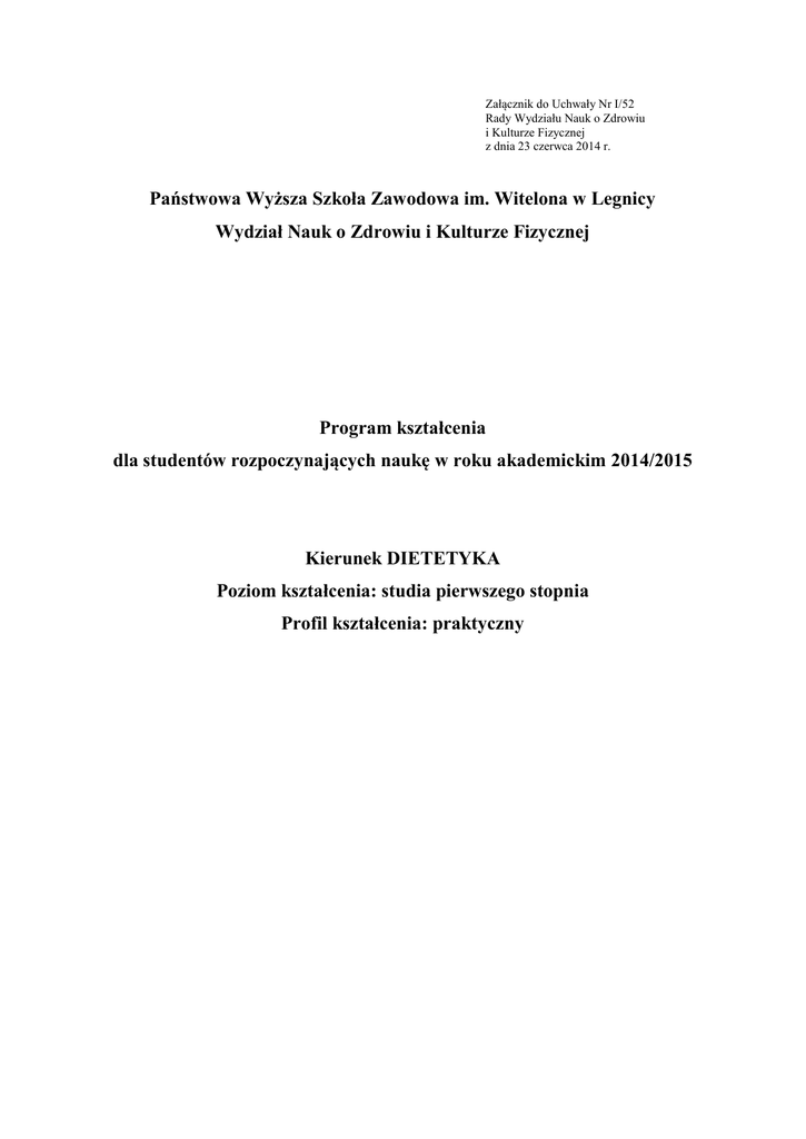 Załącznik do Uchwały Nr I/52 Rady Wydziału Nauk o Zdrowiu i Kulturze Fizycznej z dnia 23 czerwca 2014 r. Państwowa Wyższa Szkoła Zawodowa im. Witelona w Legnicy Wydział Nauk o Zdrowiu i Kulturze Fizycznej Program kształcenia dla studentów rozpoczynających naukę w roku akademickim 2014/2015 Kierunek DIETETYKA Poziom kształcenia: studia pierwszego stopnia Profil kształcenia: praktyczny Część I. Ogólna charakterystyka programu kształcenia I.1. Nazwa kierunku studiów: Dietetyka I.2. Poziom kształcenia: Studia pierwszego stopnia I.3. Profil kształcenia: Praktyczny I.4. Forma studiów: Studia stacjonarne i studia niestacjonarne I.5. Tytuł zawodowy uzyskiwany przez absolwenta studiów: Licencjat I.6. Przyporządkowanie kierunku studiów do obszaru lub obszarów kształcenia: Kierunek Dietetyka jest interdyscyplinarny i należy do następujących obszarów kształcenia: obszar nauk medycznych, nauk o zdrowiu i nauk o kulturze fizycznej, obszar nauk rolniczych, leśnych i weterynaryjnych. I.7. Dziedziny nauki i dyscypliny naukowe, do których odnoszą się efekty kształcenia: Efekty kształcenia odnoszą się do następujących dziedzin i dyscyplin naukowych: dziedzina nauk medycznych – medycyna, dziedzina nauk rolniczych – dyscyplina: technologia żywności i żywienia. I.8. Wymagania wstępne i zasady rekrutacji: Minimalnym wymaganiem dla kandydata na studia pierwszego stopnia na kierunku Dietetyka jest posiadanie świadectwa maturalnego. W procesie rekrutacji uwzględnia się oceny uzyskane przez kandydatów na egzaminach maturalnych z następujących przedmiotów: biologia, język obcy, jeden z wybranych przedmiotów: język polski, matematyka, chemia lub fizyka (fizyka i astronomia). Część II. Opis zakładanych efektów kształcenia II.1. Tabela odniesień kierunkowych efektów kształcenia do efektów obszarowych: Odniesienie do Symbol Opis efektów kształcenia dla kierunku Dietetyka efektów obszarowych WIEDZA K_W01 Zna budowę, sposób biosyntezy i funkcje fizjologiczne białek, M1_W01 tłuszczów, węglowodanów oraz elektrolitów, pierwiastków R1P_W01 śladowych, witamin, hormonów i metabolitów wtórnych. K_W02 Zan budowę ludzkiego organizmu oraz procesy metaboliczne M1_W02 2 K_W03 K_W04 K_W05 K_W06 K_W07 K_W08 K_W09 K_W10 K_W11 K_W12 K_W13 K_W14 zachodzące na poziomie komórkowym, tkankowym i narządowym ze szczególnym uwzględnieniem wybranych układów. Zna mechanizmy funkcjonowania układów w organizmie człowieka, powiązań między tymi układami oraz zasad regulacji tych mechanizmów w stanach fizjologicznych oraz patologicznych ze szczególnym uwzględnieniem procesów trawienia i wchłaniania. Zna wartości wskaźników stanu zdrowia i odżywienia. Zna procesy metaboliczne, rozumie i potrafi wyjaśnić wzajemne zależności pomiędzy układem pokarmowym, a układem nerwowym, krążenia i oddychania, moczowym i dokrewnym. Zna mechanizmy dziedziczenia, genetyczne i środowiskowe uwarunkowania cech człowieka. Zna choroby uwarunkowane genetycznie, ich związek z żywieniem i możliwości leczenia dietetycznego. Zna funkcjonowanie i mechanizmy działania układu odpornościowego, ze szczególnym uwzględnieniem alergii i nietolerancji pokarmowych. Zna wpływ na stan odżywienia chorób układu pokarmowego, krążenia, oddychania, kostnego, rozrodczego, moczowego i nerwowego oraz chorób dermatologicznych, chorób zakaźnych (w tym wirusowych), chorób pasożytniczych i nowotworów. Ma wiedzę z zakresu składu oraz właściwości surowców, produktów żywnościowych i dodatków do żywności. Zna rolę składników odżywczych w przemianach metabolicznych organizmu oraz jego zapotrzebowanie energetyczne. Ma wiedzę z zakresu pozyskiwania żywności, w tym metodami niekonwencjonalnymi. Zna budowę, fizjologię, patogenność mikroorganizmów i organizmów pasożytniczych, a także budowę, metabolizm mikroorganizmów o znaczeniu biotechnologicznym oraz zagrożenia zdrowotne dla człowieka. Zna zagrożenia chemiczne i biologiczne żywności, ich wpływ na zdrowie człowieka oraz sposób postępowania w sytuacji narażenia zdrowia. Ma wiedzę na temat procesów chemicznych i biologicznych zachodzących w żywności w trakcie jej utrwalania, przechowywania oraz przetwarzania. Zna mechanizmy działania leków i wybranych związków chemicznych oraz ich interakcji z innymi lekami oraz ze składnikami pokarmowymi. Zna podstawowe klasy leków, wskazania i przeciwwskazania do ich stosowania. Zna prawo żywnościowe z uwzględnieniem zasad higieny i bezpieczeństwa pracy w odniesieniu do żywności, a także zna systemy kontroli jakości żywności. K_W15 Ma podstawową wiedzę na temat metod biologicznej R1P_W04 M1_W02 M1_W03 R1P_W04 M1_W02 M1_W01 M1_W03 M1_W02 M1_W03 M1_W02 M1_W03 R1P_W01 R1P_W03 R1P_W04 M1_W01 R1P_W05 M1_W03 M1_W05 R1P_W04 R1P_W05 M1_W03 M1_W05 R1P_W03 R1P_W03 R1P_W05 M1_W01 M1_W03 M1_W08 R1P_W02 R1P_W05 R1P_W09 R1P_W03 3 K_W16 K_W17 K_W18 K_W19 K_W20 K_W21 K_W22 K_W23 K_W24 i analitycznej oceny jakości żywności. Zna metody oceny sposobu żywienia i stanu odżywienia z uwzględnieniem dzieci i młodzieży. Zna zasady planowania i organizowania żywienia indywidualnego i zbiorowego. Ma wiedzę na temat klasyfikacji diet i zasad ich sporządzania. Ma wiedzę z zakresu zaleceń i norm żywieniowych, zasad żywienia różnych grup społecznych ludzi w zdrowiu i w chorobie, w tym typy stosowanych diet. Zna powiązania między nieprawidłowym żywieniem, a wybranymi chorobami, przyczynami i skutkami zaburzeń odżywiania z uwzględnieniem profilaktyki żywieniowej w wybranych chorobach. Ma wiedze na temat sposobu projektowania i prowadzenia procesów technologicznych służących uzyskaniu produktu żywnościowego o pożądanych cechach. Zna zasady przygotowywania potraw. Zna wyposażenie oraz zasady obsługi urządzeń stosowanych w technologii gastronomicznej. Ma podstawową wiedzę o charakterze nauk społecznych i ich wzajemnych re