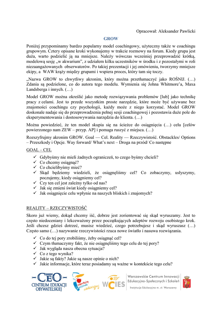 Opracował: Aleksander Pawlicki GROW Poniżej przypominamy bardzo popularny model coachingowy, użyteczny także w coachingu grupowym. Cztery opisane kroki wykonujemy w trakcie rozmowy na forum. Kiedy grupa jest duża, warto podzielić ją na mniejsze. Należy wówczas wcześniej przeprowadzić krótką, modelową sesję „w akwarium”, z udziałem kilku uczestników w środku i z pozostałymi w roli niezaangażowanych obserwatorów. Po takiej prezentacji i jej omówieniu, tworzymy mniejsze ekipy, a WAW krąży między grupami i wspiera proces, który tam się toczy. „Nazwa GROW to chwytliwy akronim, który można przetłumaczyć jako ROŚNIJ. (…) Zdania są podzielone, co do autora tego modelu. Wymienia się Johna Whitmore’a, Maxa Landsberga i innych. (…) Model GROW można określić jako metodę rozwiązywania problemów [lub] jako technikę pracy z celami. Jest to przede wszystkim proste narzędzie, które może być używane bez znajomości coachingu czy psychologii, każdy może z niego korzystać. Model GROW doskonale nadaje się do przeprowadzenia pełnej sesji coachingowej i pozostawia duże pole do eksperymentowania i dostosowywania narzędzia do klienta. (…) Można powiedzieć, że ten model skupia się na ścieżce do osiągnięcia (…) celu [celów powierzonego nam ZEW – przyp. AP] i pomaga ruszyć z miejsca. (…) Rozszyfrujmy akronim GROW. Goal — Cel. Reality — Rzeczywistość. Obstackles/ Options – Przeszkody i Opcje. Way forward/ What’s next – Droga na przód/ Co następne GOAL – CEL Gdybyśmy nie mieli żadnych ograniczeń, to czego byśmy chcieli? Co chcemy osiągnąć? Co chcielibyśmy mieć? Skąd będziemy wiedzieli, że osiągnęliśmy cel? Co zobaczymy, usłyszymy, poczujemy, kiedy osiągniemy cel? Czy ten cel jest zależny tylko od nas? Jak się zmieni świat kiedy osiągniemy cel? Jak osiągnięcie celu wpłynie na naszych bliskich i znajomych? REALITY – RZECZYWISTOŚĆ Skoro już wiemy, dokąd chcemy iść, dobrze jest zorientować się skąd wyruszamy. Jest to często niedoceniany i lekceważony przez początkujących adeptów rozwoju osobistego krok. Jeśli chcesz gdzieś dotrzeć, musisz wiedzieć, czego potrzebujesz i skąd wyruszasz (…) Często samo (…) nazywanie rzeczywistości rzuca nowe światło i nasuwa rozwiązania. Co do tej pory zrobiliśmy, żeby osiągnąć cel? Czym tłumaczymy fakt, że nie osiągnęliśmy tego celu do tej pory? Jak wygląda nasza obecna sytuacja? Co z tego wynika? Jakie są fakty? Jakie są nasze opinie o nich? Jakie informacje, które teraz posiadamy są ważne w kontekście tego celu? Co robimy zamiast pracować nad celem? Co o nas może powiedzieć ktoś, kto widzi nas z boku? Co na co dzień sprawia, że jesteśmy zajęci? OBSTACLES/OPTIONS – PRZESZKODY I OPCJE To jest etap, na którym generujemy jak najwięcej rozwiązań, możliwości. Przy generowaniu pomysłów najważniejsze jest, żeby ich nie krytykować. (…). Dlatego w każdym dobrym modelu ocena pomysłów jest innym etapem. Co możemy zrobić, żeby osiągnąć cel? Co możemy robić inaczej? Co się stanie, kiedy wszystkie nasze ograniczenia zostaną zniesione? Gdybyś miał potrzebne czas, pieniądze i wiedzę, to co byś mógł zrobić, żeby osiągnąć cel? Wyobraźcie sobie, że mamy przycisk, po naciśnięciu którego nasz cel został osiągnięty. Jak wygląda nasze otoczenie po osiągnięciu celu? Co się musiało zmienić, żeby stało się to możliwe? Jakiej rady udzieliłby Ci Twój autorytet w tej dziedzinie? Jakie Twoje wartości zostaną zrealizowane kiedy osiągniemy ten cel? Co byłoby przełomem w realizacji celu? Kim musimy się stać? Jakich umiejętności potrzebujemy? WAY FORWARD/ WHAT’S NEXT – DROGA NA PRZÓD/ CO NASTĘPNE Teraz ustalamy plan działania i pierwsze kroki. Jakimi kryteriami będziemy się kierowali w wyborze działania? Jakie rozwiązanie wybieramy? Co zrobimy najpierw? Co później? Jakie są etapy/kamienie milowe na drodze do celu? Jak będziemy się motywowali na swojej drodze? Co musimy najpierw zrobić, żeby ruszyć na przód/poruszać się szybciej?” Źródło: http://www.qagile.pl/artykuly/model-grow-4-kroki-wzrostu/