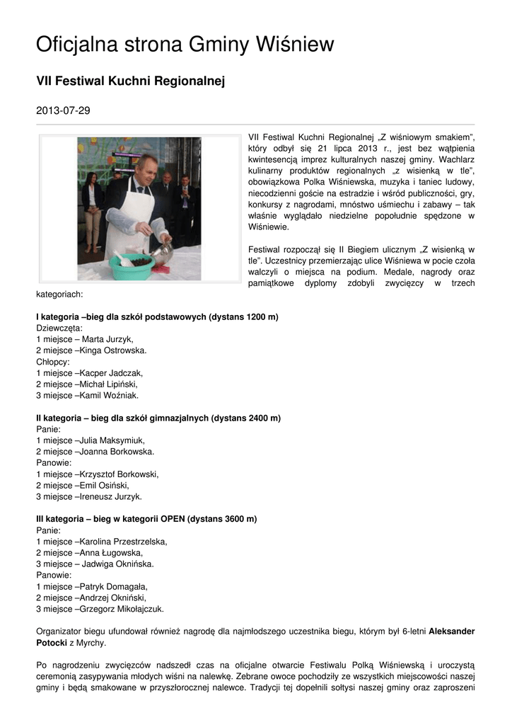 Oficjalna strona Gminy Wiśniew VII Festiwal Kuchni Regionalnej 2013-07-29 VII Festiwal Kuchni Regionalnej „Z wiśniowym smakiem”, który odbył się 21 lipca 2013 r., jest bez wątpienia kwintesencją imprez kulturalnych naszej gminy. Wachlarz kulinarny produktów regionalnych „z wisienką w tle”, obowiązkowa Polka Wiśniewska, muzyka i taniec ludowy, niecodzienni goście na estradzie i wśród publiczności, gry, konkursy z nagrodami, mnóstwo uśmiechu i zabawy – tak właśnie wyglądało niedzielne popołudnie spędzone w Wiśniewie. Festiwal rozpoczął się II Biegiem ulicznym „Z wisienką w tle”. Uczestnicy przemierzając ulice Wiśniewa w pocie czoła walczyli o miejsca na podium. Medale, nagrody oraz pamiątkowe dyplomy zdobyli zwycięzcy w trzech kategoriach: I kategoria –bieg dla szkół podstawowych (dystans 1200 m) Dziewczęta: 1 miejsce – Marta Jurzyk, 2 miejsce –Kinga Ostrowska. Chłopcy: 1 miejsce –Kacper Jadczak, 2 miejsce –Michał Lipiński, 3 miejsce –Kamil Woźniak. II kategoria – bieg dla szkół gimnazjalnych (dystans 2400 m) Panie: 1 miejsce –Julia Maksymiuk, 2 miejsce –Joanna Borkowska. Panowie: 1 miejsce –Krzysztof Borkowski, 2 miejsce –Emil Osiński, 3 miejsce –Ireneusz Jurzyk. III kategoria – bieg w kategorii OPEN (dystans 3600 m) Panie: 1 miejsce –Karolina Przestrzelska, 2 miejsce –Anna Ługowska, 3 miejsce – Jadwiga Oknińska. Panowie: 1 miejsce –Patryk Domagała, 2 miejsce –Andrzej Okniński, 3 miejsce –Grzegorz Mikołajczuk. Organizator biegu ufundował również nagrodę dla najmłodszego uczestnika biegu, którym był 6-letni Aleksander Potocki z Myrchy. Po nagrodzeniu zwycięzców nadszedł czas na oficjalne otwarcie Festiwalu Polką Wiśniewską i uroczystą ceremonią zasypywania młodych wiśni na nalewkę. Zebrane owoce pochodziły ze wszystkich miejscowości naszej gminy i będą smakowane w przyszłorocznej nalewce. Tradycji tej dopełnili sołtysi naszej gminy oraz zaproszeni goście: Krzysztof Tchórzewski - Poseł na Sejm RP, Krzysztof Borkowski - Poseł na Sejm RP, Zygmunt Wielogórski – Starosta Siedlecki, Henryk Brodowski – Przewodniczący Rady Powiatu Siedleckiego, Dariusz Jasiński - Wiceprzewodniczący Rady Powiatu Siedleckiego, Prezes Zarządu MBS w Zbuczynie, Karol Przesmycki - Zakład Elektrotechniczny ZELTECH, Jacek Rymuza - Dyrektor MBS w Zbuczynie Oddział w Wiśniewie, Anna i Grzegorz Dybciak – PPH Agro-Top, Tadeusz GOC, Jacek Grabiński – Wiceprezes Stowarzyszenia Wspólnota Polska Oddz. w Siedlcach, Zbigniew Stąsiek – Polskie Radio S.A., Magdalena Łapińska – przedstawiciel firmy Contino Ipsylon Sp. z o.o., Antoni Okniński, Janusz Grzegrzółka Przewodniczący Rady Gminy Wiśniew oraz gospodarz, Krzysztof Kryszczuk - Wójt Gminy Wiśniew. Jednym z kluczowych elementów Festiwalu był pokaz i degustacja potraw z wiśni. Wyłonienie zwycięzców konkursu na najlepszą potrawę z wisienką w roli głównej było punktem kulminacyjnym wielu godzin starań uczestników konkursu. Swoje popisowe potrawy wystawiły Koła Gospodyń Wiejskich ze Śmiar, Mroczk, Łupin, Radomyśli, Twork, Starych Oknin, Wólki Wiśniewskiej oraz Państwo Diana i Mariusz Jastrzębscy, Dworskie Smaki Mościbrody i Pani Halina Koszara. Z roku na rok przygotowane dania są bardziej wyszukane i świetnie oddają wiśniowy charakter imprezy, ale jednocześnie stawiają komisję konkursową w niezwykle trudnej sytuacji. W tym roku werdykt należał do komisji w międzynarodowym składzie: Luigi Sorrentino i Giulio Vicedomini Włoch oraz Małgorzaty Dymeckiej, Teresy Nazarczuk i Bożeny Wyrębek . Najlepsze z najlepszych potraw należały do: - Koła Gospodyń Wiejskich z Wólki Wiśniewskiej - I miejsce za kawę mrożoną z musem wiśniowym i bitą śmietaną, - Koła Gospodyń Wiejskich z Twork – II miejsce za sakiewki schabowe z wiśniowym smakiem, - Haliny Koszary – III miejsce za golonkę w piwie z wiśniami - Koła Gospodyń Wiejskich z Radomyśli – wyróżnienie za chleb wieloziarnisty z wiśnią na zakwasie naturalnym, - Koła Gospodyń Wiejskich z Bork-Paduch - wyróżnienie za schab duszony z wiśnią. Wszyscy uczestnicy konkursu na najsmaczniejszą potrawę „z wisienką w tle” otrzymali pamiątkowe dyplomy. Pierwsze trzy miejsca talony pieniężne. Zaszczytu przygotowania nalewki z owoców wiśni na VIII Festiwal Kuchni Regionalnej „Z wiśniowym smakiem” dostąpiły Panie z KGW w Wólce Wiśniewskiej. - Chętnie wystawiamy na konkurs swoje produkty. Jest to możliwość pokazania swoich umiejętności kulinarnych na szerszym forum. Wygrana jest dla Nas bardzo dużym zaskoczeniem. Nie dowierzałyśmy, że nasza skromna potrawa została wybrana spośród tak pracochłonnych i ambitnych dań za najlepszą. Kawa mrożona z musem wiśniowym i bitą śmietaną nie kosztowała nas dużo pracy. W porównaniu z innymi daniami zgłoszonymi do konkursu jest prosta do przygotowania. Pomysł na nasz smakołyk zawdzięczamy Pani Joannie Strzemiecznej, która podała przepis na zwycięską potrawę.- mówiła członkini KGW z Wólki Wiśniewskiej. Na skwerze przed Urzędem Gminy Wiśniew organizatorzy zapewnili wiele atrakcji. Obok strażnicy swoje miejsce odnalazły najmłodsi uczestnicy imprezy. Dzieci bawiły się na pompowanych zjeżdżalniach i zamkach, w kulach wodnych. Miały także okazję przejechać się na kucykach, które spacerowały wzdłuż placu gminy. Podczas Festiwalu na scenie zaprezentowali się: ZLPiT im. Zbigniewa Myrchy WIŚNIEWIACY, Zespół Seniora w Radomyśli, Dziecięcy Zespół Taneczny WIŚNIEWIACY, Babeczki Podlasie - które występowały w paru odsłonach: „Biesiadzie Szlacheckiej”, zabawach i konkursach dla dzieci „Pszczółkowe hity” oraz w widowisku kabaretowym pt. „Wiejskie babeczki z Ce. Be. eŚ.”. Odbył się również konkurs siłowy dla mężczyzn, których zadaniem była jak największa liczba uniesień beczki. Konkurencja ta cieszyła s
