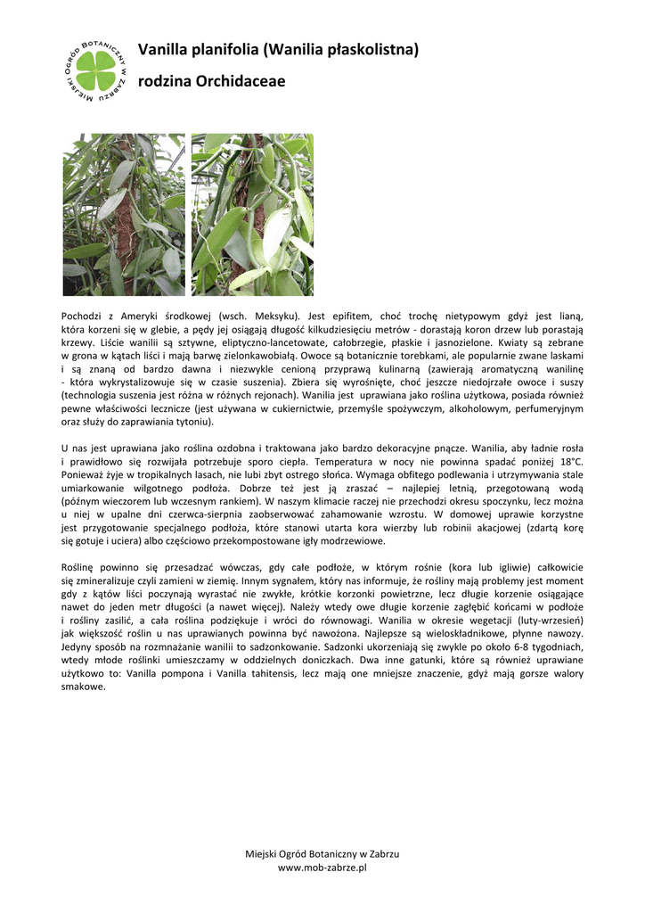 Vanilla planifolia (Wanilia płaskolistna) rodzina Orchidaceae Pochodzi z Ameryki środkowej (wsch. Meksyku). Jest epifitem, choć trochę nietypowym gdyż jest lianą, która korzeni się w glebie, a pędy jej osiągają długość kilkudziesięciu metrów - dorastają koron drzew lub porastają krzewy. Liście wanilii są sztywne, eliptyczno-lancetowate, całobrzegie, płaskie i jasnozielone. Kwiaty są zebrane w grona w kątach liści i mają barwę zielonkawobiałą. Owoce są botanicznie torebkami, ale popularnie zwane laskami i są znaną od bardzo dawna i niezwykle cenioną przyprawą kulinarną (zawierają aromatyczną wanilinę - która wykrystalizowuje się w czasie suszenia). Zbiera się wyrośnięte, choć jeszcze niedojrzałe owoce i suszy (technologia suszenia jest różna w różnych rejonach). Wanilia jest uprawiana jako roślina użytkowa, posiada również pewne właściwości lecznicze (jest używana w cukiernictwie, przemyśle spożywczym, alkoholowym, perfumeryjnym oraz służy do zaprawiania tytoniu). U nas jest uprawiana jako roślina ozdobna i traktowana jako bardzo dekoracyjne pnącze. Wanilia, aby ładnie rosła i prawidłowo się rozwijała potrzebuje sporo ciepła. Temperatura w nocy nie powinna spadać poniżej 18°C. Ponieważ żyje w tropikalnych lasach, nie lubi zbyt ostrego słońca. Wymaga obfitego podlewania i utrzymywania stale umiarkowanie wilgotnego podłoża. Dobrze też jest ją zraszać – najlepiej letnią, przegotowaną wodą (późnym wieczorem lub wczesnym rankiem). W naszym klimacie raczej nie przechodzi okresu spoczynku, lecz można u niej w upalne dni czerwca-sierpnia zaobserwować zahamowanie wzrostu. W domowej uprawie korzystne jest przygotowanie specjalnego podłoża, które stanowi utarta kora wierzby lub robinii akacjowej (zdartą korę się gotuje i uciera) albo częściowo przekompostowane igły modrzewiowe. Roślinę powinno się przesadzać wówczas, gdy całe podłoże, w którym rośnie (kora lub igliwie) całkowicie się zmineralizuje czyli zamieni w ziemię. Innym sygnałem, który nas informuje, że rośliny mają problemy jest moment gdy z kątów liści poczynają wyrastać nie zwykłe, krótkie korzonki powietrzne, lecz długie korzenie osiągające nawet do jeden metr długości (a nawet więcej). Należy wtedy owe długie korzenie zagłębić końcami w podłoże i rośliny zasilić, a cała roślina podziękuje i wróci do równowagi. Wanilia w okresie wegetacji (luty-wrzesień) jak większość roślin u nas uprawianych powinna być nawożona. Najlepsze są wieloskładnikowe, płynne nawozy. Jedyny sposób na rozmnażanie wanilii to sadzonkowanie. Sadzonki ukorzeniają się zwykle po około 6-8 tygodniach, wtedy młode roślinki umieszczamy w oddzielnych doniczkach. Dwa inne gatunki, które są również uprawiane użytkowo to: Vanilla pompona i Vanilla tahitensis, lecz mają one mniejsze znaczenie, gdyż mają gorsze walory smakowe. Miejski Ogród Botaniczny w Zabrzu www.mob-zabrze.pl