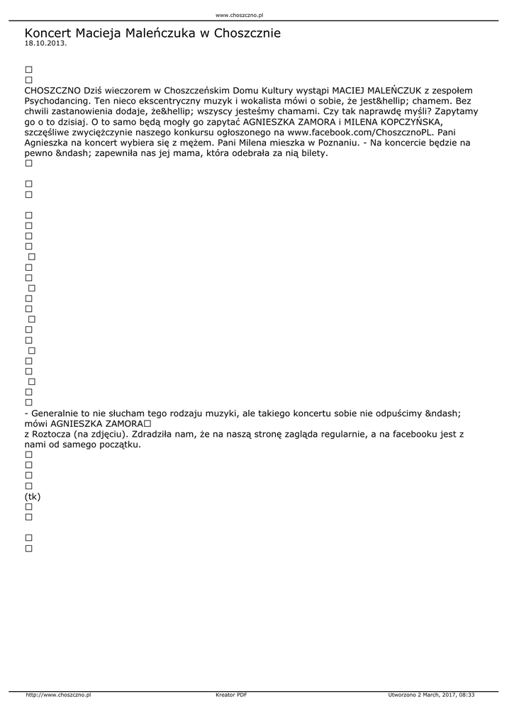 www.choszczno.pl Koncert Macieja Maleńczuka w Choszcznie 18.10.2013. CHOSZCZNO Dziś wieczorem w Choszczeńskim Domu Kultury wystąpi MACIEJ MALEŃCZUK z zespołem Psychodancing. Ten nieco ekscentryczny muzyk i wokalista mówi o sobie, że jest… chamem. Bez chwili zastanowienia dodaje, że… wszyscy jesteśmy chamami. Czy tak naprawdę myśli? Zapytamy go o to dzisiaj. O to samo będą mogły go zapytać AGNIESZKA ZAMORA i MILENA KOPCZYŃSKA, szczęśliwe zwyciężczynie naszego konkursu ogłoszonego na www.facebook.com/ChoszcznoPL. Pani Agnieszka na koncert wybiera się z mężem. Pani Milena mieszka w Poznaniu. - Na koncercie będzie na pewno – zapewniła nas jej mama, która odebrała za nią bilety. - Generalnie to nie słucham tego rodzaju muzyki, ale takiego koncertu sobie nie odpuścimy – mówi AGNIESZKA ZAMORA z Roztocza (na zdjęciu). Zdradziła nam, że na naszą stronę zagląda regularnie, a na facebooku jest z nami od samego początku. (tk) http://www.choszczno.pl Kreator PDF Utworzono 2 March, 2017, 08:33