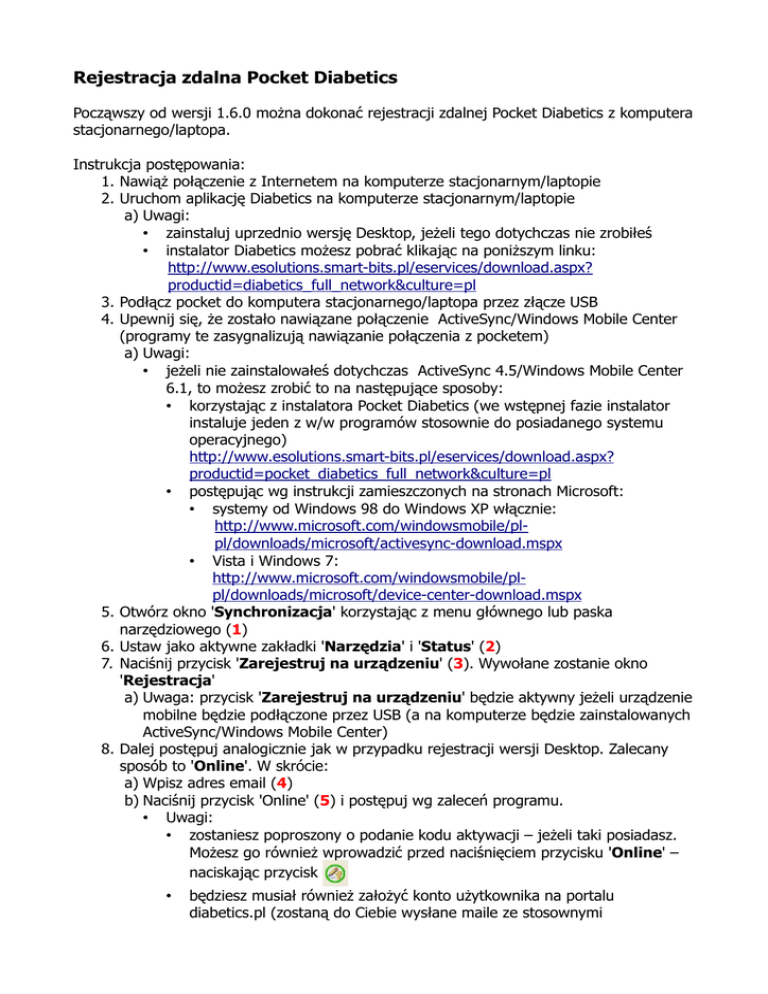 Rejestracja zdalna Pocket Diabetics Począwszy od wersji 1.6.0 można dokonać rejestracji zdalnej Pocket Diabetics z komputera stacjonarnego/laptopa. Instrukcja postępowania: 1. Nawiąż połączenie z Internetem na komputerze stacjonarnym/laptopie 2. Uruchom aplikację Diabetics na komputerze stacjonarnym/laptopie a) Uwagi: • zainstaluj uprzednio wersję Desktop, jeżeli tego dotychczas nie zrobiłeś • instalator Diabetics możesz pobrać klikając na poniższym linku: http://www.esolutions.smart-bits.pl/eservices/download.aspx? productid=diabetics_full_network&culture=pl 3. Podłącz pocket do komputera stacjonarnego/laptopa przez złącze USB 4. Upewnij się, że zostało nawiązane połączenie ActiveSync/Windows Mobile Center (programy te zasygnalizują nawiązanie połączenia z pocketem) a) Uwagi: • jeżeli nie zainstalowałeś dotychczas ActiveSync 4.5/Windows Mobile Center 6.1, to możesz zrobić to na następujące sposoby: • korzystając z instalatora Pocket Diabetics (we wstępnej fazie instalator instaluje jeden z w/w programów stosownie do posiadanego systemu operacyjnego) http://www.esolutions.smart-bits.pl/eservices/download.aspx? productid=pocket_diabetics_full_network&culture=pl • postępując wg instrukcji zamieszczonych na stronach Microsoft: • systemy od Windows 98 do Windows XP włącznie: http://www.microsoft.com/windowsmobile/plpl/downloads/microsoft/activesync-download.mspx • Vista i Windows 7: http://www.microsoft.com/windowsmobile/plpl/downloads/microsoft/device-center-download.mspx 5. Otwórz okno 'Synchronizacja' korzystając z menu głównego lub paska narzędziowego (1) 6. Ustaw jako aktywne zakładki 'Narzędzia' i 'Status' (2) 7. Naciśnij przycisk 'Zarejestruj na urządzeniu' (3). Wywołane zostanie okno 'Rejestracja' a) Uwaga: przycisk 'Zarejestruj na urządzeniu' będzie aktywny jeżeli urządzenie mobilne będzie podłączone przez USB (a na komputerze będzie zainstalowanych ActiveSync/Windows Mobile Center) 8. Dalej postępuj analogicznie jak w przypadku rejestracji wersji Desktop. Zalecany sposób to 'Online'. W skrócie: a) Wpisz adres email (4) b) Naciśnij przycisk 'Online' (5) i postępuj wg zaleceń programu. • Uwagi: • zostaniesz poproszony o podanie kodu aktywacji – jeżeli taki posiadasz. Możesz go również wprowadzić przed naciśnięciem przycisku 'Online' – naciskając przycisk • będziesz musiał również założyć konto użytkownika na portalu diabetics.pl (zostaną do Ciebie wysłane maile ze stosownymi wytycznymi). jeżeli rejestrowałeś już wersję Desktop, to możesz wykorzystać użyte do rejestracji konto dla wersji Desktop c) Po otrzymaniu kodu licencji (pojawi się ona w dolnym okienku) naciśnij przycisk 'Rejestruj' • Uwaga: jeżeli podczas próby rejestracji otrzymasz błąd typu: Błąd zapisu do rejstru systemowego, to wykonaj następujące czynności i ponów w/w procedurę od miejsca wystąpienia błędu: 1. Pobierz i zainstaluj program CeRegEditor ze strony: http://ceregeditor.mdsoft.pl/index.php?id=3&lang=pl 2. Postępuj wg wskazówek zamieszczonych w FAQ w sekcji 'Podczas edycji rejestru cały czas otrzymuję komunikat "Dostęp zabroniony" / "Błąd zapisu".' http://ceregeditor.mdsoft.pl/index.php?id=5&lang=pl 3. Dokonaj soft resetu urządzenia po operacji Unlock Uwaga: Począwszy od wersji 1.7.1 funkcja odblokowywania rejestru została zaimplementowana w Diabetics. Więcej na temat rejestracji 'Online' w dokumentacji: http://www.mirror1.smartbits.pl/downloads/esolutions/diabetics/doc/pl/Diabetics_rejestracja_online.pdf http://www.mirror1.smart- bits.pl/downloads/esolutions/diabetics/doc/pl/Skrocona_instrukcja_rejestracji_z_kodem_ak tywacji.pdf