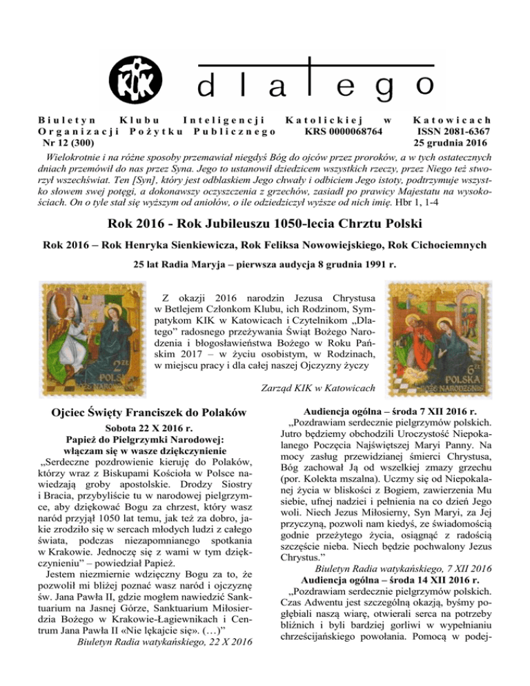 Biuletyn Klubu Inteligencji Katolickiej w Organizacji Pożytku Publicznego KRS 0000068764 Nr 12 (300) Katowicach ISSN 2081-6367 25 grudnia 2016 Wielokrotnie i na różne sposoby przemawiał niegdyś Bóg do ojców przez proroków, a w tych ostatecznych dniach przemówił do nas przez Syna. Jego to ustanowił dziedzicem wszystkich rzeczy, przez Niego też stworzył wszechświat. Ten [Syn], który jest odblaskiem Jego chwały i odbiciem Jego istoty, podtrzymuje wszystko słowem swej potęgi, a dokonawszy oczyszczenia z grzechów, zasiadł po prawicy Majestatu na wysokościach. On o tyle stał się wyższym od aniołów, o ile odziedziczył wyższe od nich imię. Hbr 1, 1-4 Rok 2016 - Rok Jubileuszu 1050-lecia Chrztu Polski Rok 2016 – Rok Henryka Sienkiewicza, Rok Feliksa Nowowiejskiego, Rok Cichociemnych 25 lat Radia Maryja – pierwsza audycja 8 grudnia 1991 r. Z okazji 2016 narodzin Jezusa Chrystusa w Betlejem Członkom Klubu, ich Rodzinom, Sympatykom KIK w Katowicach i Czytelnikom „Dlatego” radosnego przeżywania Świąt Bożego Narodzenia i błogosławieństwa Bożego w Roku Pańskim 2017 – w życiu osobistym, w Rodzinach, w miejscu pracy i dla całej naszej Ojczyzny życzy Zarząd KIK w Katowicach Ojciec Święty Franciszek do Polaków Sobota 22 X 2016 r. Papież do Pielgrzymki Narodowej: włączam się w wasze dziękczynienie „Serdeczne pozdrowienie kieruję do Polaków, którzy wraz z Biskupami Kościoła w Polsce nawiedzają groby apostolskie. Drodzy Siostry i Bracia, przybyliście tu w narodowej pielgrzymce, aby dziękować Bogu za chrzest, który wasz naród przyjął 1050 lat temu, jak też za dobro, jakie zrodziło się w sercach młodych ludzi z całego świata, podczas niezapomnianego spotkania w Krakowie. Jednoczę się z wami w tym dziękczynieniu” – powiedział Papież. Jestem niezmiernie wdzięczny Bogu za to, że pozwolił mi bliżej poznać wasz naród i ojczyznę św. Jana Pawła II, gdzie mogłem nawiedzić Sanktuarium na Jasnej Górze, Sanktuarium Miłosierdzia Bożego w Krakowie-Łagiewnikach i Centrum Jana Pawła II «Nie lękajcie się». (…)” Biuletyn Radia watykańskiego, 22 X 2016 Audiencja ogólna – środa 7 XII 2016 r. „Pozdrawiam serdecznie pielgrzymów polskich. Jutro będziemy obchodzili Uroczystość Niepokalanego Poczęcia Najświętszej Maryi Panny. Na mocy zasług przewidzianej śmierci Chrystusa, Bóg zachował Ją od wszelkiej zmazy grzechu (por. Kolekta mszalna). Uczmy się od Niepokalanej życia w bliskości z Bogiem, zawierzenia Mu siebie, ufnej nadziei i pełnienia na co dzień Jego woli. Niech Jezus Miłosierny, Syn Maryi, za Jej przyczyną, pozwoli nam kiedyś, ze świadomością godnie przeżytego życia, osiągnąć z radością szczęście nieba. Niech będzie pochwalony Jezus Chrystus.” Biuletyn Radia watykańskiego, 7 XII 2016 Audiencja ogólna – środa 14 XII 2016 r. „Pozdrawiam serdecznie pielgrzymów polskich. Czas Adwentu jest szczególną okazją, byśmy pogłębiali naszą wiarę, otwierali serca na potrzeby bliźnich i byli bardziej gorliwi w wypełnianiu chrześcijańskiego powołania. Pomocą w podej- mowaniu tych zadań niech będzie dla was codzienna modlitwa, rozważanie słowa Bożego, uczestnictwo w Roratach i w rekolekcjach adwentowych. W duchu radości przygotujcie wasze serca na przyjęcie Dobrej Nowiny o narodzeniu Bożego Syna. Wam tu obecnym i waszym bliskim z serca błogosławię”. Biuletyn Radia watykańskiego, 14 XII 2016 Audiencja ogólna – środa 21 XII 2016 r. „Serdeczne pozdrowienie kieruję do polskich pielgrzymów. Drodzy Bracia i Siostry, w ostatnich dniach Adwentu towarzyszy nam wezwanie św. Pawła Apostoła: «Radujcie się zawsze w Panu; jeszcze raz powtarzam: radujcie się! Niech będzie znana wszystkim ludziom wasza wyrozumiała łagodność: Pan jest blisko!» (Flp 4, 4-5). Święta Bożego Narodzenia niech będą dla was wszystkich i dla waszych rodzin czasem radości, pokoju i nadziei. Dobrych świąt!” Biuletyn Radia watykańskiego, 21 XII 2016 Stanisław Waluś Pielgrzymka KIK w Katowicach do Łagiewnik 19 listopada 2016 r. – przyjęcie Jezusa Chrystusa za Króla i Pana w Roku Jubileuszu 1050-lecia Chrztu Polski Z Katowic wyjechaliśmy o 7.15. Jak zwykle pielgrzymkę rozpoczęliśmy modlitwą poranną, potem odmówiliśmy Różaniec. Na miejscu nasza grypa podzieliła się – każdy szukał dogodnego miejsca. Zostałem z boku, ale przed telebimem. Było nas ponad 100 tys. osób. O godz. 10.00 rozpoczęło się nabożeństwo. Plac przed bazyliką wypełniony pielgrzymami bardziej niż w Święto Miłosierdzia Bożego – 11.00. O godz. 11.00 konferencję wygłosił bp Roman Pindel, ordynariusz diecezji bielsko-żywieckiej. Powiedział, że Syn Boży wyruszył na wojnę aby pokonać szatana, a miejscem walki była Golgota, natomiast przez zmartwychwstanie zademonstrował zwycięstwo. Uznajemy Jezusowe panowanie nad światem, nie czynimy Go królem, ale poddajemy się pod Jego panowanie. 17 VIII 2002 r. Jan Paweł II zawierzył świat Miłosierdziu Bożemu. Ks. Biskup wspomniał encyklikę Ojca Świętego Piusa XI „Quas primas” z 11 grudnia 1925 r. o ustanowieniu Święta Jezusa Chrystusa Króla. Potem odmówiliśmy Litanię do Polskich Świętych i inne modlitwy. Prezydent RP Andrzej Duda przekazał ozdobny ewangeliarz, który był potem używany podczas Mszy św. Rok 2016 - Rok Jubileuszu 1050-lecia Chrztu Polski Krzysztof Ożóg 966. Chrzest Polski Wydawnictwo Biały Kruk Kraków 2015 XVI. Zabiegi Mieszka I o wzmocnienie chrześcijaństwa – akt oblacji państwa Stolicy Apostolskiej W ostatnich latach swego panowania Mieszko przyłączył do monarchii Śląsk i zapewne Małopolskę. Nastąpiło to w wyniku zwycięskiej wojny z Czechami, która rozegrała się w 990 r. W ramach monarchii Przemyślidów Śląsk przynależał od 974 r. do diecezji praskiej, a Małopolska – do ołomunieckiej. Po włączeniu Śląska książę dokonał oblacji swego państwa 