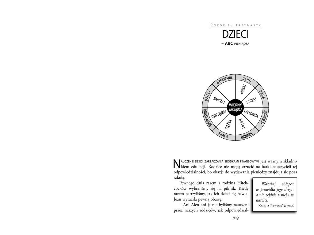 R o z d z i a ł t R z y n a s t y dzIECI – aBc Pieniądza ANIE DAW G AJ D ŁU AJ KA CIĘ Ż NE PRA HOJ IE WAN INWESTO WIERNY ZARZĄDCA CAŁK AJ OWIT ZĘDZ C A Z S O UCZ CIWOŚ Ć CI DZIE SZUK DA NAUC ZA J RA UNIK WY NIE DAWA CA n jest ważnym składnikiem edukacji Rodzice nie mogą zrzucić na barki nauczycieli tej odpowiedzialności, bo okazje do wydawania pieniędzy znajdują się poza szkołą Pewnego dnia razem z rodziną HitchWdrażaj chłopca cocków wybraliśmy się na piknik Kiedy w prawidła jego drogi, razem patrzyliśmy, jak ich dzieci się bawią, a nie zejdzie z niej i w Jean wyraziła pewną obawę: starości. – Ani Alen ani ja nie byliśmy nauczeni Księga PrzysŁów 22,6 przez naszych rodziców, jak odpowiedzialauczenie dzieci zarządzania środkami Finansowymi 129 130 / Rozdział Trzynasty Dzieci – ABC pieniądza / 131 nie obchodzić się z pieniędzmi, i obawiam się, że my jako rodzice nie postępujemy lepiej. Nasze dzieci nie pojmują wartości pieniądza. Co powinniśmy zrobić? – Jest to pytanie, na które powinni odpowiedzieć sobie wszyscy rodzice. W roku 1904 w Walii nastąpiło nadzwyczajne przebudzenie. Tysiące ludzi przychodziły do Chrystusa i były to nawrócenia niezwykłe. Zamykano bary ze względu na mały ruch w interesie. Policjanci zamienili swoją broń na białe rękawiczki, gdyż nie było przestępców. Konie nie rozumiały woźniców, bo ci przestali przeklinać. Z Walii na cały świat posyłano misjonarzy. Jeden z takich misjonarzy zawędrował do Argentyny, gdzie pewnego dnia na ulicy spotkał młodego chłopca, którego przyprowadził do Chrystusa. Chłopiec ten nazywał się Luis Palau. Niedługo potem był znany jako Billy Graham Ameryki Łacińskiej. Na początku lat 70. Palau pojechał do Walii, by dać wyraz swojej wdzięczności temu narodowi za pomoc w poznaniu Chrystusa. To, co tam zauważył, było zadziwiające. Mniej niż pół procent Walijczyków chodziło do kościoła. Rozwody były na porządku dziennym, a wskaźnik przestępczości szybko wzrastał. Zamknięto wiele kościołów i przerobiono je na bary, zaś gra w rugby stała się narodową religią. W wyniku tego doświadczenia Luis Palau wyprodukował film zatytułowany God Has No Grandchildren (Bóg nie ma wnuków). Przekaz płynący z tego filmu jest taki, że każde pokolenie jest odpowiedzialne za przekazywanie wiary kolejnemu pokoleniu. W Walii, pomimo ogromnego ożywienia duchowego na początku wieku, wpływ chrześcijaństwa całkowicie zaniknął pod koniec lat 70. Wynika z tego, że rodzicie nie przekazali swojej wiary dzieciom. Każde pokolenie jest odpowiedzialne za przekazywanie swoim dzieciom ewangelii i prawd Pisma Świętego, w tym także Bożych zasad zarządzania finansami. Odpowiedz sobie na jedno pytanie: Jak dobrze byłeś przygotowany do podejmowania decyzji finansowych w momencie opuszczenia swego domu rodzinnego? Rodzice i nauczyciele poświęcają kilkanaście lat na przygotowanie młodzieży do zawodu, a tylko kilka godzin przeznaczają na uczenie dzieci właściwego podejścia do pieniędzy, jakie zarobią w czasie kariery zawodowej, i sposobów ich wykorzystywania. Do uczenia biblijnych zasad zarządzania środkami materialnymi rodzice powinni wykorzystywać trzy metody: komunikację słowną, dawanie przykładu i praktyczne działanie. Komunikacja słowna Bóg nakazał Izraelitom: Niech pozostaną w twym sercu te słowa, które ja ci dziś nakazuję. Wpoisz je twoim synom, będziesz o nich mówił przebywając w domu, w czasie podróży, kładąc się spać i wstając ze snu (Księga Powtórzonego Prawa 6,6-7). Nauczanie Bożych dróg powinno odbywać się w sposób werbalny. Jednak nasze dzieci potrzebują czegoś więcej niż tylko instrukcji słownych. Potrzebują dobrego wzorca. Dobry przykład Dzieci przyswajają sobie postawy rodziców wobec pieniędzy tak, jak bibuła wchłania atrament. Rodzice powinni dawać dzieciom przykład dobrego zarządzania. Apostoł Paweł miał świadomość, jakie znaczenie ma dobry wzorzec, kiedy powiedział: Bądźcie naśladowcami moimi, tak jak ja jestem naśladowcą Chrystusa (1 List do Koryntian 11,1). Sam Bóg wykorzystuje te dwie metody. Dał nam Swoje Słowo oraz wysłał na świat doskonały wzór – Jezusa Chrystusa – który pokazał nam, jak powinniśmy żyć. Fragment z Ewangelii Łukasza 6,40 niesie ogromne wyzwanie dla rodziców. Czytamy w nim: Nie masz ucznia nad mistrza, ale należycie będzie przygotowany każdy, gdy będzie jak jego mistrz (BW). Innymi słowy, możemy nauczać tego, w co wierzymy, ale powielimy tylko to, kim jesteśmy. Musimy zatem być dobrym przykładem. Praktyczne działanie Dzieci muszą też mieć okazję do zastosowania w praktyce tego, co usłyszały i zobaczyły. Uczą się przez doświadczenia, z których kiedyś skorzystają w dziedzinie zarządzania pieniędzmi (sztuka mądrego wydawania) oraz zarabiania (wartość pracy). Zdobywanie doświadczenia w zarządzaniu pieniądzem 132 / Rozdział Trzynasty Dzieci – ABC pieniądza / 133 Częścią edukacji dziecka powinno być nauka dobrego zarządzania pieniędzmi. Rodzice muszą sami zająć się tą edukacją. Uczenie dzieci może odbywać się w pięciu obszarach: Rodzice powinni również powoli zwiększać dochód dziecka w miarę, jak jego umiejętności wzrastają, a ono wykazuje rozsądek w wydawaniu. Dochód Kiedy tylko dziecko jest gotowe do pójścia do szkoły, powinno otrzymywać pewien dochód, którym będzie dysponować. Rodzice muszą zdecydować, czy będą dawać dziecku kieszonkowe, czy ono samo ma zapracować na wypłatę. Wybierz sposób, który jest według ciebie najlepszy. Wysokość dochodu dziecka będzie zależała od takich czynników jak jego wiek, czy umiejętność zarabiania. Jednak sama kwota nie jest tak ważna, jak odpowiedzialność za rozporządzanie pieniędzmi. Początkowo jest to nowe doświadczenie i dziecko będzie popełniało błędy. Pozwól, by działało tu