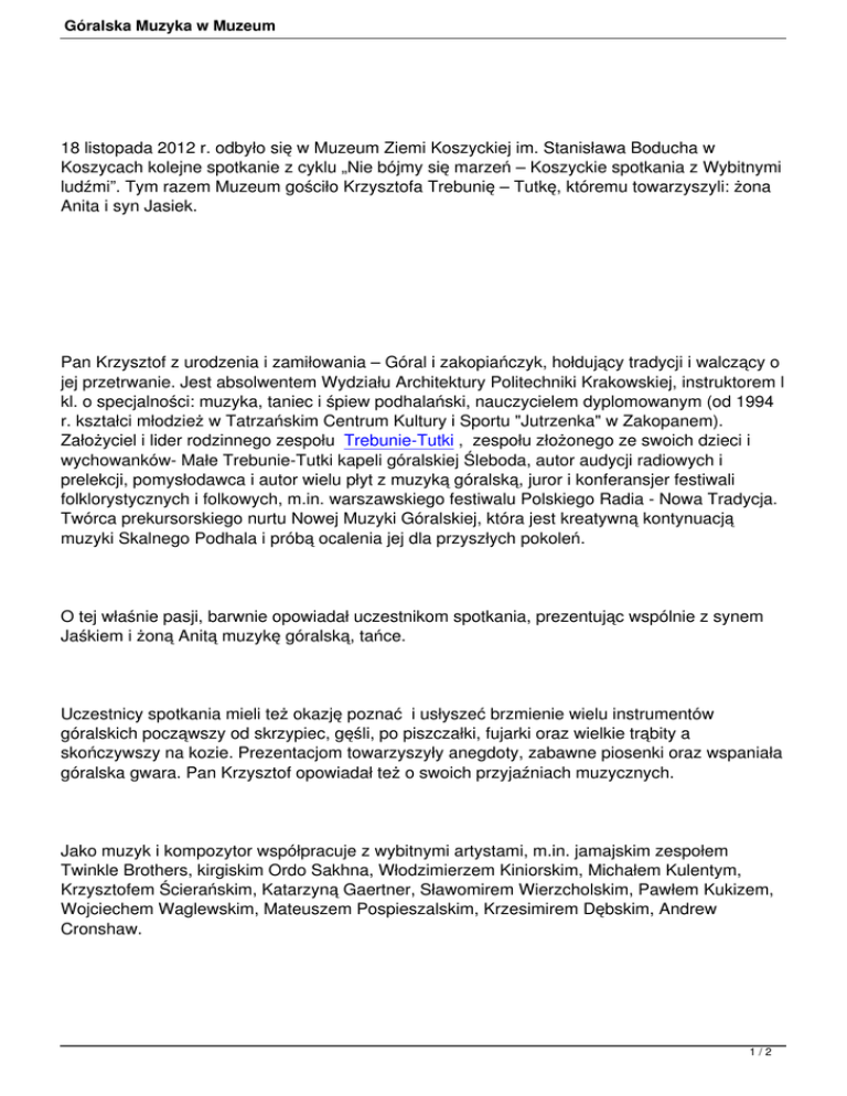 Góralska Muzyka w Muzeum 18 listopada 2012 r. odbyło się w Muzeum Ziemi Koszyckiej im. Stanisława Boducha w Koszycach kolejne spotkanie z cyklu „Nie bójmy się marzeń – Koszyckie spotkania z Wybitnymi ludźmi”. Tym razem Muzeum gościło Krzysztofa Trebunię – Tutkę, któremu towarzyszyli: żona Anita i syn Jasiek. Pan Krzysztof z urodzenia i zamiłowania – Góral i zakopiańczyk, hołdujący tradycji i walczący o jej przetrwanie. Jest absolwentem Wydziału Architektury Politechniki Krakowskiej, instruktorem l kl. o specjalności: muzyka, taniec i śpiew podhalański, nauczycielem dyplomowanym (od 1994 r. kształci młodzież w Tatrzańskim Centrum Kultury i Sportu "Jutrzenka" w Zakopanem). Założyciel i lider rodzinnego zespołu Trebunie-Tutki , zespołu złożonego ze swoich dzieci i wychowanków- Małe Trebunie-Tutki kapeli góralskiej Śleboda, autor audycji radiowych i prelekcji, pomysłodawca i autor wielu płyt z muzyką góralską, juror i konferansjer festiwali folklorystycznych i folkowych, m.in. warszawskiego festiwalu Polskiego Radia - Nowa Tradycja. Twórca prekursorskiego nurtu Nowej Muzyki Góralskiej, która jest kreatywną kontynuacją muzyki Skalnego Podhala i próbą ocalenia jej dla przyszłych pokoleń. O tej właśnie pasji, barwnie opowiadał uczestnikom spotkania, prezentując wspólnie z synem Jaśkiem i żoną Anitą muzykę góralską, tańce. Uczestnicy spotkania mieli też okazję poznać i usłyszeć brzmienie wielu instrumentów góralskich począwszy od skrzypiec, gęśli, po piszczałki, fujarki oraz wielkie trąbity a skończywszy na kozie. Prezentacjom towarzyszyły anegdoty, zabawne piosenki oraz wspaniała góralska gwara. Pan Krzysztof opowiadał też o swoich przyjaźniach muzycznych. Jako muzyk i kompozytor współpracuje z wybitnymi artystami, m.in. jamajskim zespołem Twinkle Brothers, kirgiskim Ordo Sakhna, Włodzimierzem Kiniorskim, Michałem Kulentym, Krzysztofem Ścierańskim, Katarzyną Gaertner, Sławomirem Wierzcholskim, Pawłem Kukizem, Wojciechem Waglewskim, Mateuszem Pospieszalskim, Krzesimirem Dębskim, Andrew Cronshaw. 1/2 Góralska Muzyka w Muzeum Wiele uwagi poświęcił swojej drugiej pasji – architekturze, opowiadając o wpływie kultury góralskiej na architekturę, prezentując przykłady wspaniałego stylu zakopiańskiego. Opowiadaniom i grze na instrumentach towarzyszyły pokazy multimedialne, w postaci fragmentów filmów z koncertów, zdjęć z podróży artystycznych po całym świecie a w szczególności najdłuższej obejmującej Chiny i Stany Zjednoczone. Sponsorem spotkania był Nadwiślański Bank Spółdzielczy w Solcu Zdroju. Zdjęcia 2/2