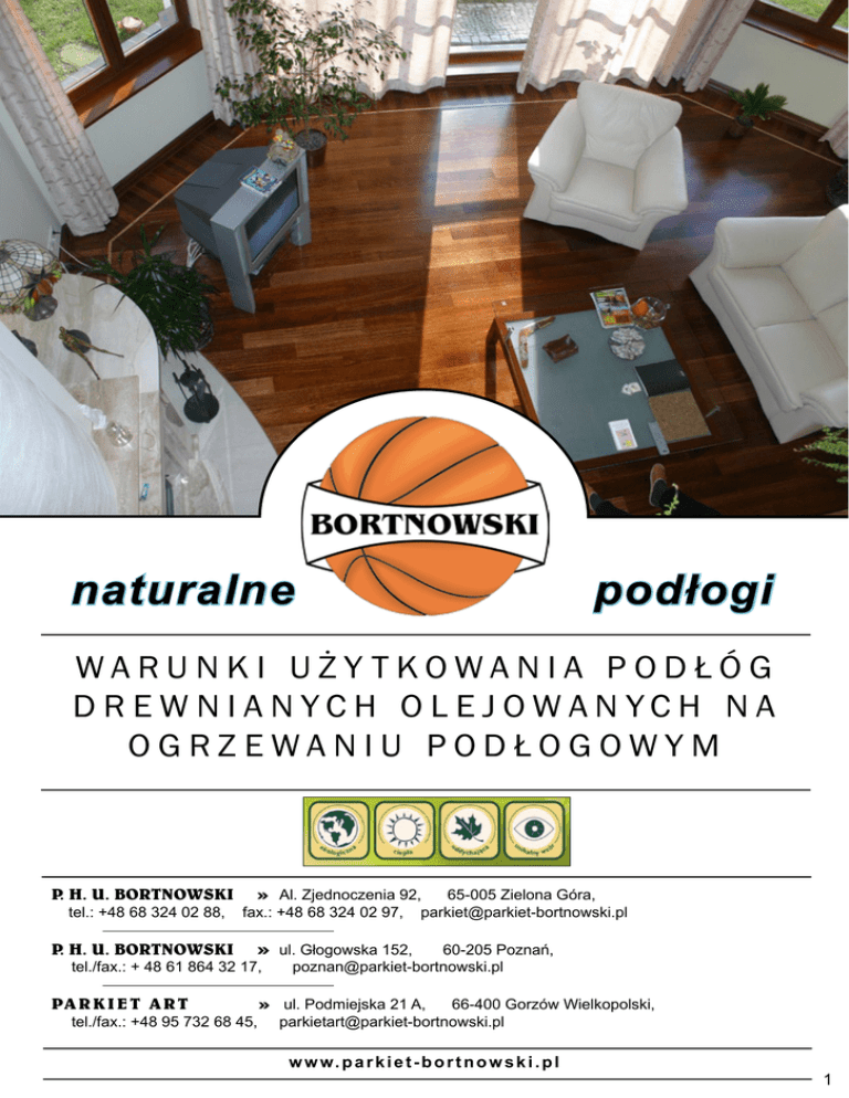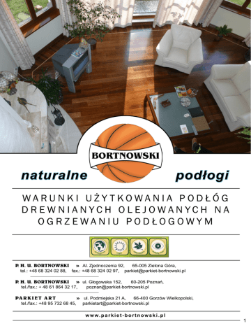naturalne podłogi WARUNKI UŻY TKOWANIA PODŁÓG D R E W N I A N Y C h o l e j owanyc h na ogr z ewaniu podłogowy m P. H. U. BORTNOWSKI tel.: +48 68 324 02 88, » Al. Zjednoczenia 92, 65-005 Zielona Góra, fax.: +48 68 324 02 97, [email protected] P. H. U. BORTNOWSKI » ul. Głogowska 152, PA R K I E T A R T » ul. Podmiejska 21 A, 66-400 Gorzów Wielkopolski, [email protected] tel./fax.: + 48 61 864 32 17, tel./fax.: +48 95 732 68 45, 60-205 Poznań, [email protected] w w w. p a r k i e t - b o r t n o w s k i . p l 1 WARUNKI UŻYTKOWANIA PODŁÓG DREWNIANYCH Zakupili Państwo ekologiczny wysokiej jakości naturalny pakiet wykonany w 100% z naturalnego drewna o wysokiej odporności użytkowej. Poza walorami estetycznymi parkiet jest także dobrym izolatorem termicznym, izolatorem akustycznym, dobrym regulatorem mikroklimatu i wilgotności powietrza i materiałem nie alergizującym. Co ważne jest przede wszystkim trwały i może być wielokrotnie odnawiany. Muszą państwo jednak mieć świadomość że nawet tego typu podłogi również zużywają się dlatego kilka podstawowych zasad powinno być przestrzeganych w celu wydłużenia jej żywotności: Drewno jest materiałem higroskopijnym, który rozszerza się gdy wilgotność powietrza rośnie lub kurczy gdy wilgotność spada. Może to powodować powstawanie szczelin, deformacje podłogi i drobne pęknięcia gdy wilgotność powierza jest za wysoka lub za niska w pewnym przedziale czasu. Może mieć to miejsce szczególnie zimą gdy wilgotność spada. Wówczas należy dowilżać pomieszczenia najlepiej za pomocą nawilżacza elektrycznego. Również w pomieszczeniach z klimatyzacją może wystąpić zjawisko zbyt niskiej wilgotności. Aby nie mieć problemów należy utrzymywać w pomieszczeniu klimat o wilgotności powietrza 45-60% i temperaturze ok. 18-22oC. Taki klimat jest najbardziej właściwy zarówno dla Państwa zdrowia jak również dla podłóg drewnianych. Podłoga nigdy nie może być nagrzana powyżej temperatury 24oC. Idealnym sposobem pielęgnacji jest używanie do czyszczenia tylko środków pielęgnacyjno – ochronnych wskazanych poniżej. Taka pielęgnacja powinna być powtarzana w zależności od natężenia ruchu. Po pielęgnacji nie może na powierzchni parkietu zalegać woda. Należy zapoznać się z instrukcją użytkowania załączoną do preparatu. Codzienna pielęgnacja może ograniczać się do zwykłego odkurzania bądź zamiatania podłogi. Piach lub brud powinien zostać pilnie usunięty ponieważ działając jak papier ścierny powoduje rysowanie podłogi i szybsze zużywanie się lakieru. Konieczne jest podklejenie krzeseł i mebli podkładkami filcowymi w celu wydłużenia żywotności podłogi wszelkie podkładki gumowe powodują trwałe przebarwienie drewna. Podłoga może zostać poddana wielokrotnej renowacji poprzez szlifowanie i lakierowanie. Ilość renowacji uzależniona jest od stabilności podłogi, głębokości uszkodzeń mechanicznych oraz od jakości maszyny szlifującej. Proszę pamiętać, że stosowanie powyższych zaleceń znacznie wydłuża żywotność drewnianych podłóg i zmniejsza ryzyko pracy ale nie wyklucza jej całkowicie. 1. Podłoga drewniana może być użytkowana tylko w obuwiu nieniszczącym mechanicznie, bez piasku i ostrych krawędzi. Piasek działa jak papier ścierny. Gwarancja nie obejmuje uszkodzeń mechanicznych, przetarć zarysowań. 2. Przed wejściami na parkiet powinny być umieszczone wycieraczki na całą szerokość korytarza w celu przechwytywania mokrego błota, brudu i piasku. 3. Ze względu na znaczną izolacyjność termiczną należy sprawdzać jak zachowuje się parkiet pod dywanami i chodnikami. W przypadku tworzenia się nadmiernych szczelin należy dywan lub chodnik usunąć. 2 4. Należy przestrzegać aby w trakcie użytkowania podłoga nie miała nigdy więcej jak 24 oC. Taka temperatura jest graniczną dla podłóg drewnianych. Zapewnia jednak mikroklimat odpowiedni dla człowieka. 5. Ze względu na dążenie drewna do równowagi higroskopijnej. Z otaczającym powietrzem wilgotność powietrza powinna być w przedziale 45-60%, a temperatura w przedziale 18-22 oC. W tym celu zimą można używać sztucznych nawilżaczy. Ze względu na brak możliwości kontroli klimatu przez naszą firmę, gwarancja obejmuje tylko użytkowanie drewna w granicach normy PN-EN 13 226, PN-EN 13 228 i PN-EN 13 489. Przesuszanie lub zawilgocenie drewna wykraczające poza tę normę i naturalna praca drewna w granicach normy nie może być przedmiotem reklamacji. 6. Usuwanie kurzu powinno być wykonywane lekko wilgotną ścierką z dodatkiem płynu pielęgnacyjnego. Podłogę należy sprzątać na sucho lub w miarę potrzeb na mokro nie używając dużej ilości wody a tylko mocno wykręconą szmatę ( nie używać tzw.„mopa” gdyż ze względu na niską wilgotność klepek może dojść do wykrawędziowania, wyłódkowania, a w skrajnym przypadku do wybrzuszenia parkietu). Nie mogą pod żadnym warunkiem po sprzątaniu pozostawać mokre ślady. Wszelkie uszkodzenia bądź zaplamienia podłogi spowodowane wylaniem wody i innych płynów lub działaniem wilgoci nie stanowią podstaw do reklamacji. 7. Wszelkie meble i urządzenia powinny być podklejone podkładkami filcowymi lub gumowymi. 8. Do foteli na rolkach należy stosować kółka miękkie tzw. rolki gumowe i biurowe przeźroczyste maty podkładowe ROLL-STOP. 9.Pielęgnację deski należy przeprowadzać tylko środkami Protektor Natura firmy Barlinek S.A. lub Carls firmy Bona. Nie wolno stosować typowych past do podłóg lub innych środków czyszczących na bazie silikonu! (mocno utrudni to następną renowację). Zaleca się przynajmniej raz na 6 miesięcy przeprowadzić polerowanie maszynowe parkietu wraz z pielęgnacją, polegającą na maszynowym umyciu i wtarciu płynu pielęgnacyjnego maszyną do polerowania 10. Nigdy nie należy przykrywać parkietu folią lub materiałami nieprzepuszczalnymi 