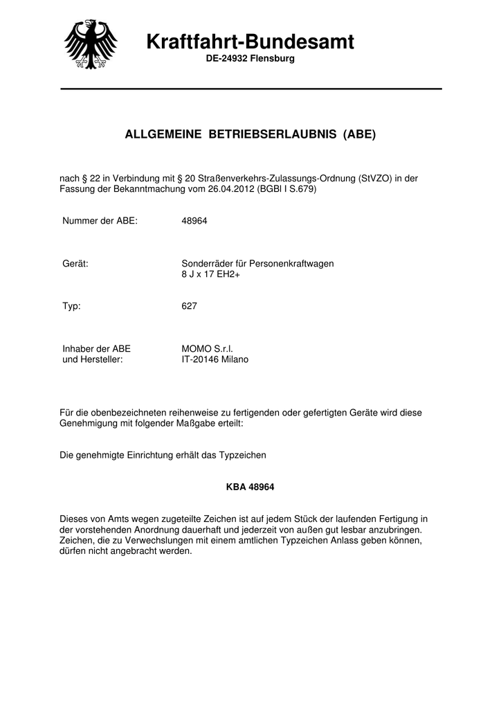 Kraftfahrt-Bundesamt DE-24932 Flensburg ALLGEMEINE BETRIEBSERLAUBNIS (ABE) nach § 22 in Verbindung mit § 20 Straßenverkehrs-Zulassungs-Ordnung (StVZO) in der Fassung der Bekanntmachung vom 26.04.2012 (BGBl I S.679) Nummer der ABE: 48964 Gerät: Sonderräder für Personenkraftwagen 8 J x 17 EH2+ Typ: 627 Inhaber der ABE und Hersteller: MOMO S.r.l. IT-20146 Milano Für die obenbezeichneten reihenweise zu fertigenden oder gefertigten Geräte wird diese Genehmigung mit folgender Maßgabe erteilt: Die genehmigte Einrichtung erhält das Typzeichen KBA 48964 Dieses von Amts wegen zugeteilte Zeichen ist auf jedem Stück der laufenden Fertigung in der vorstehenden Anordnung dauerhaft und jederzeit von außen gut lesbar anzubringen. Zeichen, die zu Verwechslungen mit einem amtlichen Typzeichen Anlass geben können, dürfen nicht angebracht werden. Kraftfahrt-Bundesamt DE-24932 Flensburg 2 Nummer der ABE: 48964 Die ABE-Nr. 48964 erstreckt sich auf die Sonderräder 8 J x 17 EH2+ , Typ 627, in den Ausführungen wie im Gutachten Nr. 366-0173-12-WIRD vom 09.07.2012 beschrieben. Die Sonderräder dürfen nur zur Verwendung mit den in den Anlagen Nr. 1 bis 5 des Gutachtens genannten Bereifungen unter den angegebenen Bedingungen an den dort aufgeführten bzw. beschriebenen Kraftfahrzeugen feilgeboten werden. Für die in dieser ABE freigegebenen Rad/Reifenkombinationen ist die Berichtigung der Zulassungsbescheinigung Teil I gemäß §13 Fahrzeug-Zulassungsverordnung (FZV) nicht erforderlich. An jedem Gerät der laufenden Fertigung sind an den aus den Prüfunterlagen ersichtlichen Stellen gut lesbar und dauerhaft, der Name des Herstellers oder das Herstellerzeichen, die Felgengröße, die Ausführungsbezeichnung des Sonderrades bestehend aus: Kennzeichnung des Rades und gegebenenfalls des Zentrierringes, das Herstelldatum (Monat, Jahr), das Typzeichen und die Einpreßtiefe anzubringen. Sofern Mittenzentrierringe verwendet werden, sind diese mit dem Innen- und Außendurchmesser zu kennzeichnen. Im übrigen gelten die im beiliegenden Gutachten nebst Anlagen des TÜV AUSTRIA AUTOMOTIVE GMBH, Wien, vom 09.07.2012 festgehaltenen Angaben. Das geprüfte Muster ist so aufzubewahren, dass es noch fünf Jahre nach Erlöschen der ABE in zweifelsfreiem Zustand vorgewiesen werden kann. Flensburg, 12.10.2012 Im Auftrag Anlagen: Nebenbestimmungen und Rechtsbehelfsbelehrung Gutachten Nr. 366-0173-12-WIRD, zur Genehmigung vorgelegt am: 04.10.2012 Kraftfahrt-Bundesamt DE-24932 Flensburg Nummer der ABE: 48964 - Anlage Nebenbestimmungen und Rechtsbehelfsbelehrung Nebenbestimmungen Die Einzelerzeugnisse der reihenweisen Fertigung müssen mit den Genehmigungsunterlagen genau übereinstimmen. Mit dem zugeteilten Typzeichen/Prüfzeichen dürfen die Fahrzeugteile nur gekennzeichnet werden, die den Genehmigungsunterlagen in jeder Hinsicht entsprechen. Änderungen an den Einzelerzeugnissen sind nur mit ausdrücklicher Zustimmung des Kraftfahrt-Bundesamtes gestattet. Änderungen der Firmenbezeichnung, der Anschrift und der Fertigungsstätten sowie eines bei der Erteilung der Genehmigung benannten Zustellungsbevollmächtigten oder bevollmächtigten Vertreters sind dem Kraftfahrt-Bundesamt unverzüglich mitzuteilen. Das Kraftfahrt-Bundesamt ist unverzüglich zu benachrichtigen, wenn die reihenweise Fertigung oder der Vertrieb der genehmigten Einrichtung innerhalb eines Jahres oder endgültig oder länger als ein Jahr eingestellt wird. Die Aufnahme der Fertigung oder des Vertriebs ist dann dem Kraftfahrt-Bundesamt unaufgefordert innerhalb eines Monats mitzuteilen. Verstöße gegen diese Bestimmungen können zum Widerruf der Genehmigung führen und können überdies strafrechtlich verfolgt werden. Die Genehmigung erlischt, wenn sie zurückgegeben oder entzogen wird, oder der genehmigte Typ den Rechtsvorschriften nicht mehr entspricht. Der Widerruf kann ausgesprochen werden, wenn die für die Erteilung und den Bestand der Genehmigung geforderten Voraussetzungen nicht mehr bestehen, wenn der Genehmigungsinhaber gegen die mit der Genehmigung verbundenen Pflichten – auch soweit sie sich aus den zu dieser Genehmigung zugeordneten besonderen Auflagen ergeben - verstößt oder wenn sich herausstellt, dass der genehmigte Typ den Erfordernissen der Verkehrssicherheit oder des Umweltschutzes nicht entspricht. Das Kraftfahrt-Bundesamt kann jederzeit die ordnungsgemäße Ausübung der durch diese Genehmigung verliehenen Befugnisse, insbesondere die genehmigungsgerechte Fertigung sowie die Maßnahmen zur Übereinstimmung der Produktion, nachprüfen. Es kann zu diesem Zweck Proben entnehmen oder entnehmen lassen. Dem Kraftfahrt-Bundesamt und/oder seinen Beauftragten ist ungehinderter Zutritt zu Produktions- und Lagerstätten zu gewähren. Die mit der Erteilung dieser Genehmigung verliehenen Befugnisse sind nicht übertragbar. Schutzrechte Dritter werden durch diese Genehmigung nicht berührt. Rechtsbehelfsbelehrung Gegen diese Genehmigung kann innerhalb eines Monats nach Bekanntgabe Widerspruch erhoben werden. Der Widerspruch ist beim Kraftfahrt-Bundesamt, Fördestraße 16, DE-24944 Flensburg, schriftlich oder zur Niederschrift einzulegen. TÜV AUSTRIA AUTOMOTIVE GMBH Räder- und Reifenprüfung Deutschstraße 10 A-1230 Wien 12-TAAP-2137 Seite: 1 von 3 GUTACHTEN ZUR ERTEIL UNG DER ABE 4896 4 366-0173-12-WIRD Antragsteller: Momo S.r.l. 20146 Milano Art: Sonderrad 8 J X 17 EH2+ Typ: 627 Die in den Anlagen aufgeführten Fahrzeugtypen entsprechen auch nach erfolgter Umrüstung den heute gültigen Vorschriften der StVZO. Das vorliegende Gutachten zur Erteilung der ABE 48964 verliert seine Gültigkeit, wenn sich durch Umrüstung berührte Bauvorschriften der StVZO ändern oder an den Kraftfahrzeugen Änderungen eintreten, die die Begutachtungspunkte beeinflussen. I. Übersicht Ausführung Ausführungsbezeichnung Kennzeichnung Rad Kennzeichnung Zentrierring D11 112548571 LK 112 I.1. Ø72.2/Ø57.1 Lochkreis (mm) / -zahl 112/5 Mitten Einloch preß(mm) tiefe 