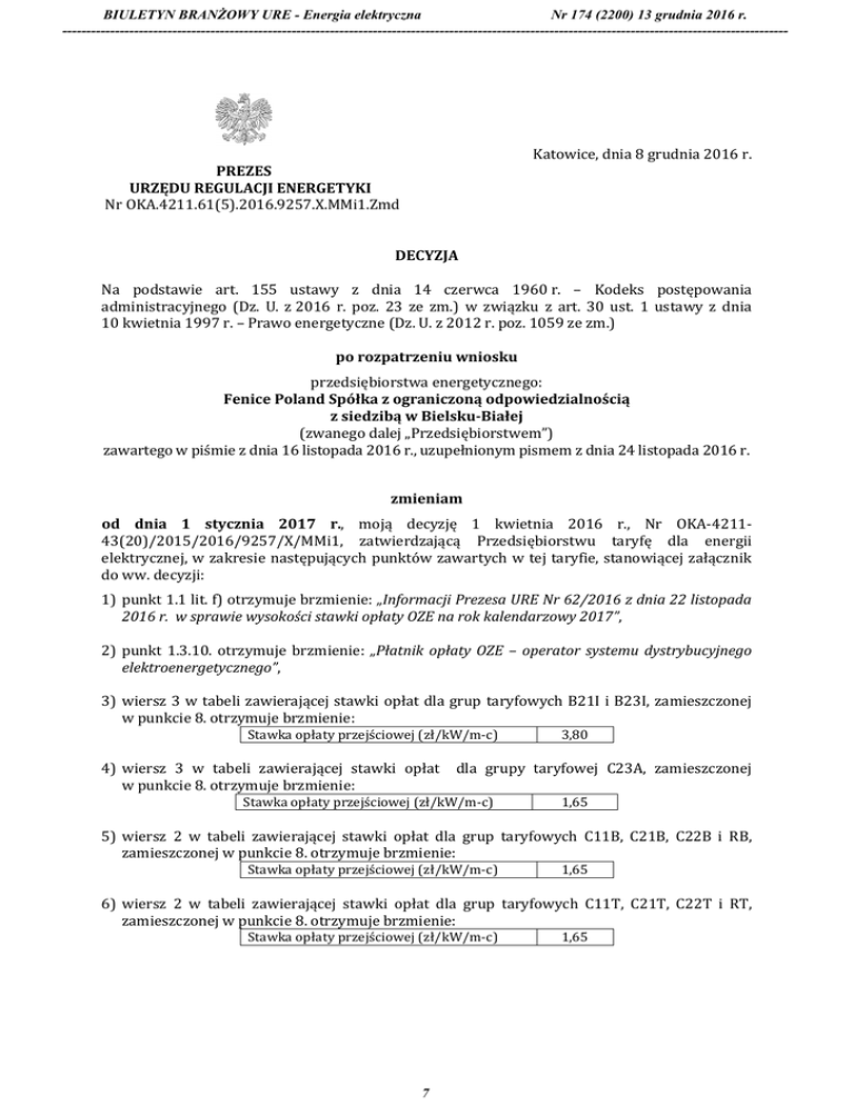 BIULETYN BRANŻOWY URE - Energia elektryczna Nr 174 (2200) 13 grudnia 2016 r. -------------------------------------------------------------------------------------------------------------------------------------------------------- Katowice, dnia 8 grudnia 2016 r. PREZES URZĘDU REGULACJI ENERGETYKI Nr OKA.4211.61(5).2016.9257.X.MMi1.Zmd DECYZJA Na podstawie art. 155 ustawy z dnia 14 czerwca 1960 r. – Kodeks postępowania administracyjnego (Dz. U. z 2016 r. poz. 23 ze zm.) w związku z art. 30 ust. 1 ustawy z dnia 10 kwietnia 1997 r. – Prawo energetyczne (Dz. U. z 2012 r. poz. 1059 ze zm.) po rozpatrzeniu wniosku przedsiębiorstwa energetycznego: Fenice Poland Spółka z ograniczoną odpowiedzialnością z siedzibą w Bielsku-Białej (zwanego dalej „Przedsiębiorstwem”) zawartego w piśmie z dnia 16 listopada 2016 r., uzupełnionym pismem z dnia 24 listopada 2016 r. zmieniam od dnia 1 stycznia 2017 r., moją decyzję 1 kwietnia 2016 r., Nr OKA-421143(20)/2015/2016/9257/X/MMi1, zatwierdzającą Przedsiębiorstwu taryfę dla energii elektrycznej, w zakresie następujących punktów zawartych w tej taryfie, stanowiącej załącznik do ww. decyzji: 1) punkt 1.1 lit. f) otrzymuje brzmienie: „Informacji Prezesa URE Nr 62/2016 z dnia 22 listopada 2016 r. w sprawie wysokości stawki opłaty OZE na rok kalendarzowy 2017”, 2) punkt 1.3.10. otrzymuje brzmienie: „Płatnik opłaty OZE – operator systemu dystrybucyjnego elektroenergetycznego”, 3) wiersz 3 w tabeli zawierającej stawki opłat dla grup taryfowych B21I i B23I, zamieszczonej w punkcie 8. otrzymuje brzmienie: Stawka opłaty przejściowej (zł/kW/m-c) 4) wiersz 3 w tabeli zawierającej stawki opłat w punkcie 8. otrzymuje brzmienie: 3,80 dla grupy taryfowej C23A, zamieszczonej Stawka opłaty przejściowej (zł/kW/m-c) 1,65 5) wiersz 2 w tabeli zawierającej stawki opłat dla grup taryfowych C11B, C21B, C22B i RB, zamieszczonej w punkcie 8. otrzymuje brzmienie: Stawka opłaty przejściowej (zł/kW/m-c) 1,65 6) wiersz 2 w tabeli zawierającej stawki opłat dla grup taryfowych C11T, C21T, C22T i RT, zamieszczonej w punkcie 8. otrzymuje brzmienie: Stawka opłaty przejściowej (zł/kW/m-c) 7 1,65 BIULETYN BRANŻOWY URE - Energia elektryczna Nr 174 (2200) 13 grudnia 2016 r. -------------------------------------------------------------------------------------------------------------------------------------------------------- 7) wiersz 2 w tabeli zawierającej stawki opłat dla grup taryfowych C11D i C23D, zamieszczonej w punkcie 8. otrzymuje brzmienie: Stawka opłaty przejściowej (zł/kW/m-c) 1,65 8) wiersz 2 w tabeli zawierającej stawki opłat dla grup taryfowych C11R, C21R, C22R i B23R, zamieszczonej w punkcie 8. otrzymuje brzmienie: Stawka opłaty przejściowej (zł/kW/m-c) 1,65 3,80 9) wiersz 2 w tabeli zawierającej stawki opłat dla grup taryfowych C11Z, C21Z, C22Z, B21Z i B23Z, zamieszczonej w punkcie 8. otrzymuje brzmienie: Stawka opłaty przejściowej (zł/kW/m-c) 1,65 3,80 10) wiersze 4, 5, 6 i 7 w tabeli zawierającej cenę i stawki opłat dla grupy taryfowej G11Z zamieszczonej w punkcie 8. otrzymują brzmienie: Stawka opłaty przejściowej w zł/m-c, w tym: poniżej 500 kWh energii elektrycznej od 500 do 1200 kWh energii elektrycznej powyżej 1200 kWh energii elektrycznej 0,45 1,90 6,50 11) wiersz 2 w tabeli zawierającej stawki opłat dla grup taryfowych C11H i C21H, zamieszczonej w punkcie 8. otrzymuje brzmienie: Stawka opłaty przejściowej (zł/kW/m-c) 1,65 12) zapis pod tabelami, w pukcie 8. otrzymuje brzmienie: „We wszystkich grupach taryfowych wprowadza się stawkę opłaty OZE w wysokości 3,70 zł/MWh, wskazanej w Informacji Prezesa URE, o której mowa w pkt 1.1 lit. f) niniejszej taryfy”. UZASADNIENIE Decyzją z dnia 1 kwietnia 2016 r., Nr OKA-4211-43(20)/2015/2016/9257/X/MMi1, Prezes Urzędu Regulacji Energetyki zatwierdził Przedsiębiorstwu taryfę dla energii elektrycznej na okres 12 miesięcy od dnia wprowadzenia tej taryfy do stosowania. Pismem z dnia 16 listopada 2016 r., uzupełnionym pismem z dnia 24 listopada 2016 r., Przedsiębiorstwo wniosło o zatwierdzenie zmiany taryfy dla energii elektrycznej w zakresie stawek opłaty przejściowej i stawki opłaty OZE na rok 2017. Zmiana ta wynika z konieczności zastąpienia: - stawek opłaty przejściowej, obowiązujących w 2016 r., stawkami zawartymi w art. 11 a) ustawy z dnia 29 czerwca 2007 r. o zasadach pokrywania kosztów powstałych u wytwórców w związku z przedterminowym rozwiązaniem umów długoterminowych sprzedaży mocy i energii elektrycznej (Dz. U. z 2007 r. Nr 130, poz. 905, z późn. zm.) – dodanym ustawą z dnia 22 czerwca 2016 r. o zmianie ustawy o odnawialnych źródłach energii oraz niektórych innych ustaw (Dz.U. z 2016 r. poz. 925); - stawki opłaty OZE, obowiązującej w II połowie 2016 r., stawką wynikającą z Informacji Prezesa URE Nr 62/2016 z dnia 22 listopada 2016 r. w sprawie wysokości stawki opłaty OZE na rok kalendarzowy 2017. Zgodnie z art. 155 Kodeksu postępowania administracyjnego, decyzja ostateczna, na mocy której strona nabyła prawo, może być w każdym czasie za zgodą strony uchylona lub zmieniona przez organ administracji publicznej, który ją wydał, jeżeli przepisy szczególne nie sprzeciwiają się uchyleniu lub zmianie takiej decyzji i przemawia za tym interes społeczny lub słuszny interes strony. W niniejszej sprawie uznano, że zostały spełnione przesłanki określone w powyższym przepisie, umożliwiające niniejszą zmianę, w związku z czym orzeczono jak w sentencji. 2 8 BIULETYN BRANŻOWY URE - Energia elektryczna Nr 174 (2200) 13 grudnia 2016 r. -------------------------------------------------------------------------------------------------------------------------------------------------------- POUCZENIE 1. Od niniejszej decyzji przysługuje odwołanie do Sądu Okręgowego w Warszawie – Sądu Ochrony Konkurencji i Konsumentów, za moim pośrednictwem, w terminie dwutygodniowym