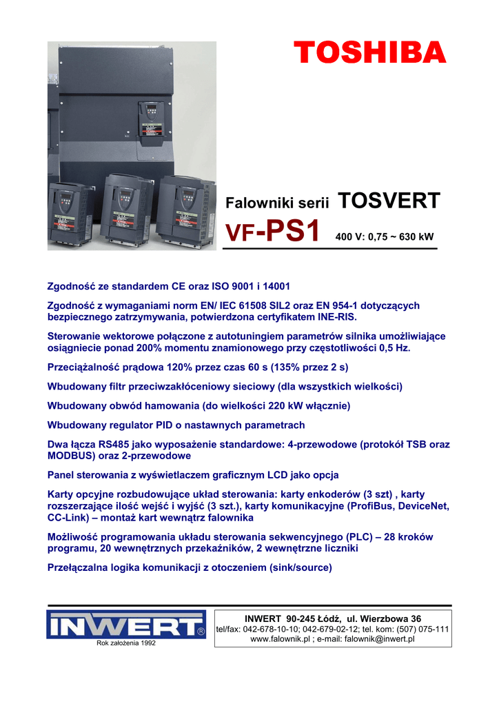 TOSHIBA Falowniki serii TOSVERT VF-PS1 400 V: 0,75 ~ 630 kW Zgodność ze standardem CE oraz ISO 9001 i 14001 Zgodność z wymaganiami norm EN/ IEC 61508 SIL2 oraz EN 954-1 dotyczących bezpiecznego zatrzymywania, potwierdzona certyfikatem INE-RIS. Sterowanie wektorowe połączone z autotuningiem parametrów silnika umoŜliwiające osiągniecie ponad 200% momentu znamionowego przy częstotliwości 0,5 Hz. PrzeciąŜalność prądowa 120% przez czas 60 s (135% przez 2 s) Wbudowany filtr przeciwzakłóceniowy sieciowy (dla wszystkich wielkości) Wbudowany obwód hamowania (do wielkości 220 kW włącznie) Wbudowany regulator PID o nastawnych parametrach Dwa łącza RS485 jako wyposaŜenie standardowe: 4-przewodowe (protokół TSB oraz MODBUS) oraz 2-przewodowe Panel sterowania z wyświetlaczem graficznym LCD jako opcja Karty opcyjne rozbudowujące układ sterowania: karty enkoderów (3 szt) , karty rozszerzające ilość wejść i wyjść (3 szt.), karty komunikacyjne (ProfiBus, DeviceNet, CC-Link) – montaŜ kart wewnątrz falownika MoŜliwość programowania układu sterowania sekwencyjnego (PLC) – 28 kroków programu, 20 wewnętrznych przekaźników, 2 wewnętrzne liczniki Przełączalna logika komunikacji z otoczeniem (sink/source) INWERT 90-245 Łódź, ul. Wierzbowa 36 Rok załoŜenia 1992 tel/fax: 042-678-10-10; 042-679-02-12; tel. kom: (507) 075-111 www.falownik.pl ; e-mail: [email protected] DANE TECHNICZNE TOSVERT Napięcie Obwody mocy zasilania Sterowanie Zalecana moc silnika (kW) Moc wyj. falownika (kVA) Napięcie wyjściowe (V) Prąd wyjściowy (A) PrzeciąŜalność prądowa Obwód hamowania Częstotliwość nośna PWM Filtr sieciowy Dławik DC Stopień ochrony obudowy TOSVERT Napięcie zasilania -obwody mocy Zalecana moc silnika (kW) Moc wyj. falownika (kVA) Napięcie wyjściowe (V) Prąd wyjściowy (A) PrzeciąŜalność prądowa Obwód hamowania Częstotliwość komutacji Filtr sieciowy Dławik DC Stopień ochrony obudowy VF-PS1 ..... 4007 4015 4022 4037 4055 4075 4110 4150 4185 4220 4300 4370 4450 4550 4750 PL PL PL PL PL PL PL PL PL PL PL PL PL PL PL 3 x 380 ... 480 V +10% - 15% (±10% przy pełnym obciąŜeniu), 50/60 Hz ±5% Opcja: niezaleŜne zasilanie obwodów sterowania 0,75 1,5 55 75 1,8 3,1 4,4 8,0 11 13 21 25 31 37 50 60 72 88 3 x 380 ... 480 V (maks. napięcie wyjściowe jest równe napięciu sieci zasilającej) 2,3 4,1 5,8 10,5 14,3 17,6 27,7 33 41 48 66 79 94 116 120 % prądu wyjściowego przez 60 s, 135% przez 2 s Obwód hamowania: wbudowany, opornik hamowania: zewnętrzny (opcja) 1 ... 16 kHz Wbudowany Opcja: zewnętrzny dławik DC Wbudowany IP20 (JEM 1030) 2,2 3,7 5,5 7,5 11 15 18,5 22 30 37 45 122 160 VF-PS1 ..... 4900 PC 4110 KPC 4132 KPC 4160 KPC 4220 KPC 4250 KPC 4280 KPC 4315 KPC 4400 KPC 4500 KPC 4630 KPC 500 630 3 x 380 ... 440 V +10% - 15% (±10% przy pełnym obciąŜeniu), 50 Hz ±5% 3 x 380 ... 480 V +10% - 15% (±10% przy pełnym obciąŜeniu), 60 Hz ±5% 90 110 132 160 220 250 280 315 400 136 164 197 239 325 367 419 469 578 717 905 3 x 380 ... 480 V (maks. napięcie wyjściowe jest równe napięciu sieci zasilającej) 179 215 259 314 427 481 550 616 759 941 1188 120 % prądu wyjściowego przez 60 s, 135% przez 2 s Wbudowany, Opcja: opornik zewnętrzny Opcja: zewnętrzny obwód hamowania i opornik 1 ... 8 kHz Wbudowany Opcja: dławik DC dobudowany do falownika IP00 (JEM 1030) Dla wszystkich wielkości falowników VF-PS1 Częstotliwość wyjściowa Charakterystyki U/f Rozruch i zatrzymywanie Zabezpieczenia Zapobieganie wyłączeniom awaryjnym Wejścia sterownicze (wykonanie standardowe, Wyjścia sterownicze (wykonanie standardowe) Komunikacja Miejsce zainstalowania Temperatura otoczenia Wilgotność względna Zgodność z dyrektywami WyposaŜenie dodatkowe TOSHIBA VFAS1 0,0 ... 500 Hz (częstotliwość maksymalna: 30 do 500 Hz) Charakterystyka U/f liniowa i kwadratowa oraz dowolnie programowana (5-punktowa), bezczujnikowe sterowanie wektorowe, sterowanie wektorowe ze sprzęŜeniem zwrotnym, automatyczne podbicie momentu obrotowego. Auto-tuning silnika, praca energooszczędna 0,01 ... 6000 s, do wyboru 4 czasy oraz 4 kształty krzywych rozruchu i zatrzymywania Ochrona przed utykiem, przeciąŜenie prądowe, przekroczenie poziomu prądu i napięcia, zwarcie i doziemienie w obwodzie zasilania falownika, elektroniczny przekaźnik termiczny silnika, przeciąŜenie prądowe podczas rozruchu (w obwodzie zasilania i silnika), przeciąŜenie opornika hamującego, przekroczenie dopuszczalnej temperatury, zewnętrzny stop awaryjny Podtrzymanie pracy po zaniku zasilania, samoczynny ponowny rozruch, przełączanie zasilania silnika z falownika na sieć, sygnalizacja zagroŜenia wyłączeniem awaryjnym 3 wejścia analogowe: VI/II (0...10 V /0(4)...20 mA), RX (-10 V ... +10 V) oraz RR/S4 (0 ... 10 V) (przełączalne na wejście cyfrowe) 8 wejść binarnych: F, R, ST, RES, S1, S2 i S3 oraz RR/S4 (przełączalne na wej. analogowe) Przeznaczenie wejść programowane 2 wyjścia: AM (7,5/10 V lub 0(4)-20 mA) i FM (7,5/10 V, 1 mA) 3 wyjścia binarne: FL (przekaźnikowe), OUT1 i OUT2 (typu OC) 1 wyjście impulsowe FP Przeznaczenie wyjść programowane Łącze RS485 4-przewodowe (protokół MODBUS, TSB), RS485 2-przewodowe Opcje: moduły ProfiBus, DeviceNet, CC-Link Zainstalowanie w pomieszczeniu wewnątrz budynku na wysokości do 3000 m n.p.m. (powyŜej 1000 m n.p.m. redukcja obciąŜenia) bez naraŜenia na bezpośrednie działanie światła słonecznego oraz Ŝrących lub łatwopalnych par, gazów i cieczy. o o o -10 ... +40 C (do +50 C po zdemontowaniu górnej osłony uszczelniającej, do +60 C przy o redukcji obciąŜenia); magazynowanie -25 ... +65 C 20 … 93% (bez kondensacji pary wodnej) CE (kompatybilność elektromagnetyczna EMC pod warunkiem właściwego zainstalowania) Panel graficzny LCD, panel LED (cyfry 20 mm) z funkcją kopiowania nastaw parametrów Konwerter RS4/USB, płytki rozszerzające ilość wejść i wyjść binarnych i analogowych, płytki do