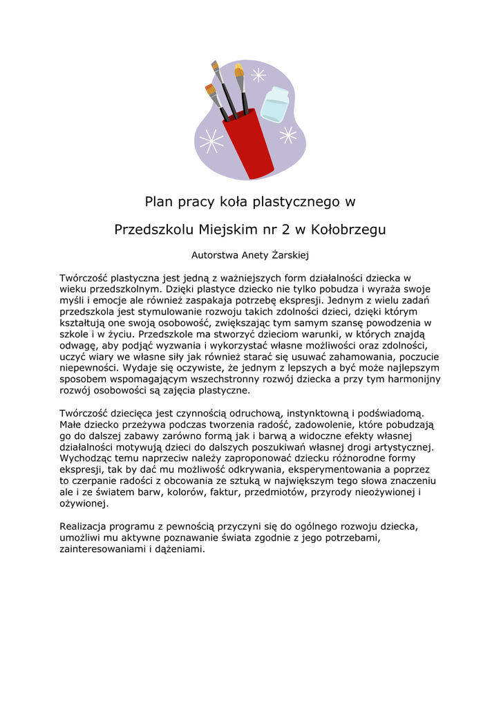 Plan pracy koła plastycznego w Przedszkolu Miejskim nr 2 w Kołobrzegu Autorstwa Anety Żarskiej Twórczość plastyczna jest jedną z ważniejszych form działalności dziecka w wieku przedszkolnym. Dzięki plastyce dziecko nie tylko pobudza i wyraża swoje myśli i emocje ale również zaspakaja potrzebę ekspresji. Jednym z wielu zadań przedszkola jest stymulowanie rozwoju takich zdolności dzieci, dzięki którym kształtują one swoją osobowość, zwiększając tym samym szansę powodzenia w szkole i w życiu. Przedszkole ma stworzyć dzieciom warunki, w których znajdą odwagę, aby podjąć wyzwania i wykorzystać własne możliwości oraz zdolności, uczyć wiary we własne siły jak również starać się usuwać zahamowania, poczucie niepewności. Wydaje się oczywiste, że jednym z lepszych a być może najlepszym sposobem wspomagającym wszechstronny rozwój dziecka a przy tym harmonijny rozwój osobowości są zajęcia plastyczne. Twórczość dziecięca jest czynnością odruchową, instynktowną i podświadomą. Małe dziecko przeżywa podczas tworzenia radość, zadowolenie, które pobudzają go do dalszej zabawy zarówno formą jak i barwą a widoczne efekty własnej działalności motywują dzieci do dalszych poszukiwań własnej drogi artystycznej. Wychodząc temu naprzeciw należy zaproponować dziecku różnorodne formy ekspresji, tak by dać mu możliwość odkrywania, eksperymentowania a poprzez to czerpanie radości z obcowania ze sztuką w największym tego słowa znaczeniu ale i ze światem barw, kolorów, faktur, przedmiotów, przyrody nieożywionej i ożywionej. Realizacja programu z pewnością przyczyni się do ogólnego rozwoju dziecka, umożliwi mu aktywne poznawanie świata zgodnie z jego potrzebami, zainteresowaniami i dążeniami. Program zawiera: założenie programu korzyści dla placówki główny cel edukacyjny i cele szczegółowe przewidywane osiągnięcia dzieci zadania nauczyciela umiejętności i wiadomości jakie dziecko powinno zdobyć podczas zajęć kółka plastycznego metody formy realizacji ewaluacja plan pracy- przykładowe działania twórcze z dziećmi Założenia programu: Program jest zgodny z Podstawą Programową Wychowania Przedszkolnego, Program kierowany jest do dzieci uzdolnionych plastycznie w grupie liczącej nie więcej niż 8 wychowanków, Program realizowany będzie w ramach koła plastycznego poza godzinami pracy dydaktycznej w wymiarze 45 min tygodniowo przez okres jednego roku szkolnego, Program podzielony jest na miesięczne jednostki tematyczne, które mogą ulec zmianie w zależności od potrzeb i kreatywności dzieci. Korzyści dla placówki: Promowanie przedszkola i wychowanków w środowisku, poprzez udział dzieci w konkursach na etapie przedszkolnym, miejskim, rejonowym i innym. Cel główny programu: Rozwijanie uzdolnień i zainteresowań artystycznych dzieci oraz ich wrodzonych możliwości twórczych poprzez różnorodne działania plastyczne. Cele szczegółowe: kształtowanie wrażliwości oraz ekspresji plastycznej, stwarzanie okazji do poznawania różnorodnych technik plastycznych oraz do eksperymentowania różnym materiałem, wyrażanie swojej wiedzy, przeżyć i doświadczeń za pomocą plastycznych środków wyrazu, kształtowanie twórczej postawy, kreatywności aktywizowanie procesów poznawczych, kształtowanie zainteresowania wytworami artystycznymi- dziełami sztuki poprzez obcowanie z malarstwem (reprodukcje obrazów), architekturą, wytworami sztuki ludowej, fotografią , rozwijanie wrażliwości zmysłowej, estetycznej, kształtowanie umiejętności współdziałania w zespole, odkrywanie i budzenie wiary we własne możliwości i zdolności, rozwijanie dyspozycji psychicznych – samodzielności, wytrwałości, umiejętności planowania, dokonywania właściwych wyborów, własnego potencjału pozytywnych wartości. Przewidywane osiągnięcia dzieci: dostrzega piękno w otaczającym go świecie i przedstawia za pomocą działań plastycznych swoje przeżycia i wiedzę, posługuje się plamą, linią, szeroką paletą barw, poznaje i nazywa odcienie kolorów, stosuje różnorodne techniki plastyczne, eksperymentuje z materiałem i tworzywem plastycznym, sprawnie posługuje się materiałami i narzędziami plastycznymi, potrafi pracować w zespole, podejmuje samodzielnie pracę, jest wytrwałe, pełne inwencji i inicjatywy; systematyczne, umiejętnie planuje swoją pracę, potrafi wyrazić słowami ogólne wrażenia na temat oglądanych dzieł sztuki, rozpoznaje najważniejsze zabytki znajdujące się w jego mieście lub najbliższej okolicy(np. Bazylika Konkatedralna) oraz wybrane pomniki i budowle o charakterystycznej architekturze np. Pomnik Sanitariuszki, Pomnik Zaślubin, Ratusz. Zadania nauczyciela: organizuje miejsce pracy do działań plastycznych, inspiruje dzieci, motywuje do zabawy plastyką poprzez wyzwalanie w nich ciekawości, rozwijanie wyobraźni i fantazji, tworzy klimat sprzyjający pracy twórczej, zachęca dziecko do tworzenia, odkrywania, wypowiadania się w różnych technikach plastycznych i przy użyciu elementarnych środków wyrazu, prostych kompozycji i form konstrukcyjnych, zaspakaja potrzebą bezpieczeństwa, akceptacji, swobody, tworzy sytuacje edukacyjne sprzyjające samodzielnemu myśleniu i rozwiązywaniu zadań. Umiejętności i wiadomości jakie dziecko powinno zdobyć podczas zajęć kółka plastycznego: Rysuje kredką świecową, pastelową, mazakiem, kredą, patykiem, węglem, świecą na różnych rodzajach papieru, Maluje na różnorodnym materiale: na papierze, tekturze falistej, gazecie itp. o różnych formatach i wielkościach; malowanie farbami plakatowymi, akwarelami, palcami i z użyciem pędzli i innych przedmiotów- przyborów. Komponuje całą płaszczyznę, próbuje stosować zasadę stosowania proporcji i aranżowania perspektywy. Rysuje i maluje inspirowane muzyką, literaturą, własnymi przeżyciami, z zastosowaniem różnych form i t