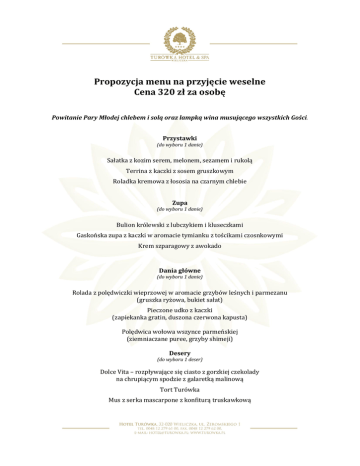 Propozycja menu na przyjęcie weselne Cena 320 zł za osobę Powitanie Pary Młodej chlebem i solą oraz lampką wina musującego wszystkich Gości. Przystawki (do wyboru 1 danie) Sałatka z kozim serem, melonem, sezamem i rukolą Terrina z kaczki z sosem gruszkowym Roladka kremowa z łososia na czarnym chlebie Zupa (do wyboru 1 danie) Bulion królewski z lubczykiem i kluseczkami Gaskońska zupa z kaczki w aromacie tymianku z tościkami czosnkowymi Krem szparagowy z awokado Dania główne (do wyboru 1 danie) Rolada z polędwiczki wieprzowej w aromacie grzybów leśnych i parmezanu (gruszka ryżowa, bukiet sałat) Pieczone udko z kaczki (zapiekanka gratin, duszona czerwona kapusta) Polędwica wołowa wszynce parmeńskiej (ziemniaczane puree, grzyby shimeji) Desery (do wyboru 1 deser) Dolce Vita – rozpływające się ciasto z gorzkiej czekolady na chrupiącym spodzie z galaretką malinową Tort Turówka Mus z serka mascarpone z konfiturą truskawkową Przekąski zimne podawane w formie stołu szwedzkiego (do wyboru 6 przekąsek) Kompozycja mięs pieczonych, szynka z kością wędzona kiełbasa wiejska, kiełbasa lisiecka, pasztet francuski kaczka pieczona w pomarańczach, boczek rolowany z ziołami gęś faszerowana jabłkiem Ryby (do wyboru 3 przekąski) Łosoś zawijany z szpinakiem, łosoś wędzony ryby faszerowane, kompozycje śledziowe Sałatki (do wyboru 4 sałatki) Sałatka Turówka, sałatka warzywna, sałatka z wędzonego kurczaka, sałatka warstwowa, sałatka grecka, pomidorki faszerowane Sos chrzanowy, sos tatarski, sos cumberland, sos andaluzyjski Deski serów Bufet słodki (do wyboru 4 ciasta) Sernik Ciasto wiśniowo - orzechowe Ciasto jogurtowe Rolada z kremem cappuccino i rumianą bezą Szarlotka na kruchym Czekoladowe ciastko z porzeczkami Piernik z konfiturą i bakaliami Musy owocowo czekoladowe Owoce Tort Weselny wykonany w pracowni cukierniczej Restauracji Turówka (do wyboru) Tort „Turówka” (tort czekoladowo-jabłkowy) Tort orzechowy Tort cappuccino z ananasem Tort bezowy Tort waniliowo - migdałowy Dodatkowe trzy dania gorące podawane podczas przyjęcia weselnego (do wyboru 3 dania) Boeuf Strogonow z chrupiącym pieczywem Pierś z kurczaka z serem brie, grillowanymi pomidorkami, ziemniaki opiekane Galicyjski żur z białą kiełbasą i kurkami Staropolska kwaśnica na kurkach Barszcz czerwony z kapuśniaczkiem Pieczona szynka w miodzie z gniocci i gołąbkiem z czerwonej kapusty Napoje (podawane bez ograniczeń) Kawa, herbata, woda mineralna, soki, napoje gazowane Alkohole podawane bez ograniczeń (do godz. 5:00 rano) Wino wytrawne białe i czerwone Neblina Wódka (do wyboru: Wyborowa, Absolut, Smirnoff Vladimir) Piwo Kasztelan Niepasteryzowany