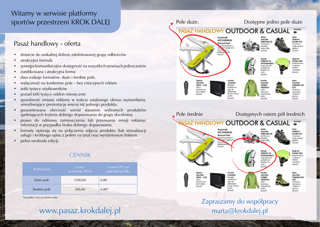 h Witamy w serwisie platformy sportów przestrzeni KROK DALEJ Pole duże. Dostępne jedno pole duże Pasaż handlowy - oferta • • • • • • • • • • • • • dotarcie do unikalnej dobrze zdefiniowanej grupy odbiorców atrakcyjna formuła synergia komunikacyjna-dostępność na wszystkich serwisach jednocześnie zunifikowana i atrakcyjna forma dwa rodzaje formatów: duże i średnie pole. wyłączność na konkretne pole – bez rotacyjnych reklam setki tysięcy użytkowników ponad 600 tysięcy odsłon miesięcznie sposobność zmiany reklamy w trakcie ustalonego okresu wyświetlania, umożliwiające prezentację więcej niż jednego produktu. gwarantowana obecność wśród starannie wybranych produktów spełniających kryteria dobrego dopasowania do grupy docelowej. prawo do odmowy zamieszczenia lub przerwania emisji reklamy/ informacji w przypadku braku dobrego dopasowania. formaty opierają się na połączeniu zdjęcia produktu (lub wizualizacji usługi) i krótkiego opisu z polem na tytuł oraz wyróżnionym linkiem. pełna swoboda edycji. Pole średnie Dostępnych osiem pół średnich CENNIK Rodzaj pola Cenna za miesiąc (PLN) Cenna CPC (za pojedyńczy klik) Duże pole 1500,00 0,80 Średnie pole 300,00 0,80* *wszystkie ceny są cenami netto www.pasaz.krokdalej.pl Zapraszamy do współpracy [email protected]