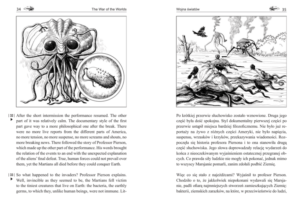 34 The War of the Worlds Wojna światów 35 | 32 | u After the short intermission the performance resumed. The other part of it was relatively calm. The documentary style of the first part gave way to a more philosophical one after the break. There were no more live reports from the different parts of America, no more tension, no more suspense, no more screams and shouts, no more breaking news. There followed the story of Professor Pierson, which made up the other part of the performance. His words brought the relation of the events to an end with the unexpected explanation of the aliens’ final defeat. True, human forces could not prevail over them, yet the Martians all died before they could conquer Earth. Po krótkiej przerwie słuchowisko zostało wznowione. Druga jego część była dość spokojna. Styl dokumentalny pierwszej części po przerwie ustąpił miejsca bardziej filozoficznemu. Nie było już reportaży na żywo z różnych części Ameryki, nie było napięcia, suspensu, wrzasków i krzyków, przekazywania wiadomości. Rozpoczęła się historia profesora Piersona i to ona stanowiła drugą część słuchowiska. Jego słowa doprowadzały relację wydarzeń do końca z nieoczekiwanym wyjaśnieniem ostatecznej przegranej obcych. Co prawda siły ludzkie nie mogły ich pokonać, jednak mimo to wszyscy Marsjanie pomarli, zanim zdołali podbić Ziemię. | 33 | u So what happened to the invaders? Professor Pierson explains. Well, invincible as they seemed to be, the Martians fell victim to the tiniest creatures that live on Earth: the bacteria, the earthly germs, to which they, unlike human beings, were not immune. Lit- Więc co się stało z najeźdźcami? Wyjaśnił to profesor Pierson. Chodziło o to, że jakkolwiek niepokonani wydawali się Marsjanie, padli ofiarą najmniejszych stworzeń zamieszkujących Ziemię: bakterii, ziemskich zarazków, na które, w przeciwieństwie do ludzi,