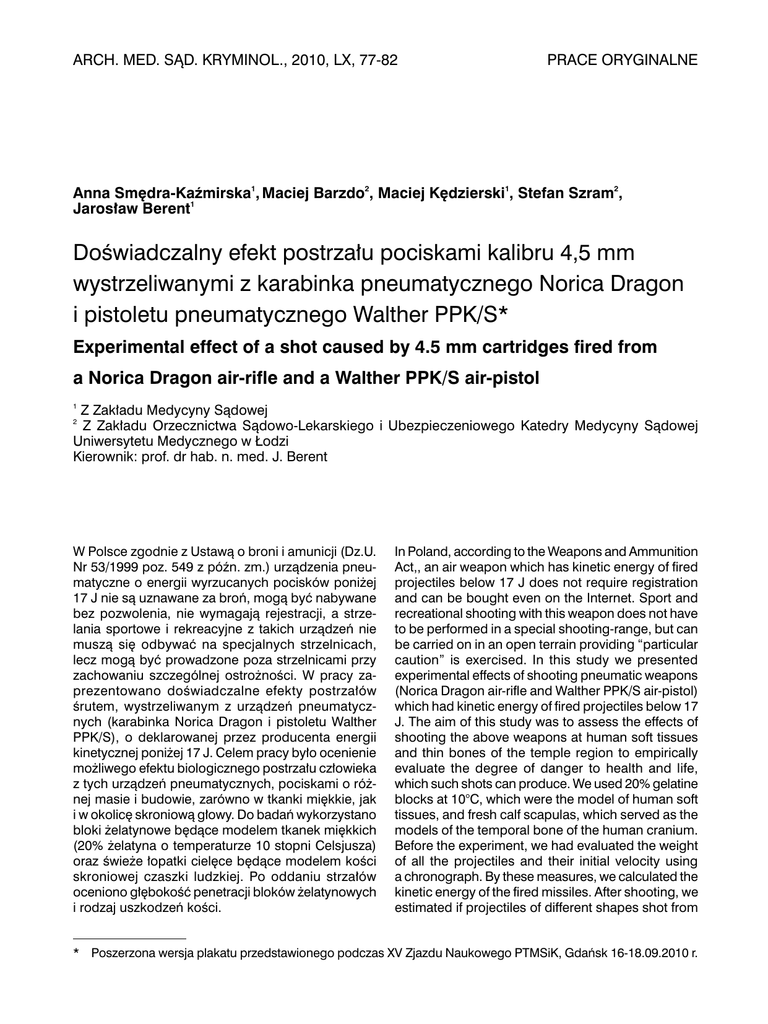 ARCH. MED. SĄD. KRYMINOL., 2010, LX, 77-82 PRACE ORYGINALNE Anna Smędra-Kaźmirska1, Maciej Barzdo2, Maciej Kędzierski1, Stefan Szram2, 1 Jarosław Berent Doświadczalny efekt postrzału pociskami kalibru 4,5 mm wystrzeliwanymi z karabinka pneumatycznego Norica Dragon i pistoletu pneumatycznego Walther PPK/S* Experimental effect of a shot caused by 4.5 mm cartridges fired from a Norica Dragon air-rifle and a Walther PPK/S air-pistol Z Zakładu Medycyny Sądowej Z Zakładu Orzecznictwa Sądowo-Lekarskiego i Ubezpieczeniowego Katedry Medycyny Sądowej Uniwersytetu Medycznego w Łodzi Kierownik: prof. dr hab. n. med. J. Berent 1 2 W Polsce zgodnie z Ustawą o broni i amunicji (Dz.U. Nr 53/1999 poz. 549 z późn. zm.) urządzenia pneumatyczne o energii wyrzucanych pocisków poniżej 17 J nie są uznawane za broń, mogą być nabywane bez pozwolenia, nie wymagają rejestracji, a strzelania sportowe i rekreacyjne z takich urządzeń nie muszą się odbywać na specjalnych strzelnicach, lecz mogą być prowadzone poza strzelnicami przy zachowaniu szczególnej ostrożności. W pracy zaprezentowano doświadczalne efekty postrzałów śrutem, wystrzeliwanym z urządzeń pneumatycznych (karabinka Norica Dragon i pistoletu Walther PPK/S), o deklarowanej przez producenta energii kinetycznej poniżej 17 J. Celem pracy było ocenienie możliwego efektu biologicznego postrzału człowieka z tych urządzeń pneumatycznych, pociskami o różnej masie i budowie, zarówno w tkanki miękkie, jak i w okolicę skroniową głowy. Do badań wykorzystano bloki żelatynowe będące modelem tkanek miękkich (20% żelatyna o temperaturze 10 stopni Celsjusza) oraz świeże łopatki cielęce będące modelem kości skroniowej czaszki ludzkiej. Po oddaniu strzałów oceniono głębokość penetracji bloków żelatynowych i rodzaj uszkodzeń kości. * In Poland, according to the Weapons and Ammunition Act,, an air weapon which has kinetic energy of fired projectiles below 17 J does not require registration and can be bought even on the Internet. Sport and recreational shooting with this weapon does not have to be performed in a special shooting-range, but can be carried on in an open terrain providing “particular caution” is exercised. In this study we presented experimental effects of shooting pneumatic weapons (Norica Dragon air-rifle and Walther PPK/S air-pistol) which had kinetic energy of fired projectiles below 17 J. The aim of this study was to assess the effects of shooting the above weapons at human soft tissues and thin bones of the temple region to empirically evaluate the degree of danger to health and life, which such shots can produce. We used 20% gelatine blocks at 10°C, which were the model of human soft tissues, and fresh calf scapulas, which served as the models of the temporal bone of the human cranium. Before the experiment, we had evaluated the weight of all the projectiles and their initial velocity using a chronograph. By these measures, we calculated the kinetic energy of the fired missiles. After shooting, we estimated if projectiles of different shapes shot from Poszerzona wersja plakatu przedstawionego podczas XV Zjazdu Naukowego PTMSiK, Gdańsk 16-18.09.2010 r. 78 Anna Smędra-Kaźmirska air weapons characterized by different kinetic energy and from different distances penetrated the gelatine blocks and if the said missiles perforated the bones. We also measured the depth of missiles penetration in the gelatine blocks. Słowa kluczowe: urządzenia pneumatyczne, energia kinetyczna, blok żelatynowy, łopatka cielęca Key words: pneumatic weapons, kinetic energy, gelatin block, calf scapula WSTęP W Polsce zgodnie z Ustawą o broni i amunicji (Dz.U. Nr 53/1999 poz. 549 z późn. zm.) urządzenia pneumatyczne o energii wystrzeliwanych pocisków poniżej 17 J nie są uznawane za broń, mogą być nabywane bez pozwolenia, nie wymagają rejestracji, a strzelania sportowe i rekreacyjne z takich urządzeń nie muszą się odbywać na specjalnych strzelnicach, lecz mogą być prowadzone poza strzelnicami przy zachowaniu szczególnej ostrożności [1]. W piśmiennictwie opisywane są coraz liczniejsze przypadki postrzałów z urządzeń i broni pneumatycznej, które dotyczą tak ludzi, jak i zwierząt domowych. Większość opisywanych przypadków postrzałów to wypadki [2, 3, 4]. Samobójstwa i zabójstwa zdarzają się bardzo rzadko [5, 6, 7, 8, 9, 10]. Niestety zarówno w Polsce, jak i na świecie najczęściej ofiarami postrzałów z urządzeń i broni pneumatycznej są dzieci i młodzież. Najwięcej postrzałów z urządzeń i broni pneumatycznej związanych jest z drobnymi, niezagrażającymi życiu obrażeniami, jednakże niektóre kończą się zgonem [11, 12, 13, 14, 15, 16, 17, 18]. Większość przypadków zagrażających życiu lub zdrowiu ofiar postrzałów związanych jest z postrzałem głowy [19, 20, 21, 22], szyi [23], klatki piersiowej [24, 25, 26] i brzucha [27, 28, 29]. Nr 2-3 MATERIAŁ I METODY Do badań wykorzystano bloki żelatynowe (20% żelatyna o temperaturze 10°C przygotowana według standardów NATO) będące modelem tkanek miękkich oraz świeże łopatki cielęce będące modelem łuski kości skroniowej czaszki ludzkiej. Bloki żelatynowe są powszechnie stosowane w badaniach skutków działania broni jako model tkanek miękkich. Stosowanie innych materiałów, np. bloków mydła, nie jest tak przydatne, gdyż jama postrzałowa w mydle nie wykazuje takiej sprężystości, jaką obserwuje się w żywej tkance. Jako model biologiczny łuski kości skroniowej czaszki ludzkiej można było również użyć świeżych łopatek baranich [30]. Do badań użyto karabinka pneumatycznego Norica Dragon kalibru 4,5 mm (ryc. 2) i 5 różniących się masą i kształtem rodzajów ołowianych pocisków kalibru 4,5 mm (ryc. 4) oraz pistoletu pneumatycznego Walther PPK/S kalibru 4,5 mm (ryc. 1) i kulistego stalowego śrutu podkalibrowego kalibru 4,46 mm (ryc. 3). Do bloków że