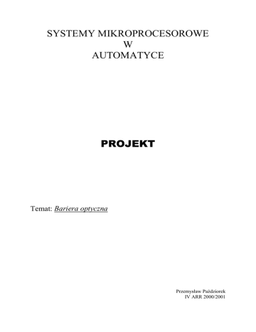 SYSTEMY MIKROPROCESOROWE W AUTOMATYCE PROJEKT Temat: Bariera optyczna Przemysław Paździorek IV ARR 2000/2001 1. Cel projektu Celem opisanego tu projektu było zaprojektowanie i wykonanie bariery optycznej, wykorzystującej mikrokontroler firmy Motorola MC68HC05J1A. 2. Założenia projektowe Docelowo projektowana bariera służyć powinna jako element dodatkowego wyposażenia stanowiska laboratoryjnego robota przemysłowego IRB-6. Bariera powinna wykryć fakt wejścia człowieka w obszar roboczy w czasie pracy manipulatora oraz odpowiednio zareagować tzn. włączyć STOP AWARYJANY . Układ powinien pracować stabilnie w każdych warunkach (oświetlenia , temperatury itp.) STREFA CHRONIONA BARIERA OPTYCZNA BIURKA Rys 1. Schemat chronionej strefy. SZAFA STEROWNIKA IRB-6 3. Realizacja projektu W opisywanej barierze optycznej wykorzystany został scalony odbiornik podczerwieni SFH-5111. Układ ten reaguje na odpowiednio modulowane promieniowanie podczerwone o częstotliwości 36kHz.Dzieki takiemu właśnie rozwiązaniu eliminujemy zakłócenia pochodzące od zewnętrznego oświetlenia. Do uzyskania częstotliwości 36 kHz użyto popularnego generatora LM555, modulacją wiązki podczerwonej zajmuję się mikrokontroler. Odbiornik umieszczony został na oddzielnej płytce i połączony przewodem z urządzeniem. ired 3.1. Odbiornik SFH-5111 SFH –5111 jest scalonym odbiornikiem podczerwieni stosowany głównie w urządzeniach RTV sterowanych pilotem na podczerwień. Odbiornik reaguje na promieniowanie o długości fali 940 nm. Wyposażony jest w filtr o paśmie przenoszenia ok. 36kHz. Scalonu odbiornik jest kompatybilny zarówno z technologią CMOS jak i TTL. Wyjście jest aktywne w stanie niskim. Rys. 2. Przebiegi czasowe nadajnika i odbiornika podczerwieni. 3.2. Mikrokontroler W projekcie zastosowano najmniejszy z mikrokontrolerów firmy Motorola HC05. Jego zadaniem jest odpowiednia modulacja nadawanego sygnału w podczerwieni. Do tego celu wykorzystano przerwania pochodzące od RTI. Na porcie PA7 uzyskano sygnał o okresie ok. 16,4 ms i 50% wypełnieniu. Do wejścia przerwań zewnętrznych IRQ, który jest aktywny w stanie niskim, podłączono wyjście odbiornika podczerwieni. Mikrokontroler zlicza ilość otrzymanych przerwań zewnętrznych w pewnym odcinku czasu i sprawdza czy mieści się ona w odpowiednim zakresie. Za mała ilość informuje nas o tym, że ktoś stanął pomiędzy odbiornikiem a nadajnikiem, za duża ilość może świadczyć o zakłóceniu bariery przez inne źródło podczerwieni np. pilot TV. Jeżeli zauważy któreś z tych zjawisk wystawia stan wysoki na port PA6. Program sterujący pracą układu jest bardzo prosty, powstał on przez modyfikację laboratoryjnego programu demonstracyjnego. PROGRAM: #include ‘h705j1a.frk’ ORG RAM tim_counter ds 1 /deklaracja zmiennych tim_counter2 ds 1 ext_counter ds 1 ORG EPROM TIMER_ISR: /obsługa przerwania od timera inc tim_counter inc tim_counter2 bset 2,tscr rti EXTERNAL_ISR: /obsluga przerwan zewnetrznych inc ext_counter bset 1,iscr rti INIT: /procedura inicjalizacyjna clra lda #$f0 sta ddra lda #3 sta ddrb clrx lda #0 sta portb sta porta sta tim_counter sta tim_counter2 sta ext_counter bset 4,tscr bclr 0,tscr bclr 1,tscr cli rts tim /procedura umozliwiajaca odpowiednia modulacje sygnalu nadawanego lda porta eor #$80 sta porta clr tim_counter bra tag tim2 /procedura sprawdzajaca pojawienie sie stanow alarmowych lda ext_counter cmp #5 bls alarm /przyszlo za malo przerwan (ktos przeszedl przez bariere) cmp #12 bhs alarm /przyszlo za duzo przerwan (odbiornik odebral dodatkowy sygnal) clr tim_counter2 clr ext_counter bra tag alarm /procedura wlaczjaca alarm bset 6,porta clr tim_counter2 clr ext_counter bra tag START: jsr init tag /glowna petal programu lda #00 sta copr lda tim_counter cmp #1 beq tim lda tim_counter2 cmp #10 beq tim2 bra tag ORG VECTORS dw timer_isr dw external_isr dw start dw start org MOR DEFOPT equ PIRQ.|OSCRES. db DEFOPT 3.3. Zasilanie Do zasilania układu można wykorzystać dowolny popularny zasilacz wtyczkowy. Układ został wyposażony w prostownik oraz stabilizator napięcia 7805. Maksymalne napięcie wejściowe ograniczone jest przez wartość maksymalnego napięcia dla kondensatorów znajdujących się w układzie zasilania. 4. Wnioski W czasie realizacji projektu zauważono, że ważnym elementem jest ustalenie prądu diody nadawczej, przy zbyt dużej wartości do odbiornika po linii zasilania dochodziły zakłócenia powodujące jego ciągłe wzbudzenie.Dodatkowo, aby wyeliminować zakłócenia zastosowano filtr dolno przepustowy na lini zasilania odbiornika. W przypadku gdyby spadek napięcia na lini przesyłowej oraz na filtrze pomiędzy nadajnikiem i odbiornikiem okazałby się zbyt duży należałoby zastosować oddzielny układ zasilania dla odbiornika. W tym konkretnym przypadku polegałoby to na dołożeniu w układzie zailania dodatkowego stabilizatora, z którego doprowadzone byłoby zasialnie do odbiornika. Następnym ważnym elementem, jest dobór odpowiednio dokładnych elementów generatora zbudowanego na układzie LM555, a w szczególności pojemności aby generator był nie czuły na zmiany temperatury.