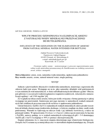 Nr 3 Wp³yw ozonowania wody na eliminacjê arsenu ROCZN. PZH 2006, 57, NR 3, 251-258 251 MICHA£ DROBNIK, TERESA LATOUR WP£YW PROCESU OZONOWANIA NA ELIMINACJÊ ARSENU Z NATURALNEJ WODY MINERALNEJ PRZEZNACZONEJ DO BUTELKOWANIA INFLUENCE OF THE OZONATION ON THE ELIMINATION OF ARSENIC FROM NATURAL MINERAL WATER INTENDED FOR BOTTLING Zak³ad Tworzyw Uzdrowiskowych Pañstwowy Zak³ad Higieny 60-823 Poznañ, ul. S³owackiego 8 e-mail: [email protected] Kierownik: dr T. Latour Oceniono wp³yw ozonu zastosowanego w procesie napowietrzania naturalnej wody mineralnej przeznaczonej do butelkowania na redukcjê zawartoci arsen, ¿elaza i manganu. S³owa kluczowe: arsen, ozon, naturalna woda mineralna, opakowania jednostkowe Key words: arsenic, ozone, natural mineral water, single packing WSTÊP Jednym z pierwiastków obecnych w rodowisku naturalnym, stanowi¹cy zagro¿enie dla zdrowia ludzi jest arsen. Wystêpuje on m.in. jako naturalny sk³adnik wód podziemnych w tym niektórych wód mineralnych, w iloci od kilkudziesiêciu do kilkuset mg/dm3. Obecny jest g³ównie w szczawach wodorowêglanowo-wapniowo-sodowych, ¿elazistych o mineralizacji ogólnej > od 1300 mg/dm3 [4]. Ze wzglêdu na toksycznoæ arsenu, która jest cile zwi¹zana z form¹ (postaci¹) w jakiej wystêpuje ten pierwiastek, limitowane jest jego stê¿enie w naturalnych wodach mineralnych lub ródlanych przeznaczonych do rozlewu w opakowania jednostkowe. Udzia³ ilociowy As(III) i As(V) w naturalnych wodach mineralnych zale¿y przede wszystkim od sk³adu chemicznego rodowiska skalnego, w którym znajduje siê dany zasób wody podziemnej. Warunki te wp³ywaj¹ na odczyn wody i jej zdolnoæ roztwórcz¹, a tak¿e na potencja³ redoks. W opracowaniu Driehausa i Duponta dotycz¹cym usuwania As ³¹cznie z Fe(OH)3 autorzy podaj¹, ¿e w wodach naturalnych wykazuj¹cych pH = 5-9 dominuj¹cy As(III) jak i As(V) wystêpuj¹ w 50% w postaci zdysocjowanej [8]. Stopieñ utlenienia As w znacznym stopniu determinuje jego w³aciwoci biologiczne. Zwi¹zki As(V) uznane s¹ za mniej toksyczne i w niewielkim stopniu kumuluj¹ce siê. Zwi¹zki 252 M. Drobnik, T. Latour Nr 3 As(III) (zarówno organiczne jak i nieorganiczne), wykazuj¹ dzia³anie kancerogenne, teratogenne lub mutagenne [12]. Wg aktualnych przepisów polskich [22] i europejskich [7], maksymalna zawartoæ As w wodzie butelkowanej nie mo¿e przekraczaæ 10 mg/dm3. Stosowany przed butelkowaniem naturalnych wód mineralnych proces od¿elaziania przez napowietrzanie powoduje znaczn¹ lecz niejednokrotnie niewystarczaj¹c¹ redukcjê zawartoci arsenu. Zgodnie z cytowanymi wy¿ej przepisami dopuszczalne jest traktowanie niektórych wód powietrzem wzbogaconym w ozon w celu efektywniejszego usuwania z wody arsenu. Z przegl¹du pimiennictwa dotycz¹cego zastosowania ozonu w technologii uzdatniania wody do picia (podziemnej lub powierzchniowej) wynika, ¿e skutecznoæ tego procesu zale¿y od sk³adu mineralnego danej wody, zawartoci zwi¹zków organicznych [21, 26], rozwi¹zañ technicznych i krotnoci ozonowania [1, 2, 3, 18, 25]. Proces ten mo¿e prowadziæ do powstawania produktów ubocznych tak¿e niepo¿¹danych ze wzglêdów zdrowotnych [5, 13, 15] i limitowanych w wodzie. W opracowaniach tych stosowana do tego celu dawka ozonu (uwzglêdniaj¹ca ozonowanie wstêpne i porednie) mieci³a siê w przedziale 0,25-6,66 g O3/dm3, a czas ozonowania wynosi³ od 4 do 15 minut. Celem niniejszej pracy by³a ocena skutecznoci redukcji zawartoci As, Fe i Mn w procesie ozonowania badanej wody poprzez okrelenie jego parametrów tj. dawki ozonu, czasu ozonowania wody, stê¿enia rozpuszczonego pozosta³ego O3, czasu kontaktu wody z ozonem. MATERIA£ I METODY Materia³ Materia³ do badañ stanowi³a woda mineralna wodorowêglanowo-wapniowa, ¿elazista zawieraj¹ca ok. 2500 mg/dm3 rozpuszczonych sk³adników mineralnych oraz 2120 ± 90 mg/dm3 CO2 (3 próbki pobrane co 2 tygodnie). Ozon produkowano w aparacie Ozomatic lab typu 802 z tlenu pozyskiwanego z generatora tlenu typu AS-12E. Wykorzystywane urz¹dzenia wypo¿yczono z firmy Wedeco w Poznaniu. Ozon wprowadzano przez spiek ceramiczny do 250 cm3 próbki badanej wody umieszczonej w reaktorze szklanym o pojemnoci 500 cm3. Za rozpoczêcie reakcji przyjêto moment przep³ywu przez wodê pierwszych pêcherzyków gazu. Ozonowanie próbek wody przeprowadzano w czasie 1, 2, 5 i 10 minut przy przep³ywie powietrza 0,1 dm3/min i cinieniu 1,5 bar. Szybkoæ przep³ywu mieszaniny tlen-ozon wynosi³a we wszystkich wykonywanych dowiadczeniach 6 dm3/h. Stê¿enie ozonu w gazie na wlocie do reaktora mieci³o siê w granicach 2,4-48,0 mg/dm3. Procesy ozonowania przeprowadzano w sta³ej temperaturze wynosz¹cej 20,0 ± 0,5oC. Zakres badañ i pomiarów W wodzie surowej (przy ródle) mierzono: temperaturê, odczyn (pH) oraz potencja³ red-oks (Eh). W warunkach laboratoryjnych, w próbach zabezpieczonych przed utrat¹ CO2 mierzono: przewodnictwo elektryczne w³aciwe, odczyn (pH), potencja³ red-oks. W próbach utrwalonych H2SO4 lub HCl oznaczano: utlenialnoæ (ChZT), (po dostarczeniu prób wody surowej oraz zawartoæ istotnych dla omawianego procesu sk³adników tj. Fe2+/3+, Mn2+/4+ i As3+/ 5+ a tak¿e zawartoæ sk³adników charakterystycznych: Ca2+, Mg2+, HC03-, NH4+, N03-, N02-. Metody oznaczeñ i pomiarów Oznaczenia potencja³u redoks (Eh) i pH (odczynu) wykonano metod¹ elektrometryczn¹ za pomoc¹ pH/jonometru mikrokomputerowego typu CI-316 f-my Elmetron i elektrody: platynowej redoks typu EPtAgP-323W f-my Eurosensor, elektrody zespolonej pH-metrycznej typu ERH-11 f-my Hydromet z udzia³em czujnika temp. typu PT-100 f-my Elmetron. Nr 3 Wp³yw ozonowania wody na eliminacjê arsenu 253 Pomiar potencja³u redoks przeprowadzano w szklanym naczyniu przep³ywowym gwarantuj¹cym zachowanie stanu gazowego w wodzie charakteryzuj¹cego badan¹ warstwê wodonon¹ [9, 11, 14]. Przewodnictwo elektryczne w³aciwe badanych próbek wody mierzono konduktometrem typu N5722 f-my Teleko za po
