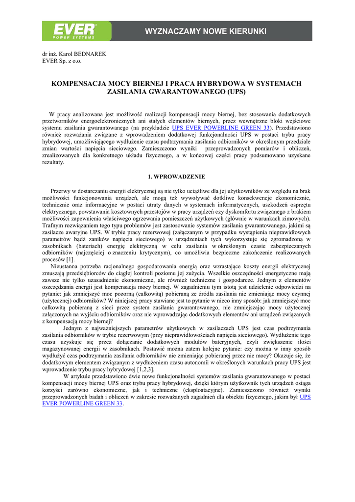 dr inż. Karol BEDNAREK EVER Sp. z o.o. KOMPENSACJA MOCY BIERNEJ I PRACA HYBRYDOWA W SYSTEMACH ZASILANIA GWARANTOWANEGO (UPS) W pracy analizowana jest możliwość realizacji kompensacji mocy biernej, bez stosowania dodatkowych przetworników energoelektronicznych ani stałych elementów biernych, przez wewnętrzne bloki wejściowe systemu zasilania gwarantowanego (na przykładzie UPS EVER POWERLINE GREEN 33). Przedstawiono również rozważania związane z wprowadzeniem dodatkowej funkcjonalności UPS w postaci trybu pracy hybrydowej, umożliwiającego wydłużenie czasu podtrzymania zasilania odbiorników w określonym przedziale zmian wartości napięcia sieciowego. Zamieszczono wyniki przeprowadzonych pomiarów i obliczeń, zrealizowanych dla konkretnego układu fizycznego, a w końcowej części pracy podsumowano uzyskane rezultaty. 1. WPROWADZENIE Przerwy w dostarczaniu energii elektrycznej są nie tylko uciążliwe dla jej użytkowników ze względu na brak możliwości funkcjonowania urządzeń, ale mogą też wywoływać dotkliwe konsekwencje ekonomicznie, technicznie oraz informacyjne w postaci utraty danych w systemach informatycznych, uszkodzeń osprzętu elektrycznego, powstawania kosztownych przestojów w pracy urządzeń czy dyskomfortu związanego z brakiem możliwości zapewnienia właściwego ogrzewania pomieszczeń użytkowych (głównie w warunkach zimowych). Trafnym rozwiązaniem tego typu problemów jest zastosowanie systemów zasilania gwarantowanego, jakimi są zasilacze awaryjne UPS. W trybie pracy rezerwowej (załączanym w przypadku wystąpienia nieprawidłowych parametrów bądź zaników napięcia sieciowego) w urządzeniach tych wykorzystuje się zgromadzoną w zasobnikach (bateriach) energię elektryczną w celu zasilania w określonym czasie zabezpieczanych odbiorników (najczęściej o znaczeniu krytycznym), co umożliwia bezpieczne zakończenie realizowanych procesów [1]. Nieustanna potrzeba racjonalnego gospodarowania energią oraz wzrastające koszty energii elektrycznej zmuszają przedsiębiorców do ciągłej kontroli poziomu jej zużycia. Wszelkie oszczędności energetyczne mają zawsze nie tylko uzasadnienie ekonomiczne, ale również techniczne i gospodarcze. Jednym z elementów oszczędzania energii jest kompensacja mocy biernej. W zagadnieniu tym istotą jest udzielenie odpowiedzi na pytanie: jak zmniejszyć moc pozorną (całkowitą) pobieraną ze źródła zasilania nie zmieniając mocy czynnej (użytecznej) odbiorników? W niniejszej pracy stawiane jest to pytanie w nieco inny sposób: jak zmniejszyć moc całkowitą pobieraną z sieci przez system zasilania gwarantowanego, nie zmniejszając mocy użytecznej załączonych na wyjściu odbiorników oraz nie wprowadzając dodatkowych elementów ani urządzeń związanych z kompensacją mocy biernej? Jednym z najważniejszych parametrów użytkowych w zasilaczach UPS jest czas podtrzymania zasilania odbiorników w trybie rezerwowym (przy nieprawidłowościach napięcia sieciowego). Wydłużenie tego czasu uzyskuje się przez dołączanie dodatkowych modułów bateryjnych, czyli zwiększenie ilości magazynowanej energii w zasobnikach. Postawić można zatem kolejne pytanie: czy można w inny sposób wydłużyć czas podtrzymania zasilania odbiorników nie zmieniając pobieranej przez nie mocy? Okazuje się, że dodatkowym elementem związanym z wydłużeniem czasu autonomii w określonych warunkach pracy UPS jest wprowadzenie trybu pracy hybrydowej [1,2,3]. W artykule przedstawiono dwie nowe funkcjonalności systemów zasilania gwarantowanego w postaci kompensacji mocy biernej UPS oraz trybu pracy hybrydowej, dzięki którym użytkownik tych urządzeń osiąga korzyści zarówno ekonomiczne, jak i techniczne (eksploatacyjne). Zamieszczono również wyniki przeprowadzonych badań i obliczeń w zakresie rozważanych zagadnień dla obiektu fizycznego, jakim był UPS EVER POWERLINE GREEN 33. 2. SYSTEMY ZASILANIA GWARANTOWANEGO VFI (UPS ON-LINE) Systemy zasilania gwarantowanego VFI (on-line) są zasilaczami bezprzerwowymi, w których wartość i częstotliwość napięcia wyjściowego są niezależne od parametrów napięcia wejściowego (sieciowego). Najczęściej występującym charakterem pracy w tych zasilaczach jest tryb sieciowy (normalny). Energia pobierana z sieci ulega wówczas podwójnemu przetworzeniu: sieciowe napięcie przemienne doprowadzone na wejście UPS zostaje wyprostowane w układzie prostowniczym, następnie za pomocą magistrali stałoprądowej dostarczone do falownika, w którym zostaje przetworzone na napięcie przemienne o założonych parametrach (wartości i częstotliwości), a w rezultacie odpowiednio ukształtowane napięcie przekazywane jest do załączonych na wyjściu UPS zabezpieczanych odbiorników (rys. 1). Jednocześnie część energii z magistrali stałoprądowej jest wykorzystana do uzupełniania energii gromadzonej w akumulatorach. W przypadku wystąpienia nieprawidłowej wartości lub częstotliwości napięcia sieciowego bądź jego zaniku system automatycznie przełącza się w tryb rezerwowy (bateryjny). Odbiorniki zasilane są wówczas niezaburzonym napięciem dzięki zasileniu falownika energią zgromadzoną w akumulatorach (do czasu wyczerpania zgromadzonej energii). Po przywróceniu prawidłowości napięcia sieciowego następuje samoczynny powrót do trybu sieciowego (po osiągnięciu przez akumulatory wymaganego ładunku minimalnego). Zmiana trybów pracy z sieciowego na rezerwowy i odwrotnie odbywa się całkowicie bezprzerwowo – zmianie ulega tylko źródło energii dostarczanej do falownika [1,2]. Rys. 1. Schemat blokowy UPS VFI (on-line) Przykładowym rozwiązaniem systemu zasilania gwarantowanego VFI jest UPS EVER POWERLINE GREEN 33, którego dodatkowe funkcjonalności oraz rezultaty badań zamieszczono w dalszej części pracy [6,7]. 3. KOMPENSACJA MOCY BIERNEJ (ZOBACZ FILM) Odbiorniki energii elektrycznej, oprócz poboru mocy czynnej (użyt