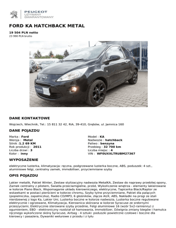 FORD KA HATCHBACK METAL 19 504 PLN netto 23 990 PLN brutto DANE KONTAKTOWE Wojciech, Wiechnik, Tel.: 15 811 32 42, RiA, 39-410, Grębów, ul. Jamnica 160 DANE POJAZDU Marka : Ford Wersja : Metal Silnik :1.2 69 KM Rok produkcji : 2011 Liczba drzwi : 3 Kolor : inny Model : KA Nadwozie : hatchback Paliwo : benzyna Przebieg : 32 700 km Liczba miejsc : 4 VIN : WF0UXXLTRUBM27367 WYPOSAŻENIE elektryczne lusterka, klimatyzacja: ręczna, podgrzewane lusterka boczne, ABS, poduszek: 4 szt., aluminiowe felgi, centralny zamek, immobiliser, przyciemniane szyby OPIS POJAZDU Lakier metalik, Pakiet Winter, Zestaw stylizacyjny nadwozia MetalKA, Zestaw do naprawy przebitej opony, Zamek centralny z pilotem, Światła przeciwmgielne, przód, Wykończenie wnętrza - elementy lakierowane w kolorze Piano Black, Wspomaganie układu kierowniczego, elektryczne, Tapicerka Black/Raptor ze wstawkami w postaci pierścieni w kolorze chromu, Szyby tylne przyciemniane, Pakiet dla palących (popielniczka, zapalniczka), Radio CD/MP3, 6 głośników, złącze AUX, ABS, Nakładki na progi ze stali nierdzewnej z logo Ka, Lakier Uni, Lusterka boczne w kolorze nadwozia, Lusterka boczne regulowane elektrycznie i ogrzewane, Klimatyzacja, Kierownica skórzana w kolorze Syracuse ze srebrnymi przeszyciami, Elektrycznie sterowane szyby przednie, Felgi aluminiowe 16 (wzór 5x2-ramienny) z ogumieniem, EBD - elektroniczny rozdział sił hamowania, Immobilizer, Dźwignia zmiany biegów i hamulca ręcznego wykończone skórą Syracuse, Airbag - 4 sztuki: poduszki powietrzne czołowe i boczne dla kierowcy i pasażera, Dywaniki welurowe z przodu i z tyłu QR CODE DLA OGŁOSZENIA W SERWISIE UZYWANYGWARANTOWANY.PL Powered by TCPDF (www.tcpdf.org)