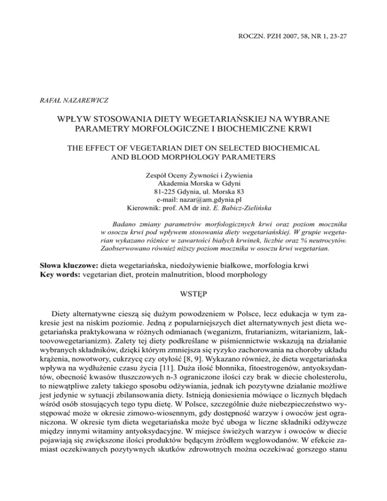 ROCZN. PZH 2007, 58, NR 1, 23-27 RAFAŁ NAZAREWICZ WPŁYW STOSOWANIA DIETY WEGETARIAŃSKIEJ NA WYBRANE PARAMETRY MORFOLOGICZNE I BIOCHEMICZNE KRWI THE EFFECT OF VEGETARIAN DIET ON SELECTED BIOCHEMICAL AND BLOOD MORPHOLOGY PARAMETERS Zespół Oceny Żywności i Żywienia Akademia Morska w Gdyni 81-225 Gdynia, ul. Morska 83 e-mail: [email protected] Kierownik: prof. AM dr inż. E. Babicz-Zielińska Badano zmiany parametrów morfologicznych krwi oraz poziom mocznika w osoczu krwi pod wpływem stosowania diety wegetariańskiej. W grupie wegetarian wykazano różnice w zawartości białych krwinek, liczbie oraz % neutrocytów. Zaobserwowano również niższy poziom mocznika w osoczu krwi wegetarian. Słowa kluczowe: dieta wegetariańska, niedożywienie białkowe, morfologia krwi Key words: vegetarian diet, protein malnutrition, blood morphology WSTĘP Diety alternatywne cieszą się dużym powodzeniem w Polsce, lecz edukacja w tym zakresie jest na niskim poziomie. Jedną z popularniejszych diet alternatywnych jest dieta wegetariańska praktykowana w różnych odmianach (weganizm, frutarianizm, witarianizm, laktoovowegetarianizm). Zalety tej diety podkreślane w piśmiennictwie wskazują na działanie wybranych składników, dzięki którym zmniejsza się ryzyko zachorowania na choroby układu krążenia, nowotwory, cukrzycę czy otyłość [8, 9]. Wykazano również, że dieta wegetariańska wpływa na wydłużenie czasu życia [11]. Duża ilość błonnika, fitoestrogenów, antyoksydantów, obecność kwasów tłuszczowych n-3 ograniczone ilości czy brak w diecie cholesterolu, to niewątpliwe zalety takiego sposobu odżywiania, jednak ich pozytywne działanie możliwe jest jedynie w sytuacji zbilansowania diety. Istnieją doniesienia mówiące o licznych błędach wśród osób stosujących tego typu dietę. W Polsce, szczególnie duże niebezpieczeństwo występować może w okresie zimowo-wiosennym, gdy dostępność warzyw i owoców jest ograniczona. W okresie tym dieta wegetariańska może być uboga w liczne składniki odżywcze między innymi witaminy antyoksydacyjne. W miejsce świeżych warzyw i owoców w diecie pojawiają się zwiększone ilości produktów będącym źródłem węglowodanów. W efekcie zamiast oczekiwanych pozytywnych skutków zdrowotnych można oczekiwać gorszego stanu 24 R. Nazarewicz Nr 1 odżywienia i osłabienia obrony antyoksydacyjnej [11]. Wartość całkowitego potencjału antyoksydacyjnego może być także uzależniona od stanu odżywienia witaminą B12 czy kwasem foliowym. Niski poziom tych składników we krwi obserwowany wśród wegan, doprowadza do zwiększonej koncentracji homocysteiny będącej inhibitorem enzymów antyoksydacyjnych oraz czynnikiem prooksydacyjnym [3, 6, 13]. Celem pracy było poznanie wpływu stosowania diety wegetariańskiej na wskaźniki morfologiczne krwi oraz poziom mocznika w osoczu. MATERIAŁ I METODY W badaniu wzięło udział 41 osób w wieku 19-26 lat; w tym 22 wegetarian oraz 19 osób z grupy kontrolnej (stosujących tradycyjny sposób odżywiania). Spośród osób, które dobrowolnie zgłosiły się na badanie wykluczono osoby palące tytoń, zażywające narkotyki oraz przyjmujące leki. Badani wykazywali przeciętną aktywność fizyczną, nie byli otyli i chorzy. Wartość BMI (kg/m2) w grupie kontrolnej wynosiła 21,7 ±2,3 i 22,6 ±2,9 w grupie wegetarian. Również % zawartość tkanki tłuszczowej mierzona metodą bioimpedancji [4], w badanych grupach była zbliżona i wynosiła odpowiednio 23,5 ±6 oraz 24,5 ±6,6. Wykonano badanie morfologii krwi według standardowych metod diagnostyki laboratoryjnej z pełnym różnicowaniem leukocytów obejmujące oznaczenia: erytrocytów, hematokrytu, hemoglobiny, średniej masy hemoglobiny, średniego stężenia hemoglobiny, średniej objętości krwinek, współczynnika zmienności objętości erytrocytów (RDW), leukocytów, liczby granulocytów, limfocytów, monocytów, granulocytów kwasochłonnych, granulocytów zasadochłonnych, obrazu odsetkowego leukocytów, płytek krwi, średniej objętości płytki. Wykorzystano krew żylną pobraną do probówki z EDTA. Badanie przeprowadzono na analizatorze hematologicznym Sysmex SF-3000. Oznaczono zawartość mocznika w heparinizowanym osoczu według standardowej metody laboratoryjnej z wykorzystaniem komercyjnego zestawu Randox UR 220. Badania wykonano za zgodą Komisji Bioetycznej w Gdańsku (KB-1207/05). WYNIKI I DYSKUSJA W badaniu wykazano istotne statystycznie różnice w poziomie wybranych analizowanych parametrów morfologii krwi. Wyniki oznaczeń przedstawiono w tabeli I. Wykazano istotnie statystyczną wyższą wartość krwinek białych w grupie kontrolnej w stosunku do grupy wegetarian. Wartości uzyskane w obydwóch grupach mieściły w zakresie wartości referencyjnych dla tego wieku. W grupie wegetarian zaobserwowano także istotnie statystycznie niższą liczbę oraz % neutrocytów. Wykazano również istotną różnicę w % limfocytów, przy czym wartości wyższe obserwowano w grupie wegetarian. W przypadku pozostałych parametrów morfologicznych nie wykazano różnic istotnych statystycznie. Należy zwrócić uwagę na pewną tendencję obserwowaną w badaniu, w grupie kontrolnej oznaczono nieistotnie wyższe wartości krwinek czerwonych, hemoglobiny, hematokrytu oraz płytek krwi. Oznaczenie wartości mocznika w osoczu krwi wykazało istotnie statystyczną niższą wartość w grupie wegetarian. W badanej grupie wegetarian większość stanowiły osoby stosujące dietę lakto-, owo- lub laktoowowegetariańską, jedynie nieznaczny odsetek stosował dietę wegańską. Diety z udziałem jaj i produktów mlecznych stwarzają możliwość dostarczenia wszystkich składników odżywczych. Stosowanie diety wegetariańskiej wiąże się z ryzykiem wystąpienie niedobo- Nr 1 25 Dieta wegetariańska a parametry krwi rów licznych składników odżywczych, między innymi żelaza, wapnia, cynku, witamin D i B12 a tak