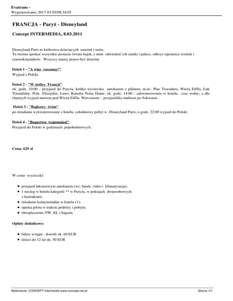 Evatrans Wygenerowano: 2017-03-02/08:34:03 FRANCJA - Paryż - Disneyland Concept INTERMEDIA, 8.03.2011 Disneyland Paris to królestwo dziecięcych marzeń i snów. Tu można spotkać wszystkie postacie świata bajek, z nimi odwiedzić ich zamki i pałace, odkryć tajemnice wróżek i czarnoksiężników. Wszyscy mamy prawo być dziećmi. Dzień 1 - "A więc ruszamy!" Wyjazd z Polski. Dzień 2 - "W stolicy Francji" ok. godz. 10:00 - przyjazd do Paryża, krótka wycieczka autokarem z pilotem, m.in.: Plac Trocadero, Wieża Eiffla, Łuk Triumfalny, Pola Elizejskie, Luwr, Katedra Notre Dame. ok. godz. 14:00 - zakwaterowanie w hotelu, czas wolny, a dla chętnych wyjazd metrem pod Wieżę Eiffla. Wieczorem - przejażdżka statkiem po Sekwanie. Dzień 3 - "Bajkowy świat" po śniadaniu wykwaterowanie z hotelu, całodniowy pobyt w Disneyland Paris, o godz. 22:00 wyjazd do Polski. Dzień 4 - "Bogactwo wspomnień" Przyjazd do Polski w godzinach popołudniowych. Cena: 629 zł W cenie wycieczki: przejazd luksusowym autokarem (wc, barek, video i klimatyzacja); 1 nocleg w hotelu kategorii ** w Paryżu, w pokojach dwuosobowych z łazienkami; śniadanie kontynentalne w hotelu (1); opieka pilota w trakcie podróży i pobytu; ubezpieczenie NW, KL i bagażu. Opłaty dodatkowe: bilety wstępu - dorośli ok. 60 EUR dzieci do 12 lat ok. 50 EUR Wykonanie: CONCEPT Intermedia www.concept.net.pl Strona 1/1