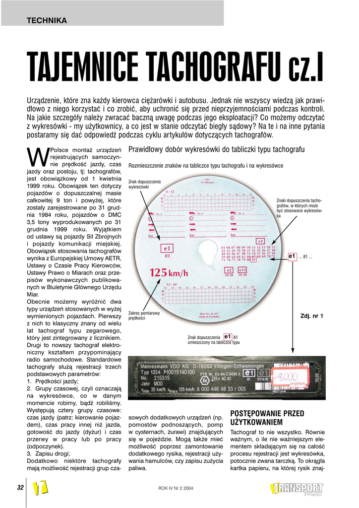 TECHNIKA TAJEMNICE TACHOGRAFU cz.I Urządzenie, które zna każdy kierowca ciężarówki i autobusu. Jednak nie wszyscy wiedzą jak prawidłowo z niego korzystać i co zrobić, aby uchronić się przed nieprzyjemnościami podczas kontroli. Na jakie szczegóły należy zwracać baczną uwagę podczas jego eksploatacji? Co możemy odczytać z wykresówki - my użytkownicy, a co jest w stanie odczytać biegły sądowy? Na te i na inne pytania postaramy się dać odpowiedź podczas cyklu artykułów dotyczących tachografów. W Polsce montaż urządzeń rejestrujących samoczynnie prędkość jazdy, czas jazdy oraz postoju, tj: tachografów, jest obowiązkowy od 1 kwietnia 1999 roku. Obowiązek ten dotyczy pojazdów o dopuszczalnej masie całkowitej 9 ton i powyżej, które zostały zarejestrowane po 31 grudnia 1984 roku, pojazdów o DMC 3,5 tony wyprodukowanych po 31 grudnia 1999 roku. Wyjątkiem od ustawy są pojazdy Sił Zbrojnych i pojazdy komunikacji miejskiej. Obowiązek stosowania tachografów wynika z Europejskiej Umowy AETR, Ustawy o Czasie Pracy Kierowców, Ustawy Prawo o Miarach oraz przepisów wykonawczych publikowanych w Biuletynie Głównego Urzędu Miar. Obecnie możemy wyróżnić dwa typy urządzeń stosowanych w wyżej wymienionych pojazdach. Pierwszy z nich to klasyczny znany od wielu lat tachograf typu zegarowego, który jest zintegrowany z licznikiem. Drugi to nowszy tachograf elektroniczny kształtem przypominający radio samochodowe. Standardowe tachografy służą rejestracji trzech podstawowych parametrów: 1. Prędkości jazdy; 2. Grupy czasowej, czyli oznaczają na wykresówce, co w danym momencie robimy, bądź robiliśmy. Występują cztery grupy czasowe: czas jazdy (patrz: kierowanie pojazdem), czas pracy innej niż jazda, gotowość do jazdy (dyżur) i czas przerwy w pracy lub po pracy (odpoczynek). 3. Zapisu drogi; Dodatkowo niektóre tachografy mają możliwość rejestracji grup cza- 32 Prawidłowy dobór wykresówki do tabliczki typu tachografu Rozmieszczenie znaków na tabliczce typu tachografu i na wykresówce Znak dopuszczenia wykresówki Znaki dopuszczenia tachografów, w których może być stosowana wykresówka e1 Zakres pomiarowy prędkości ... 81 ... Zdj. nr 1 Znak dopuszczenia e1 81 umieszczony na tabliczce typu sowych dodatkowych urządzeń (np. pomostów podnoszących, pomp w cysternach, żurawi) znajdujących się w pojeździe. Mogą także mieć możliwość poprzez zamontowanie dodatkowego rysika, rejestracji używania hamulców, czy zapisu zużycia paliwa. ROK IV Nr 2 2004 POSTĘPOWANIE PRZED UŻYTKOWANIEM Tachograf to nie wszystko. Równie ważnym, o ile nie ważniejszym elementem składającym się na całość procesu rejestracji jest wykresówka, potocznie zwana tarczką. To okrągła kartka papieru, na której rysik znaj- TECHNIKA Zapisy dokonywane przed rozpoczęciem pracy Imię i nazwisko kierowcy Miejsce założenia wykresówki Numer rejestracyjny pojazdu Stan licznika kilometrów przy rozpoczęciu jazdy PRZYKŁAD Za brak któregokolwiek wpisu na wykresówce grozi kara 50 zł UWAGA! Braki w opisie wykresówki sumują się: - brak imienia - 50zł - brak miejsca wyjęcia wykresówki - 50zł - brak daty wyjęcia wykresówki - 50zł - brak stanu licznika km przy rozpoczęciu jazdy - 50zł - brak stanu licznika na końcu jazdy - 50zł Suma nałożonej kary - 250 zł Zapisy dokonywane po zakończeniu pracy Miejsce wyjęcia wykresówki Data wyjęcia wykresówki Stan licznika na końcu jazdy Przejechane kilometry 33 TECHNIKA dujący się w tachografie rejestruje poszczególne parametry jazdy wymienione wyżej. Warto wiedzieć, że wykesówka jest dokumentem urzędowym i jako taka podlega szczególnej ochronie. Dlatego też właściciele firm przewozowych mają obowiązek ich przechowywania przez okres 1 roku. Także z tego powodu na wykresówce, w miejscu rejestracji parametrów nie można nanosić żadnych poprawek, a zmiana danych to fałszerstwo, które podlega karze pozbawienia wolności od 3 do 8 lat. Tachografy każdego typu posiadają odpowiednie, przeznaczone do nich wykresówki. Ich prawidłowy dobór ma niebagatelne znaczenie w momencie kontroli np. Inspekcji Transportu Drogowego. Znajomość zasad doboru, które przedstawimy poniżej uchroni kierowców przed nieprzyjemnościami i karami finansowymi. Podstawowe informacje. 1. Tachograf i wykresówki muszą bezwzględnie posiadać zatwierdzenie typu wydane przez Główny Urząd Miar (zdjęcie 1). 2. Na tylnej stronie wykresówki podane są znaki kontrolne urządzeń, w których dana wykresówka może być stosowana (zdjęcie 1). 3. Wykresówka musi posiadać taki sam zakres prędkości, co tachograf (zdjęcie 1). 4. Wykresówka musi być przystosowana do tachografów klasycznych i elektronicznych. 5. Przed włożeniem wykresówki należy ją prawidłowo opisać, tzn. w kolejności: Imię i nazwisko kierowcy, miejsce założenia wykresówki, data założenia, numer rejestracyjny pojazdu,stan licznika kilometrów przy rozpoczęciu jazdy (zdjęcie 2). 6. Po zakończeniu pracy także należy dokonać opisu ostatecznego, w kolejności: miejsce wyjęcia wykresówki, data wyjęcia wykresówki, stan licznika kilometrów na końcu jazdy, ilość przejechanych kilometrów (zdjęcie 3). i wykonaniu plomb zatwierdzających zwanych cechami uwierzytelnienia mają okres ważności wynoszący 24 miesiące (licząc od pierwszego dnia miesiąca, w którym dokonano uwierzytelnienia), ale uwaga: certyfikat uwierzytelnienia tachografu traci ważność w momencie: 1. Uszkodzenia tachografu (łącznie z okablowaniem zasilającym i innym). 2. Uszkodzenia którejkolwiek plomby zabezpieczającej. 3. Uszkodzenia tabliczki pomiarowej. 4. Stwierdzenia, że błędy wskazań i rejestracji przekraczają błędy graniczne dopuszczalne. CO MOŻEMY ODCZYTAC Z WYKRESÓWKI? Wbrew pozorom praktycznie wszystko, co ma związek z jazdą. Możemy kontrolować cały przebieg dnia, czasy pracy, przerwy i odpoczynku. Możemy w