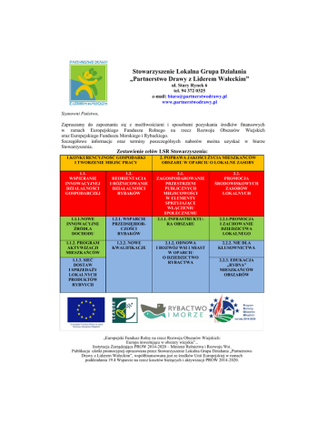 Stowarzyszenie Lokalna Grupa Działania „Partnerstwo Drawy z Liderem Wałeckim” ul. Stary Rynek 6 tel. 94 372 0325 e-mail: [email protected] www.partnerstwodrawy.pl Szanowni Państwo, Zapraszamy do zapoznania się z możliwościami i sposobami pozyskania środków finansowych w ramach Europejskiego Funduszu Rolnego na rzecz Rozwoju Obszarów Wiejskich oraz Europejskiego Funduszu Morskiego i Rybackiego. Szczegółowe informacje oraz terminy poszczególnych naborów można uzyskać w biurze Stowarzyszenia. Zestawienie celów LSR Stowarzyszenia: 1.KONKURENCYJNOŚĆ GOSPODARKI I TWORZENIE MIEJSC PRACY 1.1. WSPIERANIE INNOWACYJNEJ DZIAŁALNOŚCI GOSPODARCZEJ 1.2. REORIENTACJA I RÓŻNICOWANIE DZIAŁALNOŚCI RYBAKÓW 1.1.1.NOWE INNOWACYJNE ŹRÓDŁA DOCHODU 1.2.1. WSPARCIE PRZEDSIĘBIORCZOŚCI RYBAKÓW 1.1.2. PROGRAM AKTYWIZACJI MIESZKAŃCÓW 1.2.2. NOWE KWALIFIKACJE 1.1.3. SIEĆ DOSTAW I SPRZEDAŻY LOKALNYCH PRODUKTÓW RYBNYCH 2. POPRAWA JAKOŚCI ŻYCIA MIESZKAŃCÓW OBSZARU W OPARCIU O LOKALNE ZASOBY 2.1. ZAGOSPODAROWANIE PRZESTRZENI PUBLICZNYCH MIEJSCOWOŚCI W ELEMENTY SPRZYJAJĄCE WŁĄCZENIU SPOŁECZNEMU 2.1.1. INFRASTRUKTURA OBSZARU 2.2. PROMOCJA ŚRODOWISKOWYCH ZASOBÓW LOKALNYCH 2.1.2. ODNOWA I ROZWÓJ WSI I MIAST W OPARCIU O DZIEDZICTWO RYBACTWA 2.2.2. NIE DLA KŁUSOWNICTWA 2.2.1.PROMOCJA I ZACHOWANIE DZIEDZICTWA LOKALNEGO 2.2.3. EDUKACJA „RYBNA” MIESZKAŃCÓW OBSZARÓW „Europejski Fundusz Rolny na rzecz Rozwoju Obszarów Wiejskich: Europa inwestująca w obszary wiejskie”., Instytucja Zarządzająca PROW 2014-2020 – Minister Rolnictwa i Rozwoju Wsi. Publikacja ulotki promocyjnej opracowana przez Stowarzyszenie Lokalna Grupa Działania „Partnerstwo Drawy z Liderem Wałeckim”, współfinansowana jest ze środków Unii Europejskiej w ramach poddziałania 19.4 Wsparcie na rzecz kosztów bieżących i aktywizacji PROW 2014-2020. Rodzaje operacji wraz z przyporządkowanymi celami, które będą realizowane w ramach strategii rozwoju lokalnego kierowanego przez społeczność: FUNDUSZ: Europejski Fundusz Rolny na rzecz Rozwoju Obszarów Wiejskich: Premia na rozpoczęcie działalności gospodarczej Cel ogólny 1. Konkurencyjność gospodarki i tworzenie miejsc pracy Cel szczegółowy 1.1. Wspieranie innowacyjnej działalności gospodarczej Przedsięwzięcie 1.1.1. Nowe innowacyjne źródła dochodu Beneficjenci: osoby fizyczne Informacje: premia na rozpoczęcie działalności gospodarczej będzie wynosić 50 000 zł. Premia będzie wypłacana (80% pierwsza transza, 20% druga transza) w formie płatności ryczałtowej w wysokości 100% kosztów kwalifikowanych, wskazanych we wniosku i biznesplanie. Pierwsza transza będzie wypłacona po złożeniu wniosku o płatność w terminie trzech miesięcy od podpisania umowy na przyznanie premii. Wniosek na drugą transzę składa się po zakończeniu działania, nie później jednak niż po upływie 2 lat od dnia zawarcia umowy i nie później niż w dniu 31 grudnia 2022 r. Rozwijanie działalności gospodarczej Cel ogólny 1. Konkurencyjność gospodarki i tworzenie miejsc pracy Cel szczegółowy 1.1. Wspieranie innowacyjnej działalności gospodarczej Przedsięwzięcie 1.1.1. Nowe innowacyjne źródła dochodu Beneficjenci: mikroprzedsiębiorstwa, małe przedsiębiorstwa Informacje: wsparcie na rozwój istniejącego przedsiębiorstwa wyniesie do 300 000 zł., przy 50 % kosztów kwalifikowanych, określonych we wniosku i biznesplanie. Budowa i przebudowa niekomercyjnej infrastruktury turystycznej, rekreacyjnej i kulturalnej Cel ogólny 2. Poprawa jakości życia mieszkańców obszaru w oparciu o lokalne zasoby Cel szczegółowy 2.1. Zagospodarowanie przestrzeni publicznych miejscowości w elementy sprzyjające włączeniu społecznemu Przedsięwzięcie 2.1.1. Infrastruktura obszaru Beneficjenci: jednostki samorządu terytorialnego Promowanie obszaru LSR Cel ogólny 2. Poprawa jakości życia mieszkańców obszaru w oparciu o lokalne zasoby Cel szczegółowy 2.2. Promocja środowiskowych zasobów lokalnych Przedsięwzięcie 2.2.1. Promocja i zachowanie dziedzictwa lokalnego Beneficjenci: rolnicy, przedsiębiorcy, organizacje pozarządowe Informacje: zakres będzie obejmować działania kulturalne i społeczne, mapy, wydawnictwa, foldery i witryny internetowe odnoszące się do historii, kultury oraz walorów turystycznych obszaru LSR. Zachowanie dziedzictwa lokalnego Cel ogólny 2. Poprawa jakości życia mieszkańców obszaru w oparciu o lokalne zasoby Cel szczegółowy 2.2. Promocja środowiskowych zasobów lokalnych Przedsięwzięcie 2.2.1. Promocja i zachowanie dziedzictwa lokalnego Beneficjenci: osoby fizyczne, osoby prawne, jednostki organizacyjne nie posiadające osobowości prawnej, gminy, instytucje kultury (dla której organizatorem jest JST), parafie i związki wyznaniowe Informacje: zakres będzie obejmować kultywowanie oraz rozwój dziedzictwa kulturalnego regionu, w tym zwłaszcza w zakresie zachowania obrzędów, tradycji, ginących zawodów oraz troski o zabytki kultury materialnej i niematerialnej. Wzmocnienie kapitału społecznego Cel ogólny 1. Konkurencyjność gospodarki i tworzenie miejsc pracy Cel szczegółowy 1.1. Wspieranie innowacyjnej działalności gospodarczej Przedsięwzięcie 1.1.2. Program aktywizacji mieszkańców (grupy defaworyzowane) Beneficjenci: osoby fizyczne, osoby prawne, organizacje pozarządowe, w tym przedsiębiorcy oraz inne podmioty nie zaliczane do sektora finansów publicznych