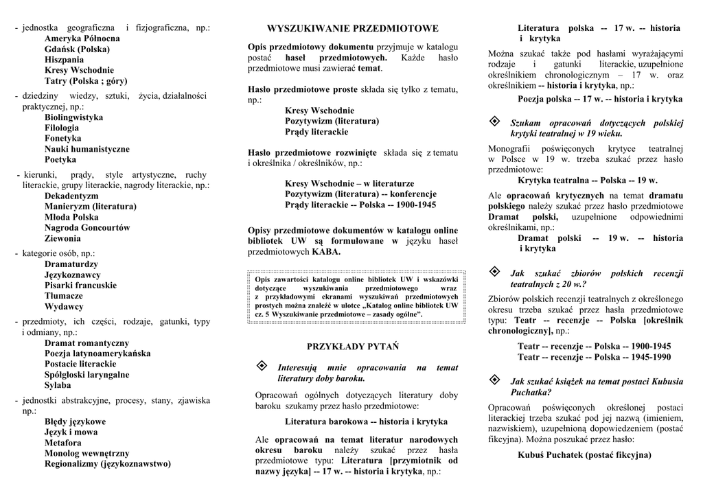 - jednostka geograficzna i fizjograficzna, np.: Ameryka Północna Gdańsk (Polska) Hiszpania Kresy Wschodnie Tatry (Polska ; góry) - dziedziny wiedzy, sztuki, Ŝycia, działalności praktycznej, np.: Biolingwistyka Filologia Fonetyka Nauki humanistyczne Poetyka prądy, style artystyczne, ruchy literackie, grupy literackie, nagrody literackie, np.: Dekadentyzm Manieryzm (literatura) Młoda Polska Nagroda Goncourtów Ziewonia Opis przedmiotowy dokumentu przyjmuje w katalogu postać haseł przedmiotowych. KaŜde hasło przedmiotowe musi zawierać temat. Hasło przedmiotowe proste składa się tylko z tematu, np.: Kresy Wschodnie Pozytywizm (literatura) Prądy literackie Hasło przedmiotowe rozwinięte składa się z tematu i określnika / określników, np.: - kierunki, - kategorie osób, np.: Dramaturdzy Językoznawcy Pisarki francuskie Tłumacze Wydawcy - przedmioty, ich części, rodzaje, gatunki, typy i odmiany, np.: Dramat romantyczny Poezja latynoamerykańska Postacie literackie Spółgłoski laryngalne Sylaba - jednostki abstrakcyjne, procesy, stany, zjawiska np.: Błędy językowe Język i mowa Metafora Monolog wewnętrzny Regionalizmy (językoznawstwo) Literatura polska -- 17 w. -- historia i krytyka WYSZUKIWANIE PRZEDMIOTOWE Kresy Wschodnie – w literaturze Pozytywizm (literatura) -- konferencje Prądy literackie -- Polska -- 1900-1945 Opisy przedmiotowe dokumentów w katalogu online bibliotek UW są formułowane w języku haseł przedmiotowych KABA. Opis zawartości katalogu online bibliotek UW i wskazówki dotyczące wyszukiwania przedmiotowego wraz z przykładowymi ekranami wyszukiwań przedmiotowych prostych moŜna znaleźć w ulotce „Katalog online bibliotek UW cz. 5 Wyszukiwanie przedmiotowe – zasady ogólne”. MoŜna szukać takŜe pod hasłami wyraŜającymi rodzaje i gatunki literackie, uzupełnione określnikiem chronologicznym – 17 w. oraz określnikiem -- historia i krytyka, np.: Poezja polska -- 17 w. -- historia i krytyka Monografii poświęconych krytyce teatralnej w Polsce w 19 w. trzeba szukać przez hasło przedmiotowe: Krytyka teatralna -- Polska -- 19 w. Ale opracowań krytycznych na temat dramatu polskiego naleŜy szukać przez hasło przedmiotowe Dramat polski, uzupełnione odpowiednimi określnikami, np.: Dramat polski -- 19 w. -- historia i krytyka Interesują mnie opracowania literatury doby baroku. Jak szukać zbiorów teatralnych z 20 w.? polskich recenzji Zbiorów polskich recenzji teatralnych z określonego okresu trzeba szukać przez hasła przedmiotowe typu: Teatr -- recenzje -- Polska [określnik chronologiczny], np.: Teatr -- recenzje -- Polska -- 1900-1945 Teatr -- recenzje -- Polska -- 1945-1990 PRZYKŁADY PYTAŃ Szukam opracowań dotyczących polskiej krytyki teatralnej w 19 wieku. na temat Opracowań ogólnych dotyczących literatury doby baroku szukamy przez hasło przedmiotowe: Literatura barokowa -- historia i krytyka Ale opracowań na temat literatur narodowych okresu baroku naleŜy szukać przez hasła przedmiotowe typu: Literatura [przymiotnik od nazwy języka] -- 17 w. -- historia i krytyka, np.: Jak szukać ksiąŜek na temat postaci Kubusia Puchatka? Opracowań poświęconych określonej postaci literackiej trzeba szukać pod jej nazwą (imieniem, nazwiskiem), uzupełnioną dopowiedzeniem (postać fikcyjna). MoŜna poszukać przez hasło: Kubuś Puchatek (postać fikcyjna) Poszukiwane wyraŜenie [-] Kubuś Puchatek (postać fikcyjna) jest odsyłaczem i kieruje do przyjętej formy hasła: Winnie – the – Pooh (postać fikcyjna) Nazwy i nazwiska postaci literatury obcej w hasłach przedmiotowych wyraŜono w języku oryginału, to znaczy w formie nadanej przez pisarza i wyraŜonej w języku danej literatury. Od form nazw w języku polskim prowadzą odsyłacze do formy przyjętej. Interesują twórczości mnie postacie Prusa. kobiece w Opracowań na temat typu postaci w twórczości wybranego autora szukamy przez hasło przedmiotowe o konstrukcji: [nazwisko autora] -postacie -- [typ postaci], np.: Prus, Bolesław (1847-1912) -- postacie -kobiety A w jaki sposób szukać opracowań na temat postaci kobiecych w literaturze, w twórczości róŜnych pisarzy? KsiąŜek na temat typu postaci w twórczości róŜnych pisarzy naleŜy szukać przez hasło przedmiotowe typu: [Typ postaci] -- w literaturze, np.: Kobiety -- w literaturze Dzieci -- w literaturze W podobny sposób szukamy piśmiennictwa poświęconego innym tematom literackim, np.: Faust (postać legendarna) -- w literaturze Jezus Chrystus -- w literaturze Kresy Wschodnie -- w literaturze Koniec świata -- w literaturze Jak szukać opracowań na temat czasowników w języku włoskim? Opracowań dotyczących określonego języka trzeba szukać pod nazwą języka, np.: Biblioteka Uniwersytecka w Warszawie Język łaciński Język włoski Zagadnienia szczegółowe danego języka wyraŜane są w hasłach przedmiotowych rozwiniętych odpowiednimi określnikami, np.: Język francuski--składnia Język niemiecki-- części mowy Język polski-- eufemizmy Opracowań dotyczących czasowników w języku włoskim trzeba szukać przez hasło przedmiotowe: Język włoski--czasowniki Jak szukać piśmiennictwa dotyczącego metod tłumaczenia tekstu francuskiego na język polski? Opracowań na temat metod tłumaczenia tekstu francuskiego na język polski szukamy przez hasło przedmiotowe: Język francuski--tłumaczenie polski na język Jak znaleźć podręczniki języka angielskiego dla Polaków? Podręczników do nauki języka obcego dla osób polskojęzycznych szukamy przez odpowiednie hasło przedmiotowe uzupełnione określnikiem – podręczniki dla polskojęzycznych, np.: Język angielski polskojęzycznych . -- podręczniki dla Oprac. Teresa Głowacka przy współpracy Aliny Cywińskiej Biblioteka Uniwersytecka w Warszawie, ul. Dobra 56/66, 00-312 Warszawa, tel.: (+48 22) 55 25 178 i 55 25 179 (Informatorium); e-mail: [email protected], http://www.buw.uw.edu.pl Katalog online biblio