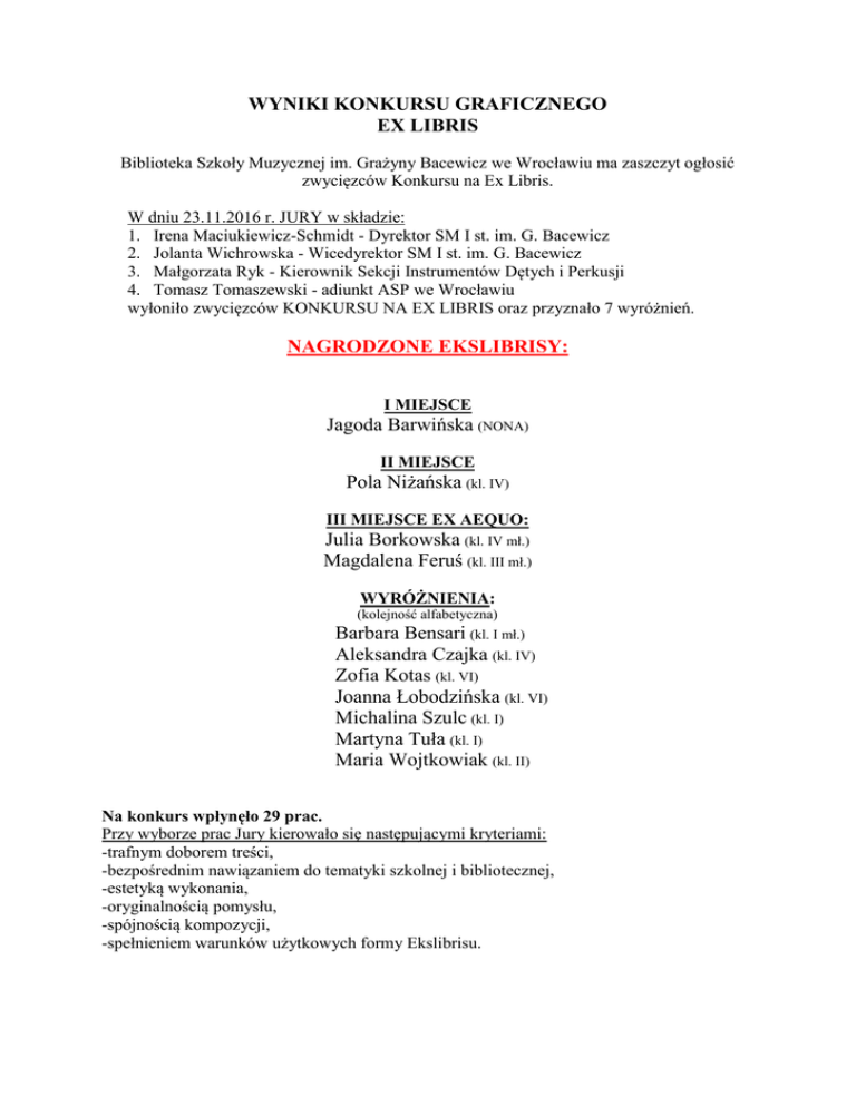 WYNIKI KONKURSU GRAFICZNEGO EX LIBRIS Biblioteka Szkoły Muzycznej im. Grażyny Bacewicz we Wrocławiu ma zaszczyt ogłosić zwycięzców Konkursu na Ex Libris. W dniu 23.11.2016 r. JURY w składzie: 1. Irena Maciukiewicz-Schmidt - Dyrektor SM I st. im. G. Bacewicz 2. Jolanta Wichrowska - Wicedyrektor SM I st. im. G. Bacewicz 3. Małgorzata Ryk - Kierownik Sekcji Instrumentów Dętych i Perkusji 4. Tomasz Tomaszewski - adiunkt ASP we Wrocławiu wyłoniło zwycięzców KONKURSU NA EX LIBRIS oraz przyznało 7 wyróżnień. NAGRODZONE EKSLIBRISY: I MIEJSCE Jagoda Barwińska (NONA) II MIEJSCE Pola Niżańska (kl. IV) III MIEJSCE EX AEQUO: Julia Borkowska (kl. IV mł.) Magdalena Feruś (kl. III mł.) WYRÓŻNIENIA: (kolejność alfabetyczna) Barbara Bensari (kl. I mł.) Aleksandra Czajka (kl. IV) Zofia Kotas (kl. VI) Joanna Łobodzińska (kl. VI) Michalina Szulc (kl. I) Martyna Tuła (kl. I) Maria Wojtkowiak (kl. II) Na konkurs wpłynęło 29 prac. Przy wyborze prac Jury kierowało się następującymi kryteriami: -trafnym doborem treści, -bezpośrednim nawiązaniem do tematyki szkolnej i bibliotecznej, -estetyką wykonania, -oryginalnością pomysłu, -spójnością kompozycji, -spełnieniem warunków użytkowych formy Ekslibrisu. Laureaci I, II i III miejsca otrzymają dyplomy oraz nagrody 9 stycznia 2017 r. podczas Koncertu Jubileuszowego z okazji 70-lecia istnienia Szkoły w Sali Głównej Narodowego Forum Muzyki we Wrocławiu. Wystawa pokonkursowa wszystkich prac odbędzie się na terenie szkoły od 9.01.2017 r. Zwycięskim Ekslibrisem będą sygnowane nuty od roku 2016, natomiast Ekslibrisem z drugą nagrodą będą oznakowane książki. Nagrodzone ekslibrisy zostaną zamieszczone na stronie internetowej Szkoły po 30.11.2016 r. Laureaci I, II i III nagrody proszeni są o zgłoszenie się w przyszłym tygodniu do biblioteki szkolnej. Dziękujemy bardzo wszystkim uczestnikom Konkursu za ich zaangażowanie, trud i przepiękne prace, które pokazały jak wiele talentów mają uczniowie naszej szkoły.