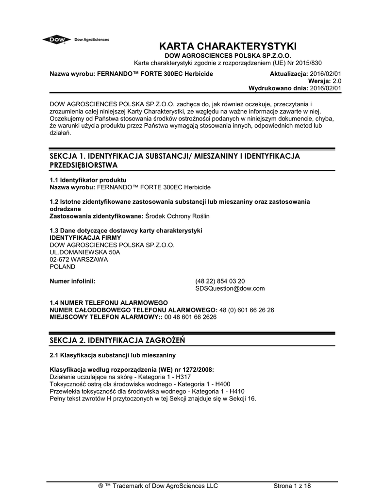 KARTA CHARAKTERYSTYKI DOW AGROSCIENCES POLSKA SP.Z.O.O. Karta charakterystyki zgodnie z rozporządzeniem (UE) Nr 2015/830 Nazwa wyrobu: FERNANDO™ FORTE 300EC Herbicide Aktualizacja: 2016/02/01 Wersja: 2.0 Wydrukowano dnia: 2016/02/01 DOW AGROSCIENCES POLSKA SP.Z.O.O. zachęca do, jak również oczekuje, przeczytania i zrozumienia całej niniejszej Karty Charakterystki, ze względu na ważne informacje zawarte w niej. Oczekujemy od Państwa stosowania środków ostrożności podanych w niniejszym dokumencie, chyba, że warunki użycia produktu przez Państwa wymagają stosowania innych, odpowiednich metod lub działań. SEKCJA 1. IDENTYFIKACJA SUBSTANCJI/ MIESZANINY I IDENTYFIKACJA PRZEDSIĘBIORSTWA 1.1 Identyfikator produktu Nazwa wyrobu: FERNANDO™ FORTE 300EC Herbicide 1.2 Istotne zidentyfikowane zastosowania substancji lub mieszaniny oraz zastosowania odradzane Zastosowania zidentyfikowane: Środek Ochrony Roślin 1.3 Dane dotyczące dostawcy karty charakterystyki IDENTYFIKACJA FIRMY DOW AGROSCIENCES POLSKA SP.Z.O.O. UL.DOMANIEWSKA 50A 02-672 WARSZAWA POLAND Numer infolinii: (48 22) 854 03 20 [email protected] 1.4 NUMER TELEFONU ALARMOWEGO NUMER CAŁODOBOWEGO TELEFONU ALARMOWEGO: 48 (0) 601 66 26 26 MIEJSCOWY TELEFON ALARMOWY:: 00 48 601 66 2626 SEKCJA 2. IDENTYFIKACJA ZAGROŻEŃ 2.1 Klasyfikacja substancji lub mieszaniny Klasyfikacja według rozporządzenia (WE) nr 1272/2008: Działanie uczulające na skórę - Kategoria 1 - H317 Toksyczność ostrą dla środowiska wodnego - Kategoria 1 - H400 Przewlekła toksyczność dla środowiska wodnego - Kategoria 1 - H410 Pełny tekst zwrotów H przytoczonych w tej Sekcji znajduje się w Sekcji 16. ® ™ Trademark of Dow AgroSciences LLC Strona 1 z 18 Nazwa wyrobu: FERNANDO™ FORTE 300EC Herbicide Aktualizacja: 2016/02/01 Wersja: 2.0 2.2 Elementy oznakowania Oznakowanie zgodnie z rozporządzeniem (WE) nr 1272/2008 [CLP / GHS]: Piktogramy określające rodzaj zagrożenia Hasło ostrzegawcze: UWAGA Zwroty wskazujące rodzaj zagrożenia H317 Może powodować reakcję alergiczną skóry. H410 Działa bardzo toksycznie na organizmy wodne, powodując długotrwałe skutki. Zwroty wskazujące środki ostrożności P210 Przechowywać z dala od źródeł ciepła/ iskrzenia/otwartego ognia/gorących powierzchni. Palenie wzbronione. P272 Zanieczyszczonej odzieży ochronnej nie wynosić poza miejsce pracy. P280 Stosować rękawice ochronne/ odzież ochronną. P302 + P352 W PRZYPADKU KONTAKTU ZE SKÓRĄ: Umyć dużą ilością wody z mydłem. P333 + P313 W przypadku wystąpienia podrażnienia skóry lub wysypki: Zasięgnąć porady/ zgłosić się pod opiekę lekarza. P391 Zebrać wyciek. Informacje dodatkowe EUH401 W celu uniknięcia zagrożeń dla zdrowia ludzi i środowiska, należy postępować zgodnie z instrukcją użycia. Zawiera Ester 2-butoksyetylowy trichlopyru 2.3 Inne zagrożenia Brak dostępnych danych SEKCJA 3. SKŁAD/ INFORMACJA O SKŁADNIKACH 3.2 Mieszaniny Ten produkt jest mieszaniną. Nr CAS / Nr WE / Nr Indeksu Numer rejestracyjny REACH Stężenie Składnik Klasyfikacja: ROZPORZĄDZENIE (WE) NR 1272/2008 Strona 2 z 18 Nazwa wyrobu: FERNANDO™ FORTE 300EC Herbicide Aktualizacja: 2016/02/01 Wersja: 2.0 Nr CAS 81406-37-3 Nr WE 279-752-9 Nr Indeksu 607-272-00-5 _ 21,0% (4-amino-3,5Aquatic Acute - 1 - H400 dichloro-6-fluoro-2- Aquatic Chronic - 1 - H410 pirydyloksy)octan metyloheptylu Nr CAS 64700-56-7 Nr WE 265-024-8 Nr Indeksu – _ 19,7% Ester 2butoksyetylowy trichlopyru Acute Tox. - 4 - H302 Skin Sens. - 1 - H317 STOT RE - 2 - H373 Aquatic Acute - 1 - H400 Aquatic Chronic - 1 - H410 Nr CAS 26264-06-2 Nr WE 247-557-8 Nr Indeksu – 01-2119560592-37 < 5,0 % Calcium dodecylbenzene sulfonate Acute Tox. - 4 - H302 Skin Irrit. - 2 - H315 Eye Irrit. - 2 - H319 Nr CAS 78-83-1 Nr WE 201-148-0 Nr Indeksu 603-108-00-1 01-2119484609-23 < 5,0 % 2-metylopropan-1ol Flam. Liq. - 3 - H226 Skin Irrit. - 2 - H315 Eye Dam. - 1 - H318 STOT SE - 3 - H336 STOT SE - 3 - H335 Jeśli w składzie niniejszego produktu wymieniono składniki nie sklasyfikowane<(>,<)> dla których równocześnie nie podano w sekcji 8 żadnych krajowych wartości granicznych narażenia, to składniki te zostały ujawnione dobrowolnie. Pełny tekst zwrotów H przytoczonych w tej Sekcji znajduje się w Sekcji 16. SEKCJA 4. ŚRODKI PIERWSZEJ POMOCY 4.1 Opis środków pierwszej pomocy Porady ogólne: Ratownicy udzielający pierwszej pomocy powinni zwracać uwagę na własną ochronę osobistą i używać zalecanych ubrań ochronnych (chemoodporne rękawice, ochrona przed zachlapaniem) Jeżeli istnieje możliwość narażenia, zobaczyć specyficzny sprzęt ochrony osobistej w Dziale 8. Wdychanie: Przenieść osobę poszkodowaną na powietrze. Jeżeli nie oddycha, wezwać ratownika lub karetkę pogotowia, następnie zastosować sztuczne oddychanie; w przypadku metody usta-usta, ratownik musi być chroniony (maska kieszonkowa itd.). Skontaktować się z ośrodkiem leczenia zatruć lub lekarzem w sprawie porady dotyczącej leczenia. Kontakt przez skórę: Zdjąć zanieczyszczone ubranie. Zmywać skórę dużą ilością wody z mydłem przez 15-20 minut. Zadzwonić do Centrum Informacji Toksykologicznej lub lekarza aby uzyskać poradę dotyczącą dalszego postępowania i leczenia. Wymyć ubranie przed ponownym użyciem. Buty i inne rzeczy skórzane, których nie można odkazić, należy zlikwidować we właściwy sposób. Strona 3 z 18 Nazwa wyrobu: FERNANDO™ FORTE 300EC Herbicide Aktualizacja: 2016/02/01 Wersja: 2.0 Kontakt z oczami: Płukać otwarte oczy powoli i łagodnie wodą przez 15-20 minut. Usuń szkła kontaktowe jeżeli obecne po pierwszych 5 minutach a następnie kontynuuj płukanie oczu. Dzwoń do Krajowego Centrum Informacji Toksykologicznej lub lekarza w celu uzgodnienia leczenia. Odpowiednie urządzenia do przemywania oczu powinny być dostępne na stanowisku pracy. Połknięcie: Zadzwonić do Centrum Informacji Toksykologicznej lub do lekarza w celu uzyskania wskazówe
