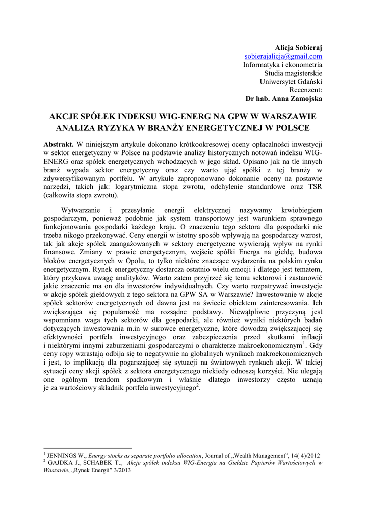 Alicja Sobieraj [email protected] Informatyka i ekonometria Studia magisterskie Uniwersytet Gdański Recenzent: Dr hab. Anna Zamojska AKCJE SPÓŁEK INDEKSU WIG-ENERG NA GPW W WARSZAWIE ANALIZA RYZYKA W BRANŻY ENERGETYCZNEJ W POLSCE Abstrakt. W niniejszym artykule dokonano krótkookresowej oceny opłacalności inwestycji w sektor energetyczny w Polsce na podstawie analizy historycznych notowań indeksu WIGENERG oraz spółek energetycznych wchodzących w jego skład. Opisano jak na tle innych branż wypada sektor energetyczny oraz czy warto ująć spółki z tej branży w zdywersyfikowanym portfelu. W artykule zaproponowano dokonanie oceny na postawie narzędzi, takich jak: logarytmiczna stopa zwrotu, odchylenie standardowe oraz TSR (całkowita stopa zwrotu). Wytwarzanie i przesyłanie energii elektrycznej nazywamy krwiobiegiem gospodarczym, ponieważ podobnie jak system transportowy jest warunkiem sprawnego funkcjonowania gospodarki każdego kraju. O znaczeniu tego sektora dla gospodarki nie trzeba nikogo przekonywać. Ceny energii w istotny sposób wpływają na gospodarczy wzrost, tak jak akcje spółek zaangażowanych w sektory energetyczne wywierają wpływ na rynki finansowe. Zmiany w prawie energetycznym, wejście spółki Energa na giełdę, budowa bloków energetycznych w Opolu, to tylko niektóre znaczące wydarzenia na polskim rynku energetycznym. Rynek energetyczny dostarcza ostatnio wielu emocji i dlatego jest tematem, który przykuwa uwagę analityków. Warto zatem przyjrzeć się temu sektorowi i zastanowić jakie znaczenie ma on dla inwestorów indywidualnych. Czy warto rozpatrywać inwestycje w akcje spółek giełdowych z tego sektora na GPW SA w Warszawie? Inwestowanie w akcje spółek sektorów energetycznych od dawna jest na świecie obiektem zainteresowania. Ich zwiększająca się popularność ma rozsądne podstawy. Niewątpliwie przyczyną jest wspomniana waga tych sektorów dla gospodarki, ale również wyniki niektórych badań dotyczących inwestowania m.in w surowce energetyczne, które dowodzą zwiększającej się efektywności portfela inwestycyjnego oraz zabezpieczenia przed skutkami inflacji i niektórymi innymi zaburzeniami gospodarczymi o charakterze makroekonomicznym 1. Gdy ceny ropy wzrastają odbija się to negatywnie na globalnych wynikach makroekonomicznych i jest, to implikacją dla pogarszającej się sytuacji na światowych rynkach akcji. W takiej sytuacji ceny akcji spółek z sektora energetycznego niekiedy odnoszą korzyści. Nie ulegają one ogólnym trendom spadkowym i właśnie dlatego inwestorzy często uznają je za wartościowy składnik portfela inwestycyjnego2. 1 JENNINGS W., Energy stocks as separate portfolio allocation, Journal of „Wealth Management”, 14( 4)/2012 GAJDKA J., SCHABEK T., Akcje spółek indeksu WIG-Energia na Giełdzie Papierów Wartościowych w Waszawie, „Rynek Energii” 3/2013 2 SEKTOR ENERGETYCZNY - CZY BEZPIECZNY? Pomimo opisanych powyżej zalet, ostatnie wydarzenia i historia notowań mogą zniechęcać inwestorów do angażowania kapitału w sektor energetyczny. Analitycy zgodnie opiniują, że sektor energetyczny reprezentowany na Giełdzie Papierów Wartościowych przez dziewięć spółek to branża notująca ostatnio słabe wyceny. Rozczarowaniem był np. grudniowy debiut spółki Energa. Pierwsze notowanie odbyło się po kursie 16,95zł (0,3% poniżej ceny emisyjnej). Do tej pory na Enerdze zarobiły tylko instytucje finansowe oferujące jej akcje: Giełda Papierów Wartościowych (na prowizji od wysokich obrotów), Skarb Państwa oraz pracownicy spółki, którzy na debiucie wyprzedali przyznane im bezpłatnie akcje3. Jeśli jednak Energa dotrzyma obietnic dotyczących podziału zysków, to oczekiwana stopa dywidendy wynosząca około 7,4%, będzie solidną premią w porównaniu np. do lokat bankowych. Na inwestycjach w energetyczne spółki zarobić nie jest łatwo, a zyski osiągają jedynie cierpliwi4. Celem tego artykułu jest ocena opłacalności inwestycji w polski sektor energetyczny na podstawie analizy historycznych notowań indeksu WIG-ENERG oraz spółek energetycznych wchodzących w jego skład. Indeks notowany jest na Warszawskiej Giełdzie Papierów Wartościowych od grudnia 2009 roku i jest indeksem sektorowym, w którego skład wchodzą spółki uczestniczące w indeksie WIG i jednocześnie zakwalifikowane do sektora „energetyka”. Podlegające badaniu dane pochodzą z okresu trzech lat, od 2011 - 2013 roku. Poniższa tabela prezentuje skład indeksu. Tabela 1. Skład indeksu WIG-ENERG (30.01.2014) Lp 1 2 3 4 5 6 7 8 9 Instrument Pakiet (mln) Wartość rynkowa pakietu (mln PLN) PGE 712,6 11 488 TAURONPE 1 043,6 4 383 ENERGA 207,0 3 354 CEZ 31,2 2 418 ENEA 131,7 1 696 ZEPAK 24,6 571 KOGENERA 7,4 483 PEP 8,4 218 INETRAOLT 4,0 93 24 704 RAZEM Źródło: http://www.gpw.pl/indeksy_gieldowe 31.01.2014 Udział w portfelu (%) 46,5 17,7 13,6 9,8 6,9 2,3 1,9 0,9 0,4 100 Udział w obrotach akcjami i PDA na sesji (%) 4,4 1,3 1,7 0,4 0,2 0,0 0,2 0,0 0,0 8,2 Udział w portfelu jest zdominowany głównie przez trzy spółki: PGE, TAURON oraz ENERGA, które aktualnie stanowią prawie 80% wartości indeksu5. Metodologia subindeksu jest tożsama z indeksem WIG, tzn. że jest on indeksem dochodowym i przy jego obliczaniu 3 http://www.bankier.pl/wiadomosc/Debiut-Energi-nie-dal-zarobic-3012040.html 16.12.2013 http://www.finanse.egospodarka.pl/86631,Inwestycje-w-spolki-energetyczne-tylko-dla-cierpliwych,1,63,1.html 16.12.2013 5 PGE – działalność grupy obejmuje wydobycie węgla brunatnego, wytwarzanie energii elektrycznej i ciepła, obrót hurtowy, dystrybucję i sprzedaż energii elektrycznej; TAURON – drugie pod względem wielkości za PGE przedsiębiorstwo energetyczne. Zajmuje się wytwarzaniem, sprzedażą i dystrybucją energii elektrycznej; ENERGA – grupa, której spółki dzielą się na trzy segmenty: dystrybucja energii elektrycznej, wytwarzanie, sprzedaż; CEZ – czeskie przedsi