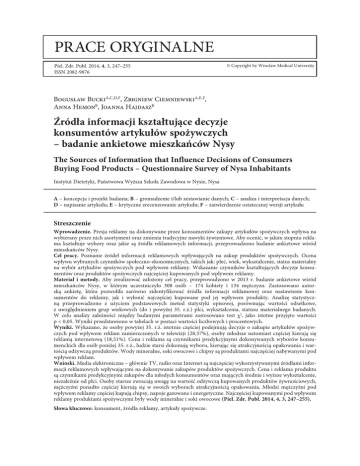 PRACE ORYGINALNE Piel. Zdr. Publ. 2014, 4, 3, 247–255 ISSN 2082-9876 © Copyright by Wroclaw Medical University Bogusław BuckiA,C,D,F, Zbigniew CiemniewskiA,E,F, Anna HemonB, Joanna HajdaszB Źródła informacji kształtujące decyzje konsumentów artykułów spożywczych – badanie ankietowe mieszkańców Nysy The Sources of Information that Influence Decisions of Consumers Buying Food Products – Questionnaire Survey of Nysa Inhabitants Instytut Dietetyki, Państwowa Wyższa Szkoła Zawodowa w Nysie, Nysa A – koncepcja i projekt badania; B – gromadzenie i/lub zestawianie danych; C – analiza i interpretacja danych; D – napisanie artykułu; E – krytyczne zrecenzowanie artykułu; F – zatwierdzenie ostatecznej wersji artykułu Streszczenie Wprowadzenie. Presja reklamy na dokonywane przez konsumentów zakupy artykułów spożywczych wpływa na wybierany przez nich asortyment oraz zmienia tradycyjne nawyki żywieniowe. Aby ocenić, w jakim stopniu reklama kształtuje wybory oraz jakie są źródła reklamowych informacji, przeprowadzono badanie ankietowe wśród mieszkańców Nysy. Cel pracy. Poznanie źródeł informacji reklamowych wpływających na zakup produktów spożywczych. Ocena wpływu wybranych czynników społeczno-ekonomicznych, takich jak: płeć, wiek, wykształcenie, status materialny na wybór artykułów spożywczych pod wpływem reklamy. Wskazanie czynników kształtujących decyzje konsumentów oraz produktów spożywczych najczęściej kupowanych pod wpływem reklamy. Materiał i metody. Aby zrealizować założony cel pracy, przeprowadzono w 2013 r. badanie ankietowe wśród mieszkańców Nysy, w którym uczestniczyło 308 osób – 174 kobiety i 134 mężczyzn. Zastosowano autorską ankietę, która pozwoliła zarówno zidentyfikować źródła informacji reklamowej oraz nastawienie konsumentów do reklamy, jak i wyłonić najczęściej kupowane pod jej wpływem produkty. Analizę statystyczną przeprowadzono z użyciem podstawowych metod statystyki opisowej, porównując wartości odsetkowe, z uwzględnieniem grup wiekowych (do i powyżej 35. r.ż.) płci, wykształcenia, statusu materialnego badanych. W celu analizy zależności między badanymi parametrami zastosowano test χ2, jako istotne przyjęto wartości p < 0,05. Wyniki przedstawiono w tabelach w postaci wartości liczbowych i procentowych. Wyniki. Wykazano, że osoby powyżej 35. r.ż. istotnie częściej podejmują decyzje o zakupie artykułów spożywczych pod wpływem reklam zamieszczonych w telewizji (28,57%), osoby młodsze natomiast częściej kierują się reklamą internetową (18,51%). Cena i reklama są czynnikami predykcyjnymi dokonywanych wyborów konsumenckich dla osób poniżej 35. r.ż., ludzie starsi dokonują wyboru, kierując się atrakcyjnością opakowania i wartością odżywczą produktów. Wody mineralne, soki owocowe i chipsy są produktami najczęściej nabywanymi pod wpływem reklam. Wnioski. Media elektroniczne – głównie TV, radio oraz Internet są najczęściej wykorzystywanymi źródłami informacji reklamowych wpływającymi na dokonywanie zakupów produktów spożywczych. Cena i reklama produktu są czynnikami predykcyjnymi zakupów dla młodych konsumentów oraz mających średnie i wyższe wykształcenie, niezależnie od płci. Osoby starsze zwracają uwagę na wartość odżywczą kupowanych produktów żywnościowych, mężczyźni ponadto częściej kierują się w swoich wyborach atrakcyjnością opakowania. Młodzi mężczyźni pod wpływem reklamy częściej kupują chipsy, napoje gazowane i energetyczne. Najczęściej kupowanymi pod wpływem reklamy produktami spożywczymi były wody mineralne i soki owocowe (Piel. Zdr. Publ. 2014, 4, 3, 247–255). Słowa kluczowe: konsument, źródła reklamy, artykuły spożywcze. 248 B. Bucki et al. Abstract Background. Advertising influences the choices of consumers buying food products and it changes traditional eating habits. The questionnaire survey was conducted among Nysa inhabitants to evaluate to what extend advertising influences these choices and what are the advertising sources. Objectives. The aim of this paper is to identify the advertising sources that influence consumers to buy food products and to evaluate the impact of the selected social and economic factors such as sex, age, education, and financial status on buying food products under the influence of advertising. The authors aimed to indicate factors which encourage customers’ decisions and to name food products most often purchased under the influence of advertising. Material and Methods. To fulfil the study objectives, in 2013 the authors conducted a questionnaire survey among Nysa inhabitants. The group included 174 women and 134 men. The authors’ own questionnaire was used to provide identification of advertising sources and customers’ approach towards advertising, and to select the most often purchased products under the influence of advertising. Statistical analysis was made with the basic methods of descriptive statistics, comparing the percentage values with regard to age groups (up to and above 35 years of age), sex, education, financial status. In order to analyze the interdependences among the parameters, the authors used χ2 test, the significant values were p < 0.05. The results are presented in tables in numerical values and percentages. Results. It has been shown that people above 35 years of age significantly more often decide to buy food products under the influence of commercials (28.57%), younger people are more often guided by the Internet adverting (18.51%). Price and advertising are predictive factors of consumers’ choices for people under 35 years of age, older people make their choices based on attractive packaging and the nutritious value of products. Mineral waters, fruit juices and crisps are the most often purchased products under the influence of advertising. Conclusions. Electronic media, mainly TV, radi