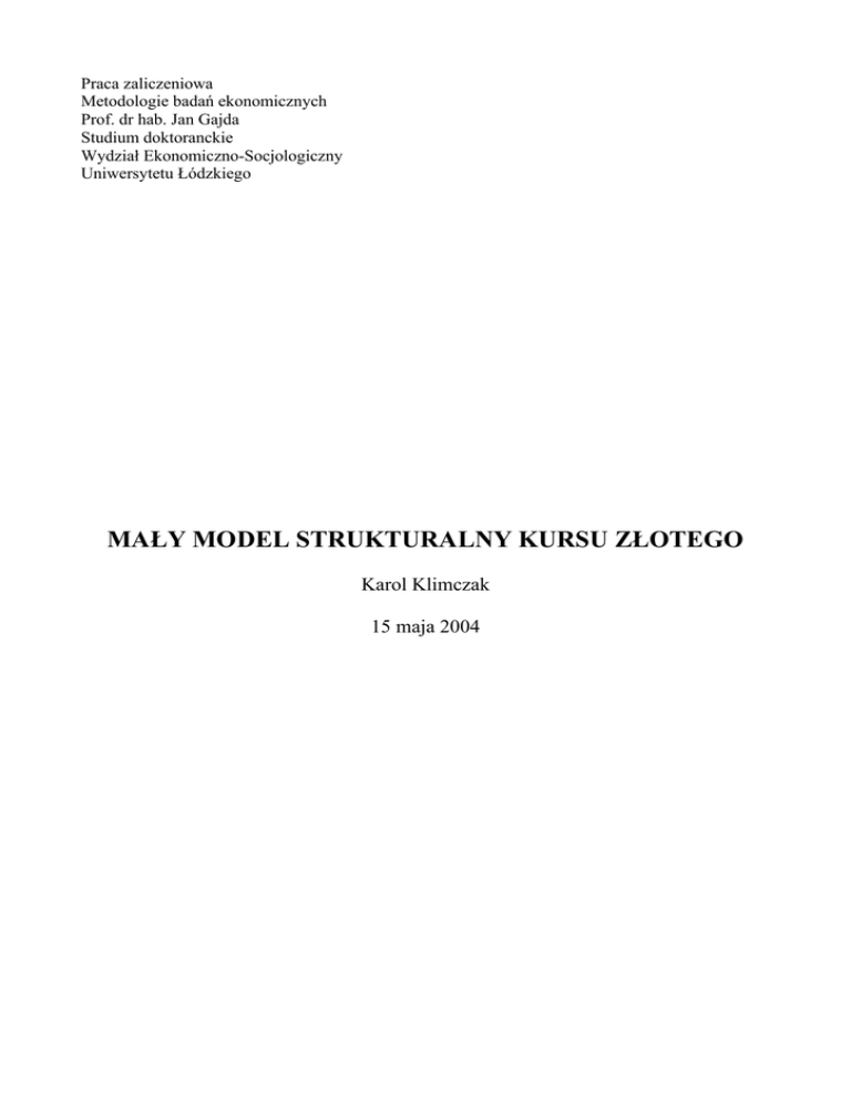 Praca zaliczeniowa Metodologie badań ekonomicznych Prof. dr hab. Jan Gajda Studium doktoranckie Wydział Ekonomiczno-Socjologiczny Uniwersytetu Łódzkiego MAŁY MODEL STRUKTURALNY KURSU ZŁOTEGO Karol Klimczak 15 maja 2004 Praca zaliczeniowa Prof. dr hab. Jan Gajda 15.05.2004 Karol Klimczak MAŁY MODEL STRUKTURALNY KURSU ZŁOTEGO Celem poniższej pracy jest próba estymacji małego modelu strukturalnego kursu złotego wobec euro w oparciu o klasyczny model monetarystyczny. Model ma za zadanie zbadać podstawowe, średniookresowe związki między kursem walutowym a głównymi zmiennymi gospodarczymi. W pierwszej części przedstawiono zarys teorii modeli determinacji kursów walutowych oraz uzasadnienie wyboru postaci modelu do weryfikacji empirycznej. Część druga zawiera omówienie procedury estymacji modelu. Pracę zamyka podsumowanie wyników. I. Model W dobie dominacji reżimów zmiennych kursów walutowych oraz narastającej zmienności samych kursów modelowanie ich w oparciu o czynniki fundamentalne nastręcza wielu trudności. Choć literatura dotyczące tego tematu jest szeroka, trudno jest znaleźć udane próby estymacji modeli kursów walutowych po roku 1970. Jednak, mimo zniechęcających wyników większości badań, problem ten pozostaje w centrum zainteresowania badaczy ze względu na jego wagę dla prowadzenia polityki gospodarczej1. W celu osiągnięcia lepszej oceny związków długookresowych wykorzystuje się dziś analizę kointegracyjną, natomiast w okresie krótkim skuteczne są przede wszystkim modele autoregresyjne takie jak ARCH2. W poniższej pracy użyto jedynie standardowych metod ekonometrycznych, ponieważ celem prezentowanego modelu było zbadanie wpływu czynników fundamentalnych w sposób prosty i dostępny dla większej części uczestników rynku. Motywacją dla przedstawionego badania było uzyskanie odpowiedzi na pytanie, czy fundamentalny model kursu złotego jest przydatny do praktycznego wykorzystania w przedsiębiorstwach do celów zarządzania ryzykiem? Grupą modeli, po które najczęściej sięgają ekonometrycy badający zachowanie kursów walutowych są powstałe w latach 70-tych modele monetarystyczne, które rozwinęły się w oparciu o model Mundella-Fleminga. Klasyczny model monetarystyczny opiera się o założenie ciągłego zachowania parytetu siły nabywczej, ujmując kurs walutowy jako relatywną cenę pieniądza dwóch krajów:3 1 MacDonald, Ronald, „Exchange Rate Behaviour: Are Fundmantals Important?”, The Economic Journal, No. 109, 1999, s. 673 2 Brzeszczyński, Janusz, Robert Kelm, Ekonometryczne modele rynków finansowych, WIGPress, Warszawa 2002, s. 119. 3 Taylor, Mark P., „The Economics of Exchange Rates”, Journal of Economic Literature, Vol. XXXIII, March 1995, s. 21. 2 st = pt − pt* (1) gdzie s oznacza logarytm naturalny kursu walutowego, a p oraz p* - logarytmy naturalne poziomów cen w kraju i zagranicą. Według założeń modelu powyższa zależność musi być zachowana we wszystkich okresach, a zatem także w krótkim okresie, co stanowi podstawową słabość klasycznej postaci modelu. Większość badań wskazuje bowiem na nieważność parytetu siły nabywczej w krótkim jak i w długim okresie, chociażby ze względu na niestacjonarność realnych kursów walutowych4, jak i presję spekulacyjną. Modelem alternatywnym wobec klasycznego modelu monetarystycznego jest keynesowski w duchu model „lepkich cen”5. Modele tego typu wychodzą od założenia ciągłości parytetu stóp procentowych, natomiast pozwalają na krótkookresowe odejście od parytetu siły nabywczej (który zachowuje ważność w długim okresie). Model ten można zredukować do układu dwóch równań różnicowych6: s& 0 p& = γµ 1/ θ s − s − γ ( µ + ψ / θ ) p − p (2) gdzie s oznacza kurs walutowy, a p – poziom cen, natomiast kreska nad symbolem zmiennej oznacza jej wartość w stanie długookresowej równowagi. Model pozwala na krótkookresowe przestrzelanie poziomów równowagi przez zarówno ceny jak i kurs waluty, przy czym oczekiwaną zmianą kursu jest ruch w kierunku równowagi. Jednak problemem, ograniczającym możliwość użycia tego modelu w poniższej pracy, jest konieczność modelowania poziomu kursu walutowego i cen w stanie długookresowej równowagi. Ponadto dowody empiryczne na ważność modelu w przypadku reżimów zmiennego kursu walutowego pozostają słabe7. Dla celów poniższej pracy zastosujemy zatem zmodyfikowaną postać klasycznego modelu monetarystycznego. Podstawę modelu stanowi równanie parytetu siły nabywczej (PPP), w którym nie uwzględniono warunku homogeniczności cen. Podejście to podyktowane jest zastosowaniem do estymacji globalnych indeksów cen, które zawierają zarówno dobra wymienialne jak i dobra niewymienialne, stanowiąc zatem jedynie aproksymację „właściwego” poziomu cen8. Wobec powyższego, równanie relatywnego parytetu siły nabywczej, gdzie ∆ oznacza pierwsze różnice logarytmów naturalnych zmiennych, przyjmuje postać: ∆st = α1∆pt − α 2 ∆pt* + µt 4 (3) MacDonald, Ronald, „Long-Run Purchasing Power Parity: Is It For Real?”, The Review of Economics and Statistics, Vol. 75 (November), 1993, s. 690. 5 Mussa, Michael, „A Model of Exchange Rate Dynamics”, Journal of Political Economy, Vol. 90, No. 1, 1982, s. 74104., oraz Rudiger Dornbusch , „Expectations and Exchange Rate Dynamics”, Journal of Political Economy, Vol. 84, No. 6, 1976, s. 1161-1176. 6 Taylor, M. P. op. cit., s. 23 7 Taylor, M. P. op. cit., s. 29, oraz Rosenberg, Michael R., Currency forecasting: A Guide to Fundamental Models of Exchange Rate Determination, IRWIN, Chicago, 1996, s. 155 8 MacDonald 1993, s 691-692. 3 Żadne hipotezy nie są stawiane odnośnie wartości parametrów, za wyjątkiem stacjonarności reszty µ. Użycie relatywnej postaci parytetu siły nabywczej podyktowane jest także zastosowaniem indeksów cen zamiast właściwych ich poziomów9. N