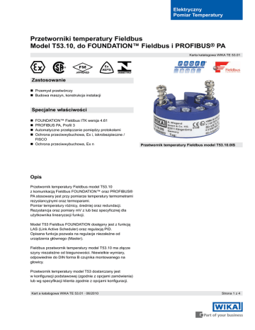 Elektryczny Pomiar Temperatury Przetworniki temperatury Fieldbus Model T53.10, do FOUNDATION™ Fieldbus i PROFIBUS® PA Karta katalogowa WIKA TE 53.01 Zastosowanie Przemysł przetwórczy Budowa maszyn, konstrukcja instalacji Specjalne właściwości FOUNDATION™ Fieldbus ITK wersja 4.61 PROFIBUS PA, Profil 3 Automatyczne przełączanie pomiędzy protokołami Ochrona przeciwwybuchowa, Ex i, iskrobezpieczne / FISCO Ochrona przeciwwybuchowa, Ex n Przetwornik temperatury Fieldbus model T53.10.0IS Opis Przetwornik temperatury Fieldbus model T53.10 z komunikacją Fieldbus FOUNDATION™ oraz PROFIBUS® PA stosowany jest przy pomiarze temperatury termometrami rezystancyjnymi oraz termoparami. Pomiar temperatury różnicy, średniej oraz redundacji. Rezystancja oraz pomiary mV z lub bez specyficznej dla użytkownika linearyzacji funkcji. Model T53 Fieldbus FOUNDATION dostępny jest z funkcją LAS (Link Active Scheduler) oraz regulacją PID. Opisana funkcja pozwala na regulacje niezależne od urządzenia głównego (Master). Fieldbus przetwornik temperatury model T53.10 ma złącze szyny niezależne od biegunowości. Niewielkie wymiary, odpowiednie do DIN forma B czujnika montowanego na głowicy. Przetwornik temperatury model T53 dostarczany jest w konfiguracji podstawowej (zgodnie z opcjami zamówienia) lub wg specyfikacji klienta zgodnie z opcjami konfiguracji. Kart a katalogowa WIKA TE 53.01 ∙ 06/2010 Strona 1 z 4 Wejście konfigurowane Termometr rezystancyjny Termoelementy Zewnętrzna CJC (kompensacja zimnego złącza) Czujnik rezystancyjny Czujnik rezystancyjny, potencjometryczny Czujnik mV Konfiguracja podstawowa Prąd czujnika Max. rezystancja przewodu Dokładność, przy 24 °C ± 4 K Błąd kompensacji zimnego złącza (CJC) Wyjście Wersja Funkcjonalność Bloki funkcji Fieldbusa Czas wykonania, kontroler PID Kompatybilność elektromagnetyczna (EMC) Warunik otoczenia Temperatura otoczenia i przechowywania Maks. dopuszczalna wilgotność Wibracje Dodatkowe Izolacja napięcia test/praca Czas odpowiedzi Czas aktualizacji Czas wykonania, analogowy blok wejścia Obudowa Materiał Stopień ochrony obudowy złącza zaciskowego Przekroje złączy końcówek Waga Ochrona przeciwwybuchowa / zasilanie elektryczne Model T53.10 Czujnik Pt25 ... Pt1000 (α = 0,00385) Pt25 ... Pt1000 (α = 0,003916) Ni25 ... Ni1000 Cu10 ... Cu1000 B E J K L N R S T U W3 W5 Zakres pomiaru -200 °C ... +850 °C -200 °C ... +850 °C -60 °C ... +250 °C -50 °C ... +200 °C +400 °C ... +1820 °C -100 °C ... +1000 °C -100 °C ... +1200 °C -180 °C ... +1372 °C -200 °C ... +900 °C -180 °C ... +1300 °C -50 °C ... +1760 °C -50 °C ... +1760 °C -200 °C ... +400 °C -200 °C ... +600 °C 0 °C ... +2300 °C 0 °C ... +2300 °C Standardowe IEC 60 751 JIS C1604 (1989) DIN 43 760 α = 0,00427 IEC 584 IEC 584 IEC 584 IEC 584 DIN 43 710 IEC 584 IEC 584 IEC 584 IEC 584 DIN 43 710 ASTM E988-90 ASTM E988-90 -40 °C ... +135 °C T53.10.0IS Certyfikat testu typu EC: KEMA 06ATEX0148X Strefa 0,1: II 1G Ex ia IIC T4/T5/T6 Strefa 0,1: II 1D Ex iaD Zatwierdzenie CSA 1807316 IS, Klasa I, Poddział 1, Grupa A, B, C, D Zatwierdzenie FM: 3027564 (Inst. Drg: 11175631) IS, Klasa I, Podział1, Grupa A, B, C, D Nieiskrzący, Klasa I, Poddział 2, Grupa A, B, C, D KEMA 06ATEX0148X 0 ... 100 kΩ Czujnik Zasilanie UB dopuszczalna Najwyższe wartości dot. bezpieczeństwa 1)´/ temperatura otoczenia/ Pętla prądowa Sensor przechowywania (Anschlüsse 1 und 2) (Anschlüsse 3 bis 6) przerwanie pądu ( wg obecnych klas temperaturowych) Zatwierdzenia T53.10.0IS Certyfikat testu typu EC: 0 ... 10 kΩ -800 ... +800 mV Pt100, 3-przewodowy typowo 0,2 mA 50 Ω na przewód Model Strefa 0,1: II 2G (1) G Ex ib [ia] IIC T4/T5/T6 Zatwierdzenie CSA 1807316 IS, Klasa I, Poddział1, Grupa A, B, C, D 0 °C ... 100 °C Dokładność podstawowa Wspóczynnik temperatury ≤ ± 0,002 °C / °C ≤ ± 0,002 °C / °C ≤ ± 0,02 °C / °C ≤ ± 0,002 Ω / °C ≤ ± 0,2 µV / °C ≤ ± 0,01 °C / °C ≤ ± 0,025 °C / °C Pt100 and Pt1000 ≤ ± 0,1 °C Ni100 ≤ ± 0,15 °C Cu10 ≤ ± 1,3 °C Lin. R. ≤ ± 0,05 Ω Volt ≤ ± 10 µV Typ TE: E, J, K, L, N, T, U ≤ ± 0,5 °C Typ TE: B, R, S, W3, W5 ≤ ± 1 °C ≤ ± 0,5 °C FOUNDATION™ Fieldbus PROFIBUS® PA ITK wersja 4.61 EN 50 170 poz. 2 / profil 3 Podstawowa lub LAS 2 analogowe i 1 PID 2 analogowe < 200 ms norma EMC 2004/108/EG, EN 61326 emisja (Grupa 1, Klasa B) i odporność na zakłócenia (zakres przemysłowy) również wg NAMUR NE 21 -40 ... +85 °C 95% wilgotność względna, bez kompensacji wilgoci 2 ...100 Hz 4g DIN EN 60068-2-6 Zatwierdzenie FM: 3027564 (Inst. Drg: 11175631) IS, Klasa I, Poddział 1, Grupa A, B, C, D Nieiskrzący, Klasa I, Poddział 2, Grupa A, B, C, D T53.10.0NI EG-Baumusterprüfbescheinigung: KEMA 06ATEX0149X Strefa 2: II 3GD Ex nA [nL] IIC T4/T5/T6 Strefa 2: II 3GD Ex nL IIC T4/T5/T6 Strefa 2: II 3GD Ex nA [ic] IIC T4/T5/T6 Strefa 2: II 3GD Ex ic IIC T4/T5/T6 -40 … +85 °C (T4) -40 … +75 °C (T5) -40 … +60 °C (T6) Ui = DC 30 V Ii = 120 mA Pi = 0,84 W -40 … +75 °C (T4) -40 … +65 °C (T5) -40 … +45 °C (T6) Ui = DC 30 V Ii = 300 mA Pi = 1,3 W -40 … +85 °C (T4) -40 … +60 °C (T5) -40 … +45 °C (T6) Ci = 2 nF Li = 1 µH -40 … +85 °C (T4) -40 … +60 °C (T5) -40 … +45 °C (T6) Ui = DC 17.5 V (FISCO) Ii = 250 mA Pi = 2,0 W Ui = DC 15 V Ii = dowolna Pi = dowolna -40 … +85 °C (T4) -40 … +75 °C (T5) -40 … +60 °C (T6) Ui = DC 30 V Ii = 250 mA Pi = 5,32 W Ci = 2 nF Li = 1 µH -40 … +85 °C (T4) -40 … +75 °C (T5) -40 … +60 °C (T6) Ui = DC 17,5 V (FISCO) Ii = dowolna Pi = dowolna Ci = 2 nF Li = 1 µH -40 … +85 °C (T4) -40 … +75 °C (T5) -40 … +60 °C (T6) Ui = DC 32 V FNICO (FISCO) Ci = 2nF Li = 1µH Ci = 2 nF Uo = 5,7 V Li = 1 µH Io = 8,4 mA Po = 12 mW Ci = 2 nF Co = 40µF Li = 1 µH Lo = 200 mH DC 9 … 32 V/ < 11 mA Ci = 2 nF Li = 1 µH Ui = DC 17,5 V Zatwierdzenie CSA: 1807316 Zatwierdzenie FM: 3027564 (Inst. Drg: 11175631)