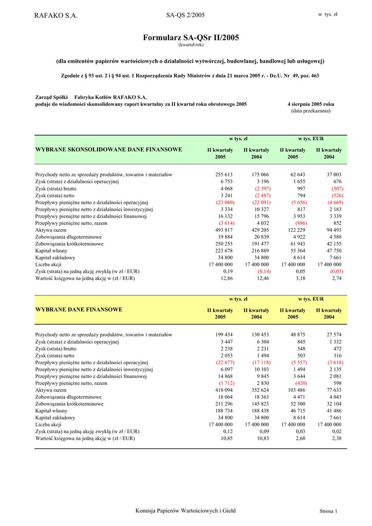 RAFAKO S.A. SA-QS 2/2005 w tys. zł Formularz SA-QSr II/2005 (kwartał/rok) (dla emitentów papierów wartościowych o działalności wytwórczej, budowlanej, handlowej lub usługowej) Zgodnie z § 93 ust. 2 i § 94 ust. 1 Rozporządzenia Rady Ministrów z dnia 21 marca 2005 r. - Dz.U. Nr 49, poz. 463 Zarząd Spółki Fabryka Kotłów RAFAKO S.A. podaje do wiadomości skonsolidowany raport kwartalny za II kwartał roku obrotowego 2005 w tys. zł 4 sierpnia 2005 roku (data przekazania) w tys. EUR WYBRANE SKONSOLIDOWANE DANE FINANSOWE II kwartały 2005 II kwartały 2004 II kwartały 2005 II kwartały 2004 Przychody netto ze sprzedaży produktów, towarów i materiałów Zysk (strata) z działalności operacyjnej Zysk (strata) brutto Zysk (strata) netto Przepływy pieniężne netto z działalności operacyjnej Przepływy pieniężne netto z działalności inwestycyjnej Przepływy pieniężne netto z działalności finansowej Przepływy pieniężne netto, razem Aktywa razem Zobowiązania długoterminowe Zobowiązania krótkoterminowe Kapitał własny Kapitał zakładowy Liczba akcji Zysk (strata) na jedną akcję zwykłą (w zł / EUR) Wartość księgowa na jedną akcję w (zł / EUR) 255 613 6 753 4 068 3 241 (23 080) 3 334 16 132 (3 614) 493 817 19 884 250 255 223 678 34 800 17 400 000 0,19 12,86 175 066 3 196 (2 397) (2 487) (22 091) 10 327 15 796 4 032 429 205 20 839 191 477 216 889 34 800 17 400 000 (0,14) 12,46 62 643 1 655 997 794 (5 656) 817 3 953 (886) 122 229 4 922 61 943 55 364 8 614 17 400 000 0,05 3,18 37 003 676 (507) (526) (4 669) 2 183 3 339 852 94 493 4 588 42 155 47 750 7 661 17 400 000 (0,03) 2,74 w tys. zł w tys. EUR WYBRANE DANE FINANSOWE II kwartały 2005 II kwartały 2004 II kwartały 2005 II kwartały 2004 Przychody netto ze sprzedaży produktów, towarów i materiałów Zysk (strata) z działalności operacyjnej Zysk (strata) brutto Zysk (strata) netto Przepływy pieniężne netto z działalności operacyjnej Przepływy pieniężne netto z działalności inwestycyjnej Przepływy pieniężne netto z działalności finansowej Przepływy pieniężne netto, razem Aktywa razem Zobowiązania długoterminowe Zobowiązania krótkoterminowe Kapitał własny Kapitał zakładowy Liczba akcji Zysk (strata) na jedną akcję zwykłą (w zł / EUR) Wartość księgowa na jedną akcję w (zł / EUR) 199 434 3 447 2 238 2 053 (22 677) 6 097 14 868 (1 712) 418 094 18 064 211 296 188 734 34 800 17 400 000 0,12 10,85 130 453 6 304 2 231 1 494 (17 118) 10 103 9 845 2 830 352 624 18 363 145 823 188 438 34 800 17 400 000 0,09 10,83 48 875 845 548 503 (5 557) 1 494 3 644 (420) 103 486 4 471 52 300 46 715 8 614 17 400 000 0,03 2,68 27 574 1 332 472 316 (3 618) 2 135 2 081 598 77 633 4 043 32 104 41 486 7 661 17 400 000 0,02 2,38 Komisja Papierów Wartościowych i Giełd Strona 1 SA-QS 2/2005 RAFAKO S.A. Skonsolidowany bilans w tys. zł 30.06.2005 31.03.2005 31.12.2004 30.06.2004 Majątek trwały 153 171 153 509 157 943 164 849 Rzeczowy majątek trwały Nieruchomości inwestycyjne Wartości niematerialne i prawne 115 042 11 482 14 930 115 907 11 505 15 119 117 643 11 528 15 182 120 023 11 573 15 354 Udziały w jednostkach zależnych nie objętych konsolidacją Udziały w pozostałych jednostkach 242 1 516 242 3 557 242 3 557 242 3 559 Udzielone pożyczki długoterminowe Lokaty długoterminowe Pozostałe należności długoterminowe Aktywa do zbycia 1 537 1 000 39 - 1 554 1 010 37 - 3 104 1 008 38 - 6 912 1 376 40 2 197 Aktywo z tytułu odroczonego podatku dochodowego 7 383 4 578 5 641 3 573 340 646 283 008 261 005 264 356 8 620 25 5 025 4 205 15 313 25 4 712 4 199 12 234 25 6 423 4 027 18 274 9 000 3 830 Należności handlowe - do 12 miesięcy - powyżej 12 miesięcy Należności z tytułu podatku dochodowego Pozostałe należności 176 560 172 737 3 823 25 372 123 092 119 703 3 389 1 647 30 654 135 454 124 468 10 986 1 018 23 999 156 899 141 660 15 239 16 226 Zapasy Rozliczenia międzyokresowe czynne 16 567 104 272 18 915 84 451 20 417 57 408 25 316 34 811 AKTYWA RAZEM 493 817 436 517 418 948 429 205 Majątek obrotowy Środki pieniężne Lokaty krótkoterminowe Udzielone pożyczki krótkoterminowe Obligacje Komisja Papierów Wartościowych i Giełd Strona 2 SA-QS 2/2005 RAFAKO S.A. Skonsolidowany bilans w tys. zł 30.06.2005 31.03.2005 31.12.2004 30.06.2004 Kapitał własny 223 678 223 866 220 601 216 889 Kapitał akcyjny Nadwyżka ze sprzedaży akcji powyżej wartości nominalnej Różnice kursowe z przeliczenia jednostki zagranicznej Zyski zatrzymane 34 800 36 778 6 146 370 34 800 36 778 34 800 36 778 34 800 36 778 146 553 143 427 140 433 5 724 5 735 5 596 4 878 Zobowiązania długoterminowe 19 884 21 379 24 467 20 839 Długoterminowe kredyty i pożyczki Rezerwa na świadczenia emerytalne i podobne Pozostałe rezerwy Rezerwa na odroczony podatek dochodowy 450 15 935 2 537 962 850 15 935 2 496 2 098 900 15 935 5 261 2 371 1 350 15 760 1 949 1 780 250 255 191 272 173 880 191 477 Zobowiązania handlowe - do 12 miesięcy - powyżej 12 miesięcy 85 881 78 665 7 216 57 275 52 162 5 113 64 723 59 504 5 219 64 253 61 694 2 559 Krótkoterminowe kredyty i pożyczki Zobowiązania z tytułu podatku dochodowego Pozostałe zobowiązania 59 067 1 929 22 308 64 747 1 360 15 609 40 354 561 15 389 46 703 1 488 18 244 Rozliczenia międzyokresowe bierne Przychody przyszłych okresów 15 660 65 410 14 717 37 564 13 346 39 507 27 001 33 788 493 817 436 517 418 948 429 205 Wartość księgowa Liczba akcji Wartość księgowa na jedną akcję (w zł) 223 678 17 400 000 12,86 223 866 17 400 000 12,87 220 601 17 400 000 12,68 216 889 17 400 000 12,46 Skonsolidowane pozycje pozabilansowe 30.06.2005 31.03.2005 31.12.2004 30.06.2004 67 972 72 391 78 004 86 855 67 972 46 551 21 421 - 72 391 52 393 19 998 - 3 903 3 903 74 101 49 912 20 702 3 487 4 546 200 4 346 82 309 55 904 21 422 4 983 334 338 301 291 291 146 277 689 5 607 5 607 328 731 223 643 105 088 - 5 663 5 663 295 628 187 663 107 965 - 5 657 5 657 285 489 181 