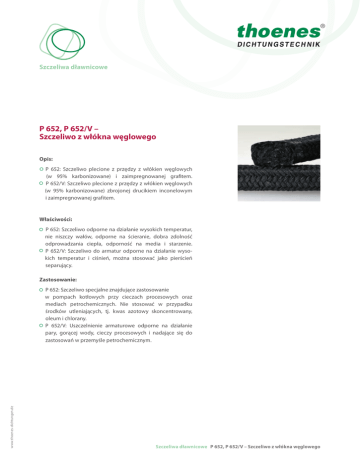 ® Szczeliwa dławnicowe P 652, P 652/V – Szczeliwo z włókna węglowego Opis: P 652: Szczeliwo plecione z przędzy z włókien węglowych (w 95% karbonizowane) i zaimpregnowanej grafitem. P 652/V: Szczeliwo plecione z przędzy z włókien węglowych (w 95% karbonizowane) zbrojonej drucikiem inconelowym i zaimpregnowanej grafitem. Właściwości: P 652: Szczeliwo odporne na działanie wysokich temperatur, nie niszczy wałów, odporne na ścieranie, dobra zdolność odprowadzania ciepła, odporność na media i starzenie. P 652/V: Szczeliwo do armatur odporne na działanie wysokich temperatur i ciśnień, można stosować jako pierścień separujący. Zastosowanie: www.thoenes-dichtungen.de P 652: Szczeliwo specjalne znajdujące zastosowanie w pompach kotłowych przy cieczach procesowych oraz mediach petrochemicznych. Nie stosować w przypadku środków utleniających, tj. kwas azotowy skoncentrowany, oleum i chlorany. P 652/V: Uszczelnienie armaturowe odporne na działanie pary, gorącej wody, cieczy procesowych i nadające się do zastosowań w przemyśle petrochemicznym. Szczeliwa dławnicowe P 652, P 652/V – Szczeliwo z włókna węglowego Szczeliwa dławnicowe Zakresy zastosowań: P 652/ p (bar) vg (m/s) Pompa - 40 25 Tłok - 100 2,0 Armatura V 200* 200 1,5* 1,5 pH T (°C) 1 – 14 -100/+450 * zamknięty Forma dostawy: Wymiary Ilość w opakow. Wymiary Ilość w opakow. mm 4 5 Cale 5/32 3/16 m 40 mm 16 18 19 20 22 Cale 5/8 11/16 3/4 13/16 7/8 m 6 6,5 8 9,5 1/4 5/16 3/8 30 10 20 24 12 12,7 14 1/2 9/16 15 25 1 10 www.thoenes-dichtungen.de Z uwagi na różnorodność warunków montażu i eksploatacji, a także techniki i technologii zastosowań, dane zawarte na niniejszej stronie mogą pełnić jedynie funkcję niewiążących wytycznych. Zasadniczo należy pamiętać, że podane tu zakresy zastosowań oddziałują na siebie nawzajem, lub mogą zostać obniżone w przypadku współdziałania z mediami krytycznymi. Wartości maksymalne mają tu więc charakter orientacyjny i nie mogą być stosowane jednocześnie. Dane te nie mogą stanowić podstawy do wnoszenia roszczeń gwarancyjnych. W tym momecie tracą swą ważność wszystkie wydane dotychczas opracowania. Szczeliwa dławnicowe P 652, P 652/V – Szczeliwo z włókna węglowego
