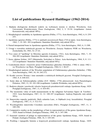 1 List of publications Ryszard Haitlinger (1962-2014) 1. Badania ekologiczne drobnych ssaków na wybranym terenie w okolicy Wrocławia. Acta Universtatis Wratislaviensis, Prace Zoologiczne, 1962, I, 3: 35-54. (współautor: Antoni Korzeniowski, mój udział: 80%). 2. Morphological variability in Apodemus agrarius (Pallas, 1771). Acta theriologica, 1962, 6, 8: 239255. 3. Apodemus agrarius (Pallas, 1771) w partiach szczytowych Ślęży (718 m npm). Acta theriologica, 1963, 7, 19: 383- 385 (współautor: Stanisław Humiński, mój udział 50%). 4. Paired interparietal bone in Apodemus agrarius (Pallas, 1771). Acta theriologica, 1963, 6, 11:308. 5. Uwagi o rozrodzie niektórych gryzoni we Wrocławiu. Zeszyty Naukowe WSR we Wrocławiu, Zootechnika XI, 1963, 52: 27-41. 6. Two cases of "spothing" in Microtus agrestis (Linnaeus, 1761). Acta theriologica, 1963, 7, 19: 384-385 (współautor: Stanisław Humiński, mój udział 50%). 7. Sorex alpinus Schinz, 1837 (Mammalia, Soricidae) w Polsce. Acta theriologica, 1964, 9, 8: 111123 (współautor: Stanislaw Humiński, mój udział 50%). 8. Uszkodzenia drzew i krzewów przez Clethrionomys glareolus (Schreber, 1780) w zimie 1962 r. we Wrocławiu i na Ślęży. Przegląd Zoologiczny, 1964, 8, 1: 86-87. 9. Morphological analysis of the Wrocław population of Clethrionomys glareolus (Schreber, 1780). Acta theriologica, 1965, 10, 18: 242-272. 10. Kostki szwowe Worma i inne anomalie u niektórych drobnych gryzoni. Przeglad Zoologiczny, 1965, 9, 4: 430-433. 11. Some data on Schistocephalus solidus (O.F. Müller, 1776) plerocercoid. Acta Parasitologica Polonica, 1965, 13, 10: 103-108 (współautor: Ludmiła Wolańska, mój udział 80%). 12. Budowa rdzenia i powłoczki włosów krajowych przedstawicieli rodzaju Apodemus Kaup, 1829. Przegląd Zoologiczny, 1967, 11, 4: 434-441. 13. The taxonomic value of teeth measurements in the subgenus Sylvaemus Ognev & Vorobiev, 1923. Acta theriologica, 1967, 12, 12: 180-187 (współautor: Andrzej Ruprecht, mój udział 50%). 14. Stanowisko ropuchy paskówki, Bufo calamita Laur., w Dąbkach (woj. koszalińskie). Przegląd Zoologiczny, 1967, 11, 3: 312-313. 15. Wysokogórskie stanowisko Crocidura suaveolens (Pall.). Przegląd Zoologiczny, 1967, 11, 3: 349-350. 16. Comparative studies on the morphology of hair in representatives of the genus Apodemus Kaup., 1829, found in Poland. Zoologica Poloniae, 1968, 18, 3: 347-380. 17. Seasonal variation of pelage in representatives of the genus Apodemus Kaup., 1829, found in Poland. Zoologica Poloniae, 1968, 18, 3: 329-345. 18. Przebieg i topografia linienia u krajowych przedstawicieli rodzaju Apodemus Kaup., 1829. 2 Przegląd Zoologiczny, 1968, 12, 3: 327-336. 19. Wysokogórskie stanowisko Neomys anomalus Cabrera, 1907 i Apodemus agrarius (Pallas, 1771). Przegląd Zoologiczny, 1969, 13, 3: 271-272. 20. Morphplogical variability of the Wrocław population of Apodemus sylvaticus (Linnaeus, 1758). Acta theriologica, 1969, 14, 21: 285-302. 21. Pitymys Mc Murtrie, 1931, from the Beskid Żywiecki and the Sudetes. Acta theriologica, 1970, 15, 23: 365-370. 22. Przyczynek do znajomości fauny pcheł w Polsce. Przegląd Zoologiczny, 1970, 14, 1: 82-84. 23. Die Flöhe (Siphonaptera) der Kleinsäuger aus den West und Mittelsudeten. Polskie Pismo Entomologiczne, 1970, 40, 4: 749-762. 24. Morphological characters of mountain populations of the Clethrionomys glareolus (Schreber, 1780) and Apodemus agrarius (Pallas, 1771). Acta theriologica, 1970, 40, 4: 749-762. 25. Drobne ssaki Beskidu Żywieckiego. Acta Zoologica Cracoviensia, 1971, 16, 8: 413-433 (współautor Stanisław Chudoba, mój udział 90%). 26. Aphanipterofauna drobnych gryzoni i owadożernych Wrocławia. Zeszyty Naukowe WSR we Wrocławiu, Zootechnika 17, 1971, 88: 9-20. 27. Die Flöhe (Siphonaptera) der Kleinsäuger der Gebietes Beskid Żywiecki. Polskie Pismo Entomologiczne, 1971, 41, 2: 327-344. 28. O utworzenie rezerwatu w szczytowej części Pilska w Beskidzie Wysokim. Chrońmy Przyrodę Ojczystą, 1971, 27, 6: 53-57. 29. Apodemus microps Kratochvil, Rosicky, 1952 w Polsce. Przegląd Zoologiczny, 1972, 16, 1: 6872. 30. Drobne ssaki bezleśnych wydm nadmorskich i ich fauna pcheł. Przegląd Zoologiczny, 1972, 16, 2: 231-237. 31. Drobne ssaki Gór Sowich (Sudety Środkowe). Przegląd Zoologiczny, 1973, 17, 1: 107-111. 32. Drobne ssaki Sudetów Zachodnich. Przegląd Zoologiczny, 1973, 17, 1: 111-121 (współautorzy: Stanisław Chudoba, Stanisław Humiński, mój udział 40%). 33. Parasitological investigations on small mammals of the Sowie Mountains (Middle Sudetes), I, Siphonaptera. Polskie Pismo Entomologiczne, 1973, 43: 499-519. 34. Polyplax spinigera (Burmeister, 1839) (Anoplura, Insecta) an new species of louse in the fauna of Poland. Polskie Pismo Entomologiczne, 1973, 43: 499-519. 35. To the knowledge of Siphonaptera and Anoplura fauna of the small mammals in Hungary. Parasitologica Hungarica, 1973, 6: 205-214. 36. Wszy (Anoplura) drobnych ssaków Pienin. Wiadomości Parazytologiczne, 1974, 20, 4: 559-568. 37. Fleas (Siphonaptera) of small mammals of the Pieniny, Poland. Polskie Pismo Entomologiczne, 1974, 44, 4: 765- 788. 38. Parasitological investigation of small mammals of the Góry Sowie (Middle Sudetes). II. Siphonaptera (Insecta). Polskie Pismo Entomologiczne, 1975, 45, 2: 373-396. 3 39. Drobne ssaki Pienińskiego Pasa Skałkowego. Acta Zoologica Cracoviensia, 1975, 20, 7: 185-200 (współautor: Kazimiera Szyszka, mój udzia_ 80%). 40. Parasitological investigations of small mammals of Góry Sowie (Middle Sudetes). III. Anoplura (Insecta). Polskie Pismo Entomologiczne, 1976, 46, 2: 207-239. 41. Parasitological investigations of small mammals of Góry Sowie (Middle Sudetes). IV. Acarina (Mesostigmata). Polskie Pismo Entomologiczne, 1976, 46, 4: 771-821. 42. Nietoperze Dolnego Śląska. Przegląd Zoologiczny, 1976, 20, 1: 124-134. 43. Parasitological investigations of small mammals of Góry Sowie (Midle Sudetes). V. Acarina (T