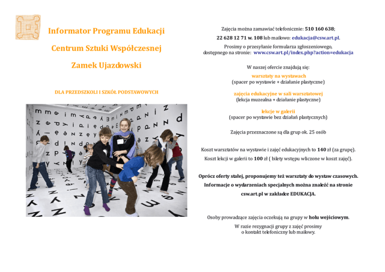 Informator Programu Edukacji Zajęcia można zamawiać telefonicznie: 510 160 638; 22 628 12 71 w. 108 lub mailowo: [email protected]. Centrum Sztuki Współczesnej Prosimy o przesyłanie formularza zgłoszeniowego, dostępnego na stronie: www.csw.art.pl/index.php?action=edukacja Zamek Ujazdowski W naszej ofercie znajdują się: warsztaty na wystawach (spacer po wystawie + działanie plastyczne) DLA PRZEDSZKOLI I SZKÓŁ PODSTAWOWYCH zajęcia edukacyjne w sali warsztatowej (lekcja muzealna + działanie plastyczne) lekcje w galerii (spacer po wystawie bez działań plastycznych) Zajęcia przeznaczone są dla grup ok. 25 osób Koszt warsztatów na wystawie i zajęć edukacyjnych to 140 zł (za grupę). Koszt lekcji w galerii to 100 zł ( bilety wstępu wliczone w koszt zajęć). Oprócz oferty stałej, proponujemy też warsztaty do wystaw czasowych. Informacje o wydarzeniach specjalnych można znaleźć na stronie csw.art.pl w zakładce EDUKACJA. Osoby prowadzące zajęcia oczekują na grupy w holu wejściowym. W razie rezygnacji grupy z zajęć prosimy o kontakt telefoniczny lub mailowy. PRZEDSZKOLA Zajęcia przeznaczone są dla dzieci, które ukończyły 3 rok życia. Czas trwania niektórych zajęć zależny jest od wieku i sposobu pracy grupy. WARSZTATY NA WYSTAWACH PIERWSZA WIZYTA (wiek: 3-5 lat, zajęcia dedykowane maluchom) Dla najmłodszych grup proponujemy animowany spacer po wystawie z mini warsztatem plastycznym. Po wystawie oprowadza pacynka, która rozmawia z dziećmi o pracach na wystawie. Czas trwania: ok. 45 minut ŁOWCY BARW (wiek: 4-6 lat) Zajęcia prowadzone są w formie zabawy, podczas której dzieci wcielają się w rolę łowców barw i kształtów. Poprzez działania ruchowe i plastyczne uczestnicy poznają rolę barw i kształtów w sztuce. Czas trwania: ok. 60-90 minut PODRÓŻ PRZEZ KRAINĘ SZTUKI (wiek: 5-6 lat, zajęcia tylko dla zerówki) Podczas zajęć dzieci udają się na niezwykłą przez krainę sztuki. Wymyślonym środkiem transportu uczestnicy podróżują przez zamkowe wystawy, poznając podstawowe formy artystyczne, takie jak: rzeźba, obraz, fotografia, instalacja, wideo. Czas trwania: ok. 60-90 minut ZAJĘCIA EDUKACYJNE DŹWIĘKOSZ (wiek: 4-6 lat) Czy obraz można usłyszeć? Czy dźwięk można zobaczyć? Podczas warsztatów dzieci tworzą dźwiękowe wizerunki przedmiotów i plastyczne przedstawienia kompozycji muzycznych, a także dowiadują się w jaki sposób różne dziedziny sztuki oddziałują na siebie. Czas trwania: ok. 60 minut ZACZAROWANY ZAMEK SZTUKI (wiek: 4-6 lat) Czy sztuka ma wiele wspólnego z czarami? Oczywiście! Podczas zajęć dzieci będą tworzyły artystyczne różdżki i wyczarowywały obrazy – nie tylko na papierze! Czas trwania: ok. 60-90 minut PAPIEROWE SZURUBURU (wiek: 5-6 lat, zajęcia tylko dla zerówki) Warsztat wprowadza dzieci w zagadnienia rzeźby. Uczestnicy tworzą z papieru niezwykłe stwory, które zamieszkują odległą planetę, potrzebującą pomocy dzieci. Jeśli w aktualnym programie CSW znajduje się odpowiednia wystawa, część zajęć prowadzona jest w salach galerii. Czas trwania: ok. 90 minut SZKOŁY PODSTAWOWE WARSZTATY NA WYSTAWACH PODRÓŻ PRZEZ KRAINĘ SZTUKI (klasy: 1-3) Podczas zajęć dzieci udają się na niezwykłą przez krainę sztuki. Wymyślonym środkiem transportu uczestnicy podróżują przez zamkowe wystawy, poznając podstawowe formy artystyczne, takie jak: rzeźba, obraz, fotografia, instalacja, wideo. Czas trwania: ok. 60-90 minut SZTUKA I JEJ INSPIRACJE (klasy: 4-6) Warsztaty plastyczne prowadzone w formie zabawy, podczas których dzieci poznają pojęcie inspiracji. Warsztaty kierują uwagę dzieci na to, co może być źródłem inspiracji dla artysty i pozwalają im lepiej zrozumieć dzieło sztuki. Czas trwania: ok. 90 minut ZAJĘCIA EDUKACYJNE PAPIEROWE SZURUBURU (tylko dla klas 1) Warsztat wprowadza dzieci w zagadnienia rzeźby. Uczestnicy tworzą z papieru niezwykłe stwory, które zamieszkują odległą planetę, potrzebującą pomocy dzieci. Jeśli w aktualnym programie CSW znajduje się odpowiednia wystawa, część zajęć prowadzona jest w salach galerii. Czas trwania: ok. 90 minut AUTOPORTRET NA WESOŁO (klasy 1-3) Podczas warsztatu dzieci uczą się o cechach portretu i autoportretu. Zajęcia połączone są z zabawą plastyczną tworzenia wspólnych portretów oraz zwariowanych autoportretów techniką kolażu. Czas trwania: ok. 90 minut PO DRUGIEJ STRONIE LUSTRA (klasy: 1-4) Jak wygląda świat, po drugiej stronie lustra? Warsztat jest zabawą plastyczną, dzięki której uczestnicy mogą zobaczyć, co dzieje się z przedmiotami z życia codziennego, które znajdą się w świecie sztuki. Czas trwania: ok. 90 minut PLANETA ZIEMIA (klasy: 3-6) Podczas warsztatu dzieci zapoznają się z podstawowymi zagadnieniami dotyczącymi sztuki ziemi, związanej z tematyką ekologii. Poznają rolę naturalnych materiałów w tworzeniu i odbiorze dzieł sztuki oraz wykonują własne kompozycje. Czas trwania: ok. 90 minut TEATRALNE CZARY-MARY (klasy: 3-6) Podczas warsztatu uczestnicy tworzą oryginalne przedstawienia posługując się technikami teatru cieni i teatru lalkowego. Wykorzystywane podczas przedstawień światło ultrafioletowe kreuje niezwykłą atmosferę. Czas trwania: ok. 90 minut MALI KREATORZY MODY (klasy: 4-6) Podczas zabawy plastycznej dzieci zajmują się projektowaniem i wykonywaniem strojów, a także dowiadują się jakie znaczenie ma strój w życiu człowieka. Czas trwania: ok. 90 minut LEKCJE W GALERII Zapraszamy również na spacery po wystawach, podczas których uczestnicy rozmawiają o sztuce z animatorem i uczą się analizy dzieła, przyglądając się najciekawszym pracom na wystawach czasowych CSW. Zajęcia kształcą umiejętności małego odbiorcy i zachęcają do kontaktu ze sztuką. Czas trwania: ok. 45 minut.