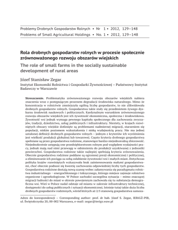 Problemy Drobnych Gospodarstw Rolnych • Nr 1 • 2012, 129–148 Problems of Small Agricultural Holdings • No. 1 • 2012, 129–148 Rola drobnych gospodarstw rolnych w procesie społecznie zrównoważonego rozwoju obszarów wiejskich The role of small farms in the socially sustainable development of rural areas Józef Stanisław Zegar Instytut Ekonomiki Rolnictwa i Gospodarki Żywnościowej – Państwowy Instytut Badawczy w Warszawie Streszczenie. Problematyka zrównoważonego rozwoju obszarów wiejskich nabiera znaczenia wraz z postępującym procesem degradacji środowiska naturalnego. Mimo że koncentracja w rolnictwie zmniejszyła ogólną liczbę gospodarstw, to nie zlikwidowała drobnych gospodarstw rolnych. Gospodarstwa takie stały się przedmiotem żywego dyskursu środowisk naukowych i politycznych. Kardynalnym warunkiem zrównoważonego rozwoju obszarów wiejskich jest ich żywotność ekonomiczna, społeczna i środowiskowa. Żywotność wsi jednak wymaga pewnego kapitału społecznego dla zachowania zwyczajów, tradycji, dziedzictwa, usług publicznych i infrastruktury. Niestety, w krajach rozwiniętych obszary wiejskie dotknięte są problemami nadmiernej migracji, starzeniem się populacji, niskim poziomem wykształcenia i niską wydajnością pracy. Nie ma jednej ustalonej definicji drobnych gospodarstw rolnych – jednym z kryteriów ich wyróżnienia jest wielkość produkcji globalnej lub towarowej. Często kryteria drobnego gospodarstwa spełniane są przez gospodarstwa rodzinne, stanowiące bardzo niejednorodną zbiorowość. Niejednokrotnie ustępują one przedsiębiorstwom rolnym pod względem wydajności pracy, jednak mają nad nimi przewagę w odniesieniu do produkcji uzyskiwanej z jednostki powierzchni. Gospodarstwa rodzinne także najlepiej spełniają kryteria zrównoważenia. Obecnie gospodarstwa rodzinne poddane są ogromnej presji ekonomicznej i politycznej, a eliminowanie ich pociąga za sobą osłabienie żywotności wsi i małych miast. Dotychczas polityka krajów rozwiniętych wykazywała brak zainteresowania małymi gospodarstwami, choć obecnie podnosi się kwestię zachowania odpowiedniej liczby tych gospodarstw. Gospodarstwa rodzinne dostają nową szansę wobec załamywania się paradygmatu rolnictwa industrialnego − energochłonnego i toksycznego, którego miejsce zajmuje rolnictwo organiczne i agroekologiczne. W Polsce zachodzi szczególna sytuacja – mimo znaczącej migracji ludności do miast w okresie powojennym zachowała się tu substancja demograficzna wsi. Wieś w Polsce nadal odstaje od miasta w zakresie infrastruktury technicznej, dostępności do usług publicznych i sytuacji ekonomicznej. Istnieje tutaj także duża liczba drobnych gospodarstw rodzinnych, wśród których aż 2/5 stanowią gospodarstwa samozaAdres do korespondencji – Corresponding author: prof. dr hab. Józef S. Zegar, IERiGŻ-PIB, ul. Świętokrzyska 20, 00-002 Warszawa, e-mail: [email protected] 130 Józef Stanisław Zegar opatrzeniowe. Część gospodarstw rodzinnych rozwija się szybko, jednak dominują gospodarstwa, które nie uzyskują zadowalających dochodów. Duże znaczenie dla rozwoju wsi miała akcesja do Unii Europejskiej, ale skuteczne spożytkowanie szans danych przez UE wymaga sprawnych instytucji, kapitału społecznego, współdziałania, edukacji i rozwijania systemu wartości. Jednym z głównych zadań polityki wobec rolnictwa jest wspieranie tworzenia i rozwoju sprawnych instytucji rolniczych i budowania kapitału społecznego. Słowa kluczowe: drobne gospodarstwa rolne, zrównoważony rozwój, gospodarstwa rodzinne, Unia Europejska, kapitał społeczny Abstract. The issue of sustainable rural development is gaining importance with the ongoing process of environmental degradation. Although the concentration in agriculture has reduced the total number of farms, it has not eliminated the small ones. They became the subject of lively debate of scientific and political community. The cardinal subject of sustainable rural development is their economic, social and environmental viability. The vitality of rural areas requires, however, a certain social capital to preserve customs, traditions, heritage, public services and infrastructure. Unfortunately, rural areas in developed countries are affected by the problems of excessive migration, aging population, low educational attainment and low labour productivity. There is no single agreed definition of small farms – one of the criteria for distinguishing them is the size of output or commodity. Often the criteria of small farms are met by family farms, which constitute a very heterog eneous group. They are often less potent than farm businesses in terms of productivity, but they have the advantage with respect to production by a single area unit. Family farms also best fulfil the sustainability criteria. Currently, family farms are subject to great economic and political pressure, and their elimination results in weakening the viability of villages and small towns. So far, the policy of developed countries showed the lack of interest in small farms, but now the question of preserving a sufficient number of these farms is raised. Family farms are now given a new chance in the situation of collapsing the paradigm of industrial agriculture which is energy-consuming and toxic, and being replaced by organic and agro-ecological farming. In Poland we may observe a specific situation – despite significant post-war migration to cities, the population structure of rural areas has been preserved. Villages in Poland still lag behind cities in the field of technical infrastructure, availability of public services and economic situation. In Poland there are also a large number of small family farms, among which as many as 2/5 represent subsistence farms. Part of family farms are growing fast, but the dominant number of the farms do not receive satisfactory income. Accession to the European Union was of gr