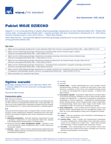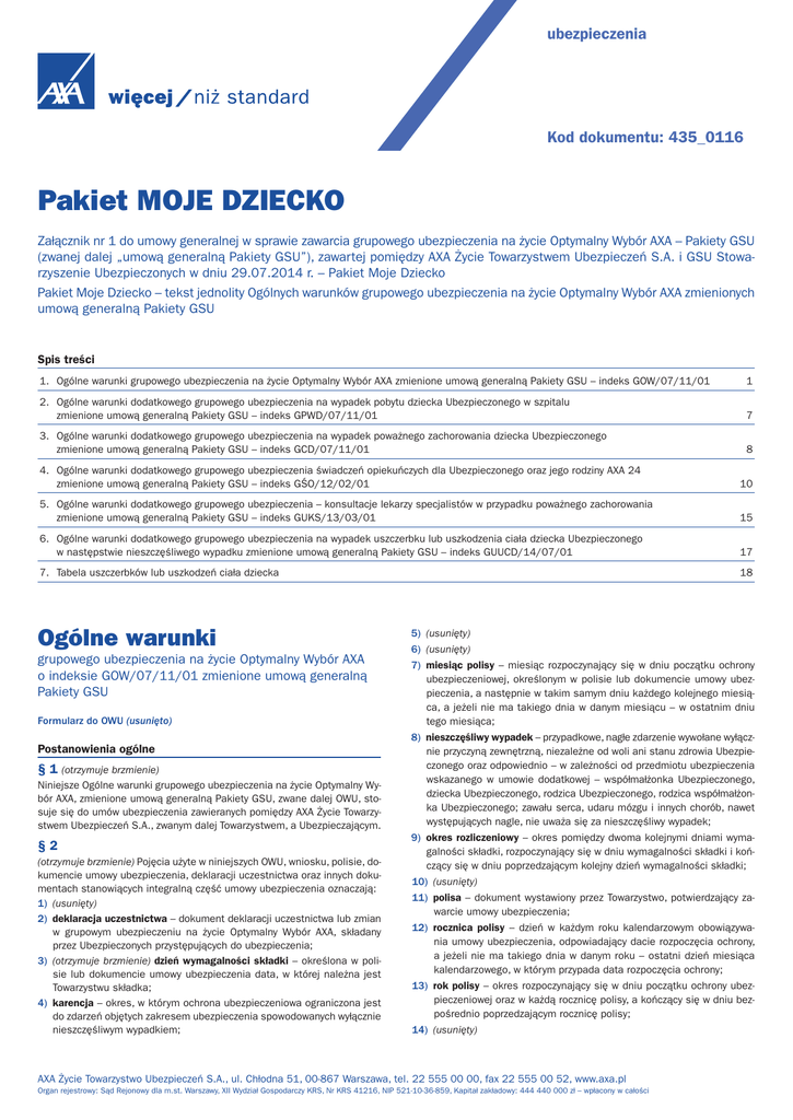ubezpieczenia Kod dokumentu: 435_0116 Pakiet MOJE DZIECKO Załącznik nr 1 do umowy generalnej w sprawie zawarcia grupowego ubezpieczenia na życie Optymalny Wybór AXA – Pakiety GSU (zwanej dalej „umową generalną Pakiety GSU”), zawartej pomiędzy AXA Życie Towarzystwem Ubezpieczeń S.A. i GSU Stowarzyszenie Ubezpieczonych w dniu 29.07.2014 r. – Pakiet Moje Dziecko Pakiet Moje Dziecko – tekst jednolity Ogólnych warunków grupowego ubezpieczenia na życie Optymalny Wybór AXA zmienionych umową generalną Pakiety GSU Spis treści 1. Ogólne warunki grupowego ubezpieczenia na życie Optymalny Wybór AXA zmienione umową generalną Pakiety GSU – indeks GOW/07/11/01 1 2.Ogólne warunki dodatkowego grupowego ubezpieczenia na wypadek pobytu dziecka Ubezpieczonego w szpitalu zmienione umową generalną Pakiety GSU – indeks GPWD/07/11/01 7 3.Ogólne warunki dodatkowego grupowego ubezpieczenia na wypadek poważnego zachorowania dziecka Ubezpieczonego zmienione umową generalną Pakiety GSU – indeks GCD/07/11/01 8 4.Ogólne warunki dodatkowego grupowego ubezpieczenia świadczeń opiekuńczych dla Ubezpieczonego oraz jego rodziny AXA 24 zmienione umową generalną Pakiety GSU – indeks GŚO/12/02/01 10 5.Ogólne warunki dodatkowego grupowego ubezpieczenia – konsultacje lekarzy specjalistów w przypadku poważnego zachorowania zmienione umową generalną Pakiety GSU – indeks GUKS/13/03/01 15 6.Ogólne warunki dodatkowego grupowego ubezpieczenia na wypadek uszczerbku lub uszkodzenia ciała dziecka Ubezpieczonego w następstwie nieszczęśliwego wypadku zmienione umową generalną Pakiety GSU – indeks GUUCD/14/07/01 17 7.Tabela uszczerbków lub uszkodzeń ciała dziecka 18 Ogólne warunki grupowego ubezpieczenia na życie Optymalny Wybór AXA o indeksie GOW/07/11/01 zmienione umową generalną Pakiety GSU Formularz do OWU (usunięto) Postanowienia ogólne § 1 (otrzymuje brzmienie) Niniejsze Ogólne warunki grupowego ubezpieczenia na życie Optymalny Wybór AXA, zmienione umową generalną Pakiety GSU, zwane dalej OWU, stosuje się do umów ubezpieczenia zawieranych pomiędzy AXA Życie Towarzystwem Ubezpieczeń S.A., zwanym dalej Towarzystwem, a Ubezpieczającym. §2 (otrzymuje brzmienie) Pojęcia użyte w niniejszych OWU, wniosku, polisie, dokumencie umowy ubezpieczenia, deklaracji uczestnictwa oraz innych dokumentach stanowiących integralną część umowy ubezpieczenia oznaczają: 1) (usunięty) 2) deklaracja uczestnictwa – dokument deklaracji uczestnictwa lub zmian w grupowym ubezpieczeniu na życie Optymalny Wybór AXA, składany przez Ubezpieczonych przystępujących do ubezpieczenia; 3) (otrzymuje brzmienie) dzień wymagalności składki – określona w polisie lub dokumencie umowy ubezpieczenia data, w której należna jest Towarzystwu składka; 4) karencja – okres, w którym ochrona ubezpieczeniowa ograniczona jest do zdarzeń objętych zakresem ubezpieczenia spowodowanych wyłącznie nieszczęśliwym wypadkiem; 5) (usunięty) 6) (usunięty) 7) miesiąc polisy – miesiąc rozpoczynający się w dniu początku ochrony ubezpieczeniowej, określonym w polisie lub dokumencie umowy ubezpieczenia, a następnie w takim samym dniu każdego kolejnego miesiąca, a jeżeli nie ma takiego dnia w danym miesiącu – w ostatnim dniu tego miesiąca; 8) nieszczęśliwy wypadek – przypadkowe, nagłe zdarzenie wywołane wyłącznie przyczyną zewnętrzną, niezależne od woli ani stanu zdrowia Ubezpieczonego oraz odpowiednio – w zależności od przedmiotu ubezpieczenia wskazanego w umowie dodatkowej – współmałżonka Ubezpieczonego, dziecka Ubezpieczonego, rodzica Ubezpieczonego, rodzica współmałżonka Ubezpieczonego; zawału serca, udaru mózgu i innych chorób, nawet występujących nagle, nie uważa się za nieszczęśliwy wypadek; 9) okres rozliczeniowy – okres pomiędzy dwoma kolejnymi dniami wymagalności składki, rozpoczynający się w dniu wymagalności składki i kończący się w dniu poprzedzającym kolejny dzień wymagalności składki; 10) (usunięty) 11) polisa – dokument wystawiony przez Towarzystwo, potwierdzający zawarcie umowy ubezpieczenia; 12) rocznica polisy – dzień w każdym roku kalendarzowym obowiązywania umowy ubezpieczenia, odpowiadający dacie rozpoczęcia ochrony, a jeżeli nie ma takiego dnia w danym roku – ostatni dzień miesiąca kalendarzowego, w którym przypada data rozpoczęcia ochrony; 13) rok polisy – okres rozpoczynający się w dniu początku ochrony ubezpieczeniowej oraz w każdą rocznicę polisy, a kończący się w dniu bezpośrednio poprzedzającym rocznicę polisy; 14) (usunięty) AXA Życie Towarzystwo Ubezpieczeń S.A., ul. Chłodna 51, 00-867 Warszawa, tel. 22 555 00 00, fax 22 555 00 52, www.axa.pl Organ rejestrowy: Sąd Rejonowy dla m.st. Warszawy, XII Wydział Gospodarczy KRS, Nr KRS 41216, NIP 521-10-36-859, Kapitał zakładowy: 444 440 000 zł – wpłacony w całości 15) składka podstawowa indywidualna – kwota określona w polisie lub dokumencie umowy ubezpieczenia, należna Towarzystwu z tytułu udzielania danemu Ubezpieczonemu ochrony ubezpieczeniowej na podstawie umowy podstawowej; 16) (usunięty) 17) składka dodatkowa indywidualna – kwota określona w polisie lub dokumencie umowy ubezpieczenia, należna Towarzystwu z tytułu udzielania danemu Ubezpieczonemu ochrony ubezpieczeniowej na podstawie umowy dodatkowej; 18) (usunięty) 19) (otrzymuje brzmienie) składka indywidualna – kwota określona w polisie lub dokumencie umowy ubezpieczenia, stanowiąca sumę składki podstawowej indywidualnej i składek dodatkowych indywidualnych; 20) (usunięty) 21) (usunięty) 22) (otrzymuje brzmienie) składka – suma składek indywidualnych należnych za wszystkich Ubezpieczonych; 23) (usunięty) 24) suma ubezpieczenia – kwota określona w polisie lub dokumencie umowy ubezpieczenia, będąca podstawą do ustalenia wysokości świadczenia w przypadku zajścia zdarzenia ubezpieczeniowego objętego z