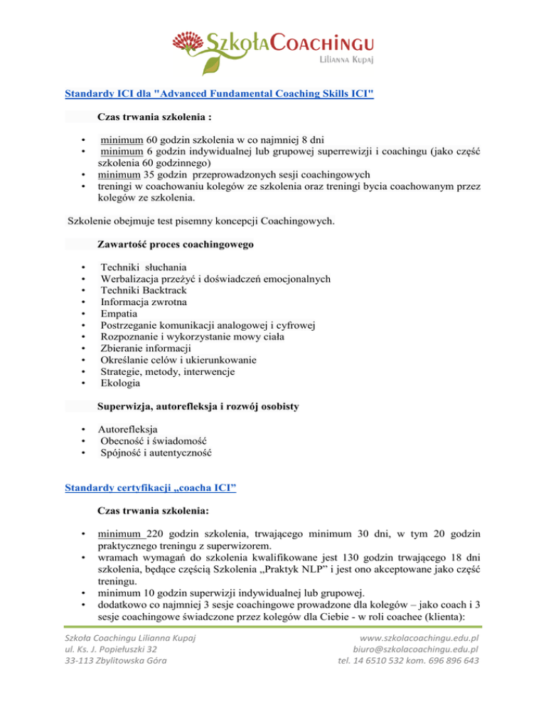 Standardy ICI dla "Advanced Fundamental Coaching Skills ICI" Czas trwania szkolenia : • • • • minimum 60 godzin szkolenia w co najmniej 8 dni minimum 6 godzin indywidualnej lub grupowej superrewizji i coachingu (jako część szkolenia 60 godzinnego) minimum 35 godzin przeprowadzonych sesji coachingowych treningi w coachowaniu kolegów ze szkolenia oraz treningi bycia coachowanym przez kolegów ze szkolenia. Szkolenie obejmuje test pisemny koncepcji Coachingowych. Zawartość proces coachingowego • • • • • • • • • • • Techniki słuchania Werbalizacja przeżyć i doświadczeń emocjonalnych Techniki Backtrack Informacja zwrotna Empatia Postrzeganie komunikacji analogowej i cyfrowej Rozpoznanie i wykorzystanie mowy ciała Zbieranie informacji Określanie celów i ukierunkowanie Strategie, metody, interwencje Ekologia Superwizja, autorefleksja i rozwój osobisty • • • Autorefleksja Obecność i świadomość Spójność i autentyczność Standardy certyfikacji „coacha ICI” Czas trwania szkolenia: • • • • minimum 220 godzin szkolenia, trwającego minimum 30 dni, w tym 20 godzin praktycznego treningu z superwizorem. wramach wymagań do szkolenia kwalifikowane jest 130 godzin trwającego 18 dni szkolenia, będące częścią Szkolenia „Praktyk NLP” i jest ono akceptowane jako część treningu. minimum 10 godzin superwizji indywidualnej lub grupowej. dodatkowo co najmniej 3 sesje coachingowe prowadzone dla kolegów – jako coach i 3 sesje coachingowe świadczone przez kolegów dla Ciebie - w roli coachee (klienta): Szkoła Coachingu Lilianna Kupaj ul. Ks. J. Popiełuszki 32 33-113 Zbylitowska Góra www.szkolacoachingu.edu.pl [email protected] tel. 14 6510 532 kom. 696 896 643 a) tematem pierwszej sesji coachingu jest wyjaśnienie i zawarcie kontraktu z klientem, b) przedmiotem drugiej sesji jest proces coachingowy, procedury interwencji i wykorzystanie najlepszych praktyk, c) trzecia sesja jest domknięciem procesu, konkretne wnioski do samodzielnego zarządzania i oceny. • • dodatkowo co najmniej 3 sesje coachingu prowadzone przez zewnętrznego coacha. dodatkowo co najmniej 3 sesje coachingu dla klienta, z obszaru, w którym coach posiada doświadczenie praktyczne. a) tematem pierwszej sesji coachingu jest wyjaśnienie i zawarcie kontraktu z klientem, b) przedmiotem drugiej sesji jest proces coachingowy, procedury interwencji i wykorzystanie najlepszych praktyk, c) trzecia sesja jest domknięciem procesu, konkretne wnioski do samodzielnego zarządzania i oceny. • • • 80 godzin przeprowadzonych sesji coachingowych dodatkowo odpowiednie refleksje, studium przypadku i koncepcja coachingu w formie pisemnej Minimalny wiek w momencie certyfikacji: 25 lat Szkolenie obejmuje opracowanie koncepcji Coacha. Koncepcja Coacha: • • • • • • profil coacha obszar kompetencji koncepcję procesu coachingowego ocena / rozeznanie rynku zasady coachingu osobista sieć kontaktów, zaawansowane szkolenie, superwizja i samoocena Zawartość procesu coachingowego • • • • • • pozyskiwanie klientów pozycjonowanie coacha bezpieczeństwo i jego rola (zaufanie) pierwsza sesja (wyjaśnienie dotyczące rezultatów coachingu, uzgodnienia kontraktu psychologicznego) odpowiedzialność coacha i przepisy prawne (etyka) refleksja nad wyjaśnienie relacji pomiędzy coachem i coachee (coachowaną osobą o świadomości coachingowej). Szkoła Coachingu Lilianna Kupaj ul. Ks. J. Popiełuszki 32 33-113 Zbylitowska Góra www.szkolacoachingu.edu.pl [email protected] tel. 14 6510 532 kom. 696 896 643 • • • • • • • • • • • • • • • • • • • • • • • • • • • refleksji nad wyjaśnienie relacji pomiędzy klientem (osoba o znikomej świadomości coachingowej ) i coachem zebranie informacji i czytelne wyjaśnienie rezultatów zarzadzanie celami klienta strategie, metody, interwencje (narzędzia) ekologia przeniesienie nabytych umiejętności do praktyki coachingowej użycie systemów reprezentacji w ustalaniu celów informacja zwrotna i korekta struktura pojedynczej sesji i całego procesu zastosowanie poziomów neurologicznych Dieltsa w procesie coachingowym elastyczność w sytuacjach zablokowania rozpoznanie ograniczających przesłanek i ograniczających przekonań autorefleksja coacha: o postawa coacha o zarządzania stanem wewnętrznym coacha o profil coacha o obszar kompetencji o koncepcja coacha o granice coachingu (gdzie zaczyna się a gdzie kończy coaching) o rozpoznawania i tworzenia relacji coachingowych o różnice pomiędzy coachingiem a poradnictwem czy terapią elementy coachingu oparty o trening Praktyk NLP elementy coachingu z innych szkół psychologicznych (psychologia humanistyczna, psychologii poznawczej, psychologii zorientowanej na proces) elastyczność w interwencjach przekazywanie wiedzy psychologicznej (aktywne mechanizmy sesji coachingowych, wewnętrzna postawa coacha, wyjaśniania, metafory, uczucia, zasoby, cele, samoocena) psychologia społeczna psychologia kliniczna Coaching konfliktu tolerancja dwuznaczności myślenie systemowe i ocena ukryte porządki i uwikłania systemowe zjawisko emocjonalnego rezonansu język jako instrument ocena i kontrola sukcesu przygotowanie własnego coachingu i zamknięcie Podstawowa wiedza w zarządzaniu konfliktem • • teoria konfliktu praca z konfliktami Szkoła Coachingu Lilianna Kupaj ul. Ks. J. Popiełuszki 32 33-113 Zbylitowska Góra www.szkolacoachingu.edu.pl [email protected] tel. 14 6510 532 kom. 696 896 643 • • • • • • potencjał konfliktu koszty konfliktów strategie rozwiązywania konfliktów zarządzanie kryzysowe programy redukcji stresu, zmiana perspektywy, zasady aktywnego postępowania z silnymi emocjami, rozpoznawanie efektów interakcji i sprzężenia zwrotnego... Coaching konfliktu zespołów, grup dwu-osobowych, liderów Kompetencje z zakresu metodyki pracy coachingowej oraz integracja wiedzy z zakresu mode